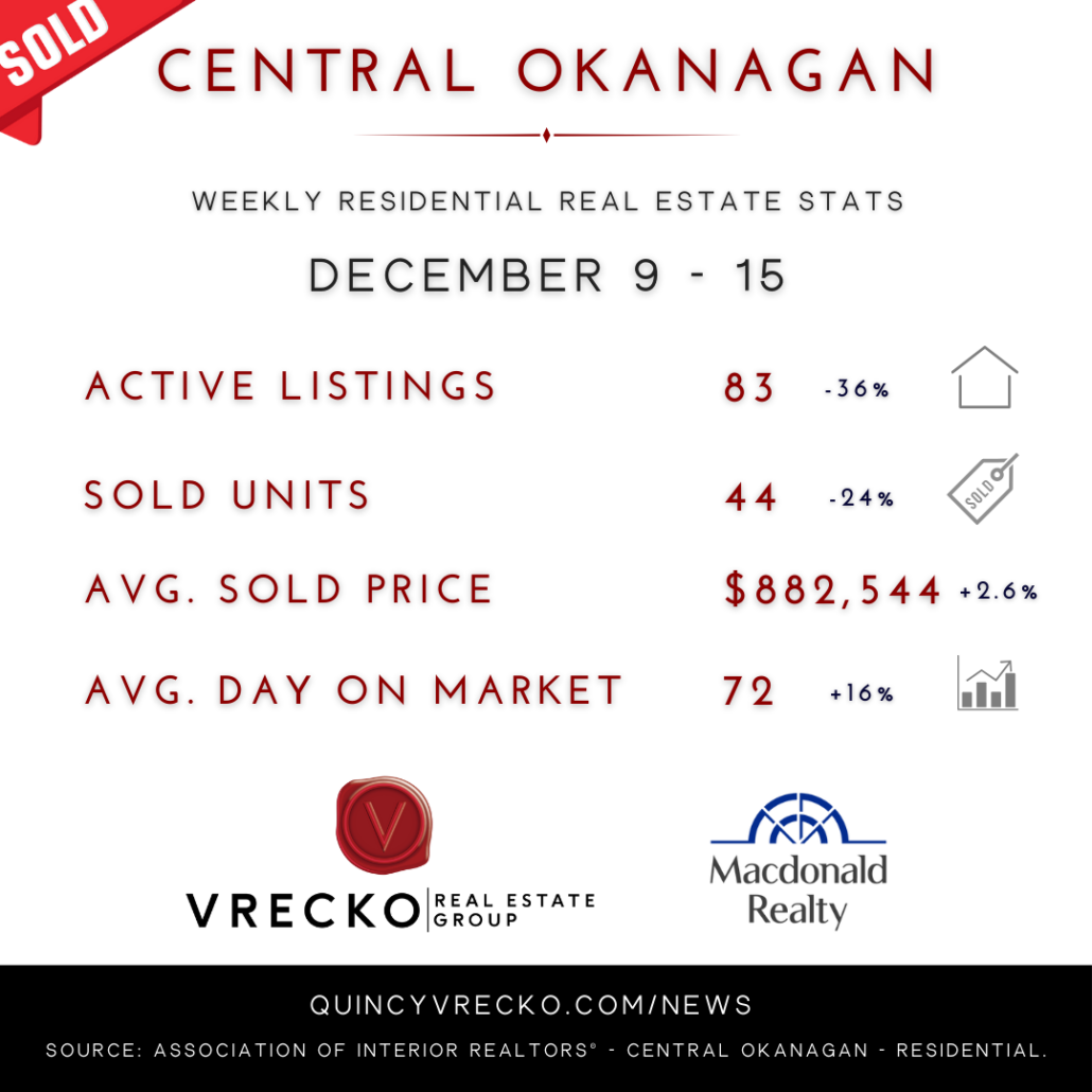 Central Okanagan | Residential Real Estate Stats | Dec 9-15