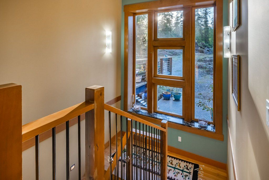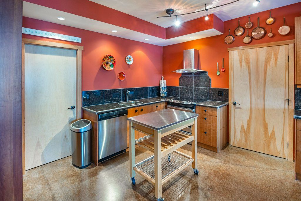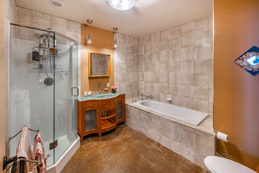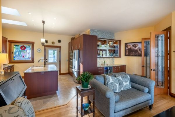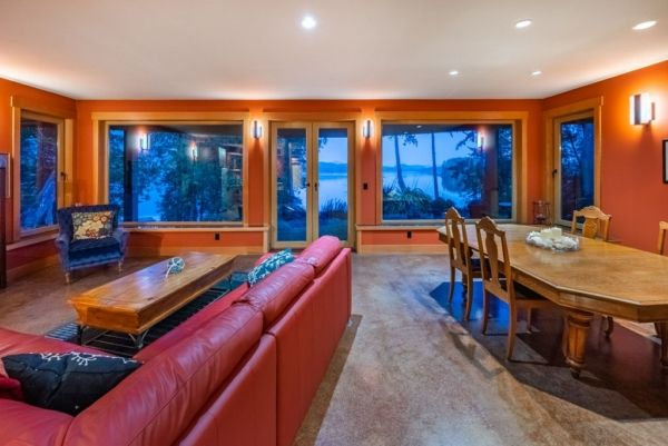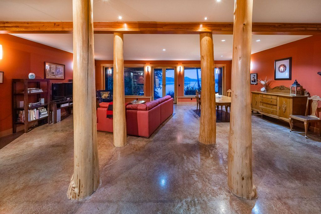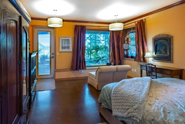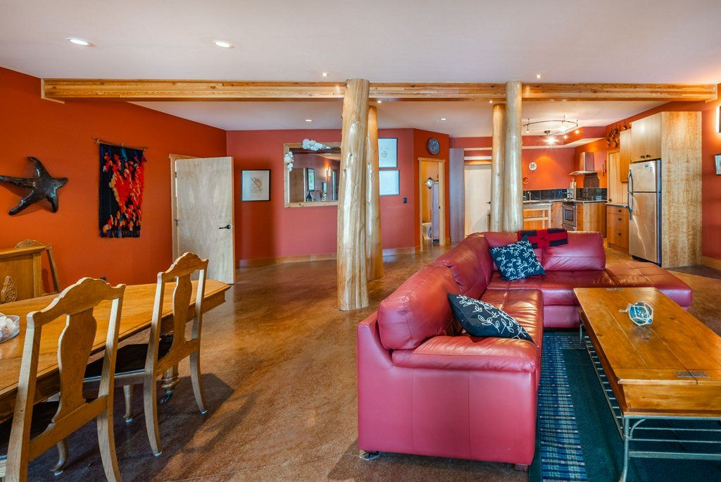 The lower walkout level of the main house features 9ft ceilings, and large picture windows with great views of the ocean. Heated by radiant floor heating throughout, the concrete floors are complemented by the wood pillar features in the center of the room. The spacious main area has a full kitchen open to the large recreational room, a perfect space for parties. There are also 2 bedrooms and a full bathroom on this level.