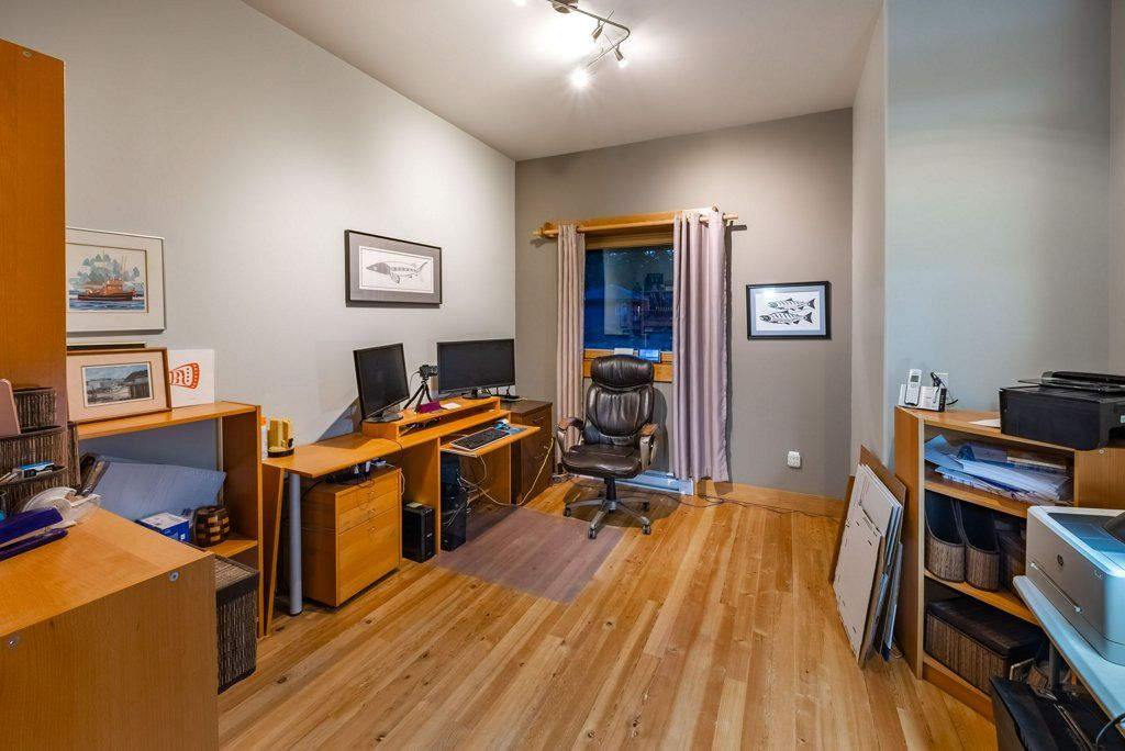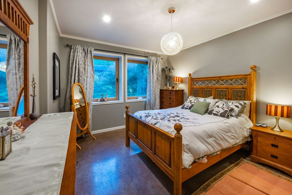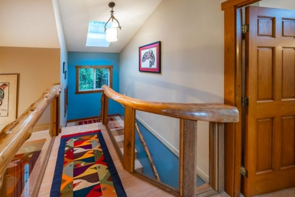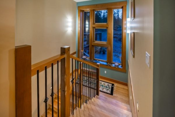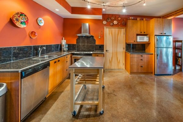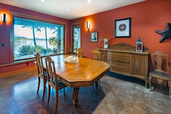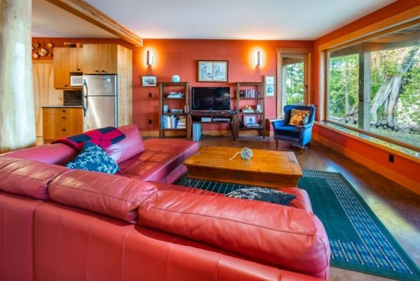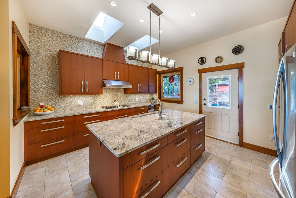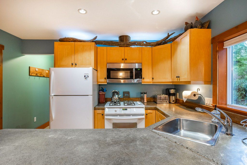 The lower walkout level of the main house features 9ft ceilings, and large picture windows with great views of the ocean. Heated by radiant floor heating throughout, the concrete floors are complemented by the wood pillar features in the center of the room. The spacious main area has a full kitchen open to the large recreational room, a perfect space for parties. There are also 2 bedrooms and a full bathroom on this level.