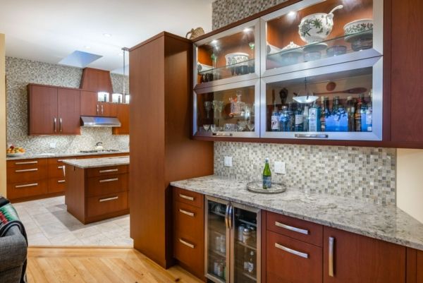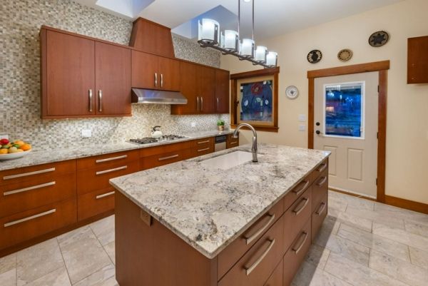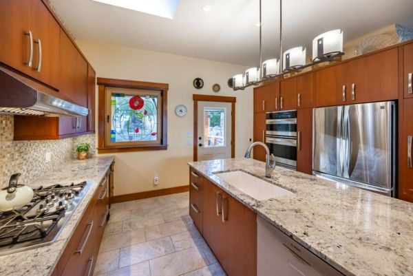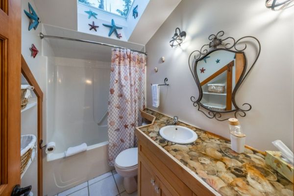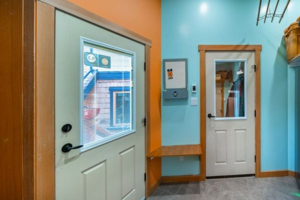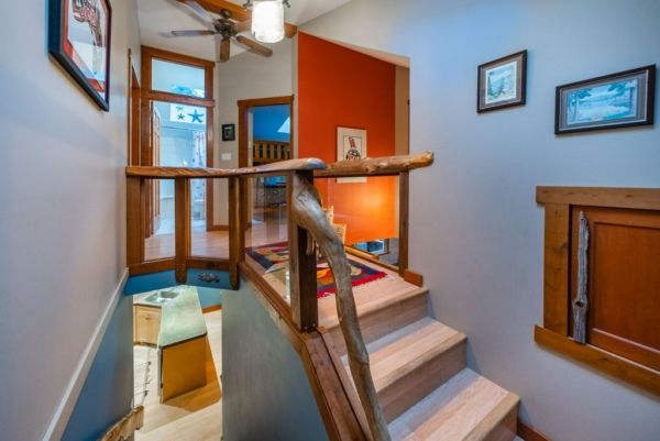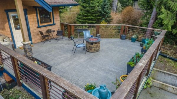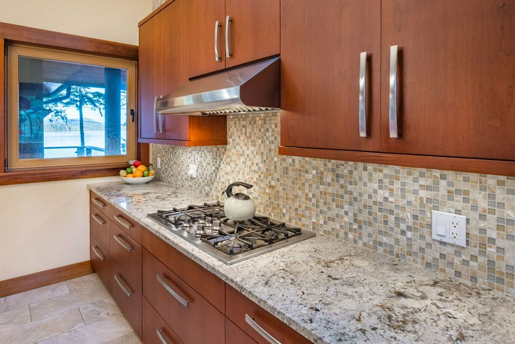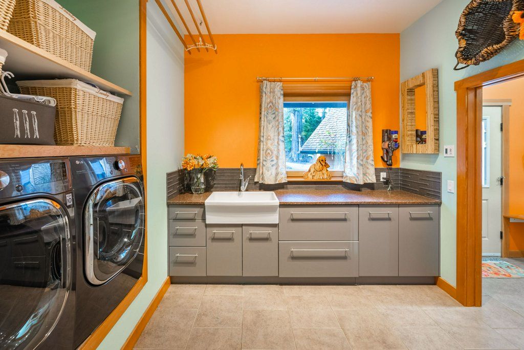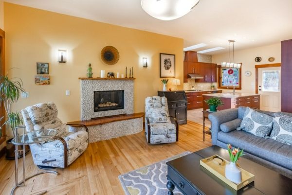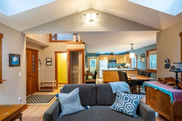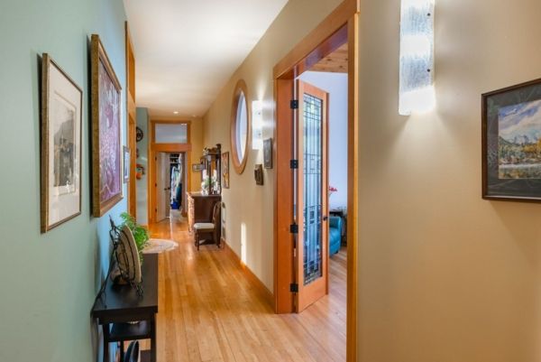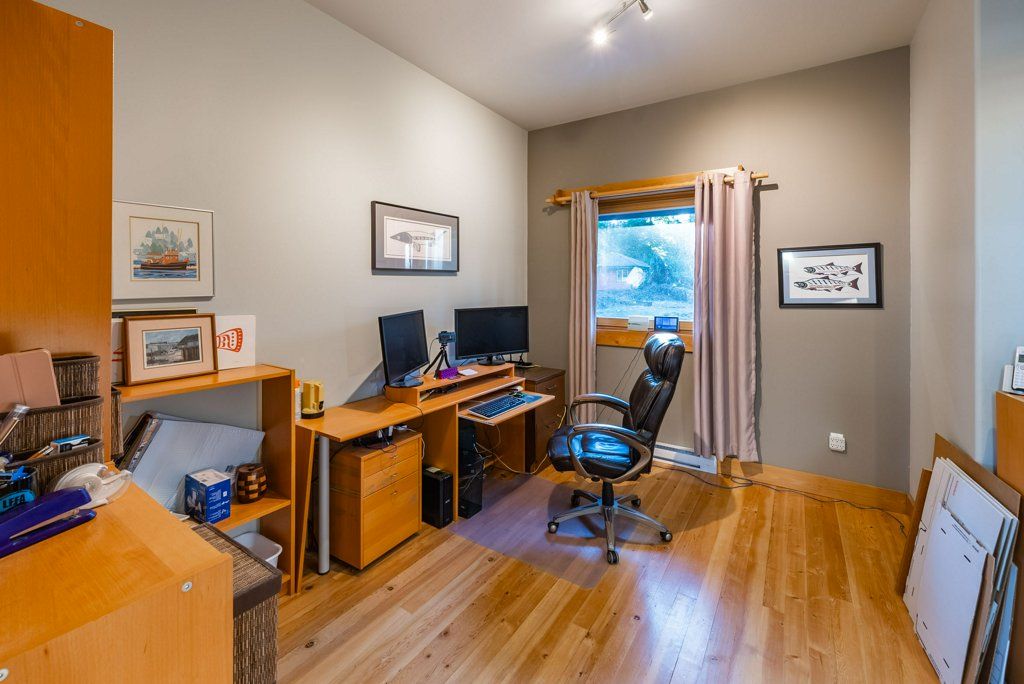 The lower walkout level of the main house features 9ft ceilings, and large picture windows with great views of the ocean. Heated by radiant floor heating throughout, the concrete floors are complemented by the wood pillar features in the center of the room. The spacious main area has a full kitchen open to the large recreational room, a perfect space for parties. There are also 2 bedrooms and a full bathroom on this level.