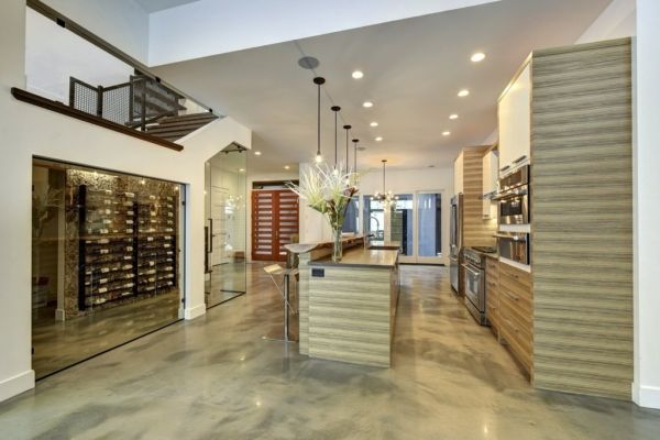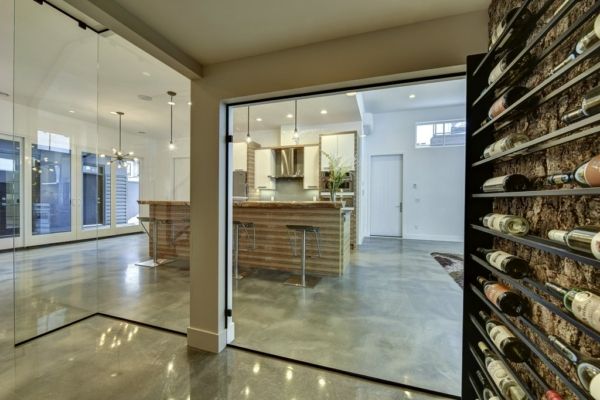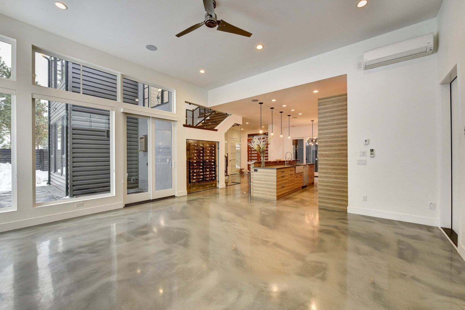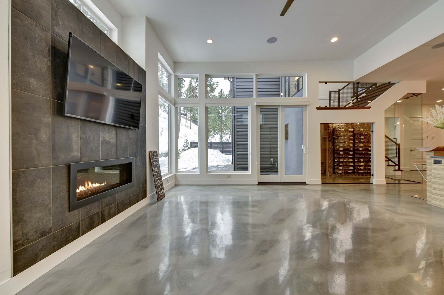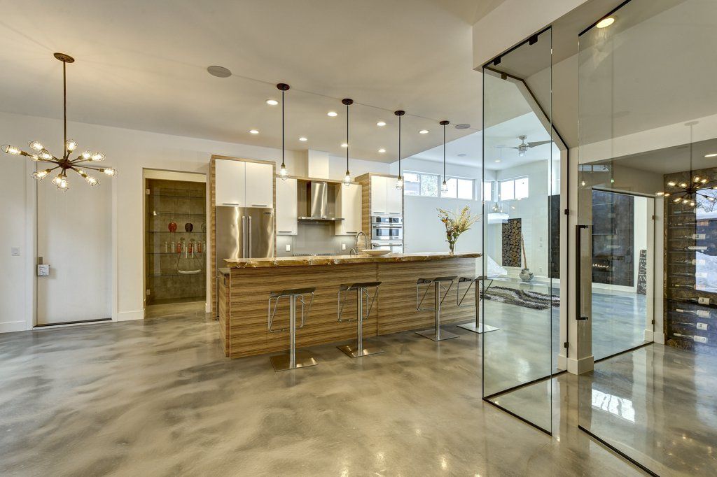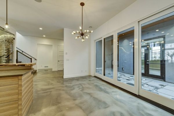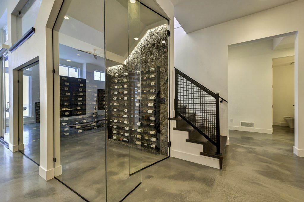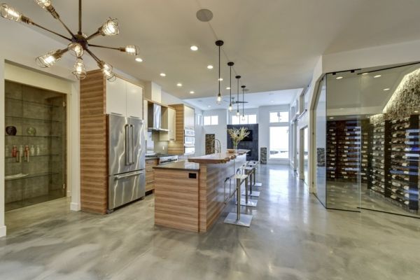 The main level of this luxury home opens to the spacious foyer with a show-stopping temperature-controlled wine cellar with a glass wall and cork detailing.  The one-of-a-kind gourmet kitchen features a connecting butler’s pantry and a climate-controlled glass cooler with concrete walls. The finishing details of the kitchen give a sleek modern look that features a live edge maple countertop, custom cabinetry, and Jen-Air stainless steel appliances. Walk to the sun-drenched living space with transom windows and a 12ft ceiling that compliments the stunning floor plan. Heated polished concrete floors run throughout this open-concept plan.  The Master Suite on the main floor is a true retreat with a double-sided fireplace, free-standing soaker tub & luxurious glass steam shower.
