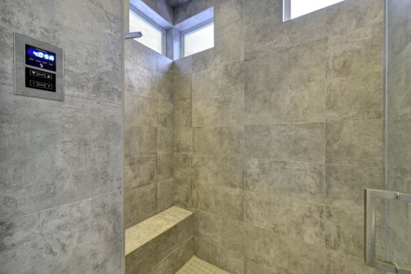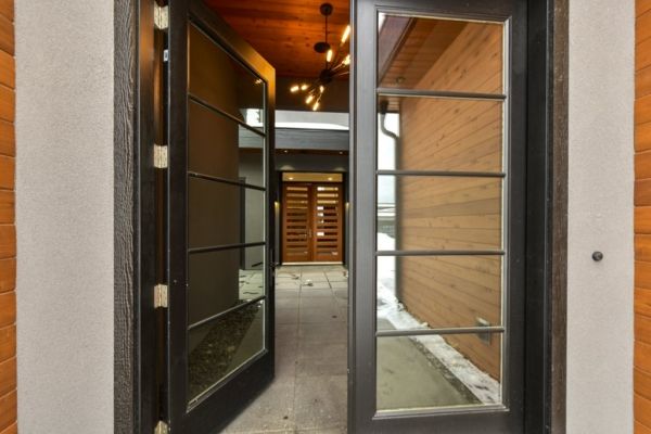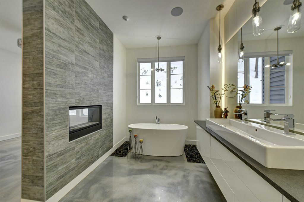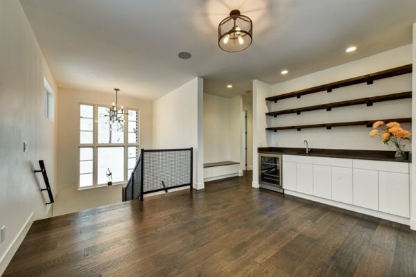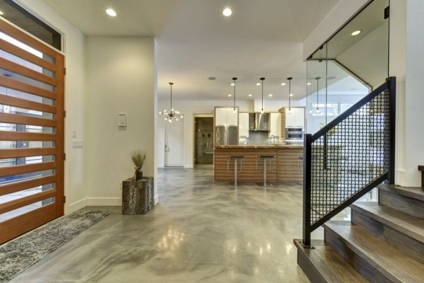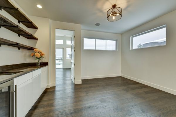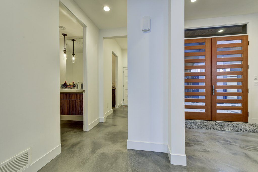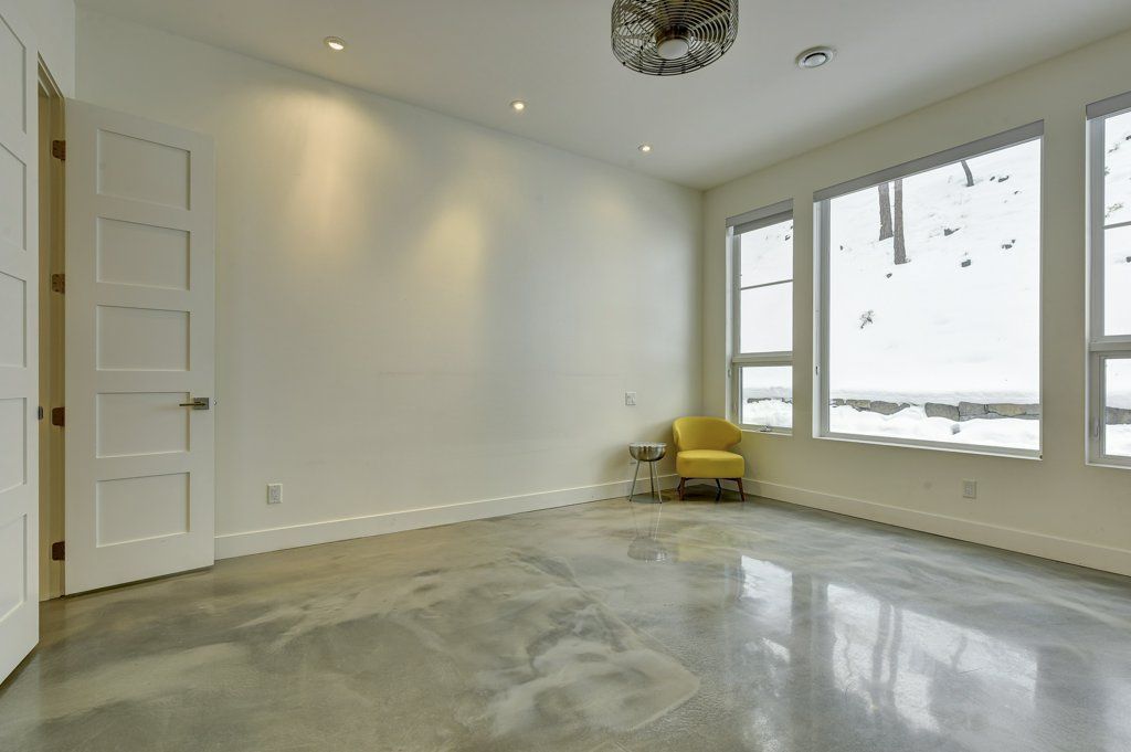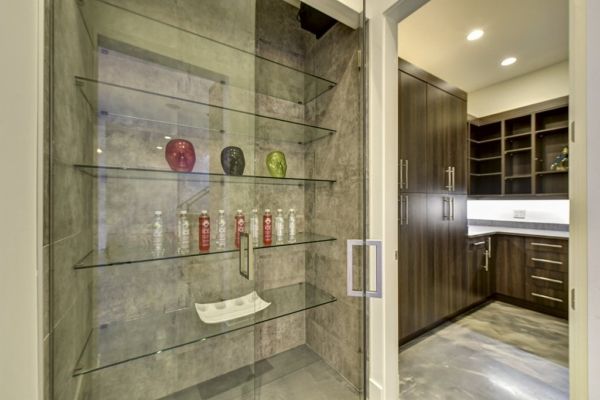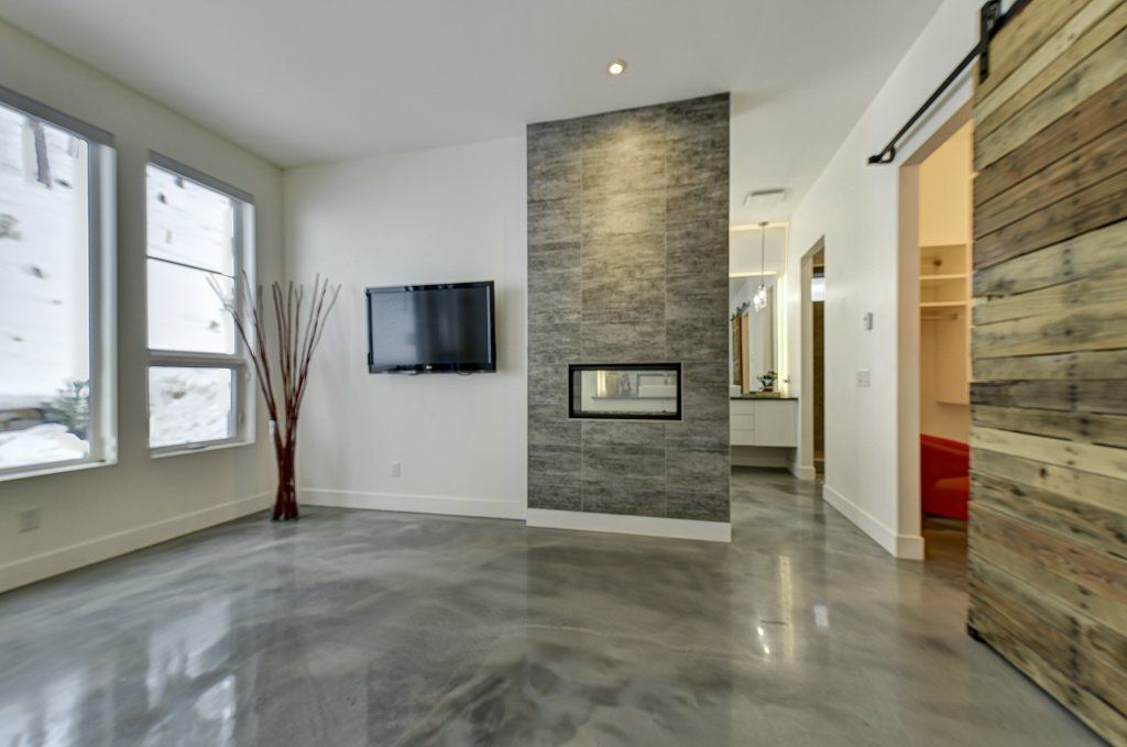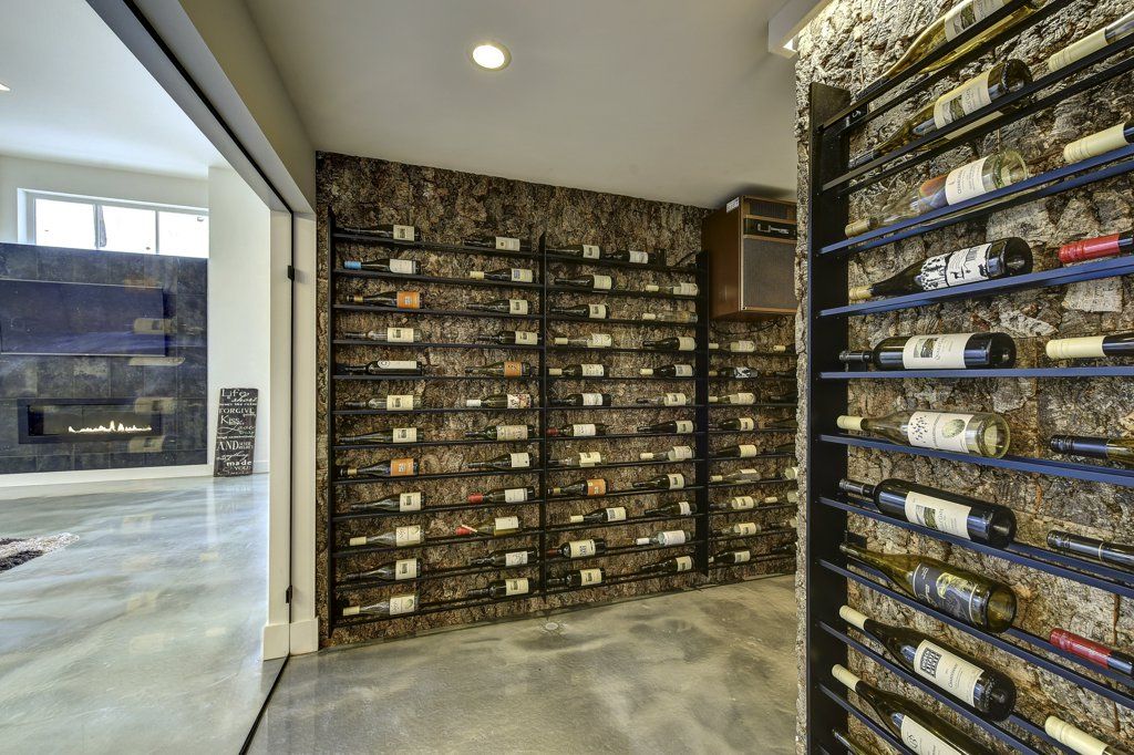 The main level of this luxury home opens to the spacious foyer with a show-stopping temperature-controlled wine cellar with a glass wall and cork detailing.  The one-of-a-kind gourmet kitchen features a connecting butler’s pantry and a climate-controlled glass cooler with concrete walls. The finishing details of the kitchen give a sleek modern look that features a live edge maple countertop, custom cabinetry, and Jen-Air stainless steel appliances. Walk to the sun-drenched living space with transom windows and a 12ft ceiling that compliments the stunning floor plan. Heated polished concrete floors run throughout this open-concept plan.  The Master Suite on the main floor is a true retreat with a double-sided fireplace, free-standing soaker tub & luxurious glass steam shower.