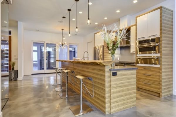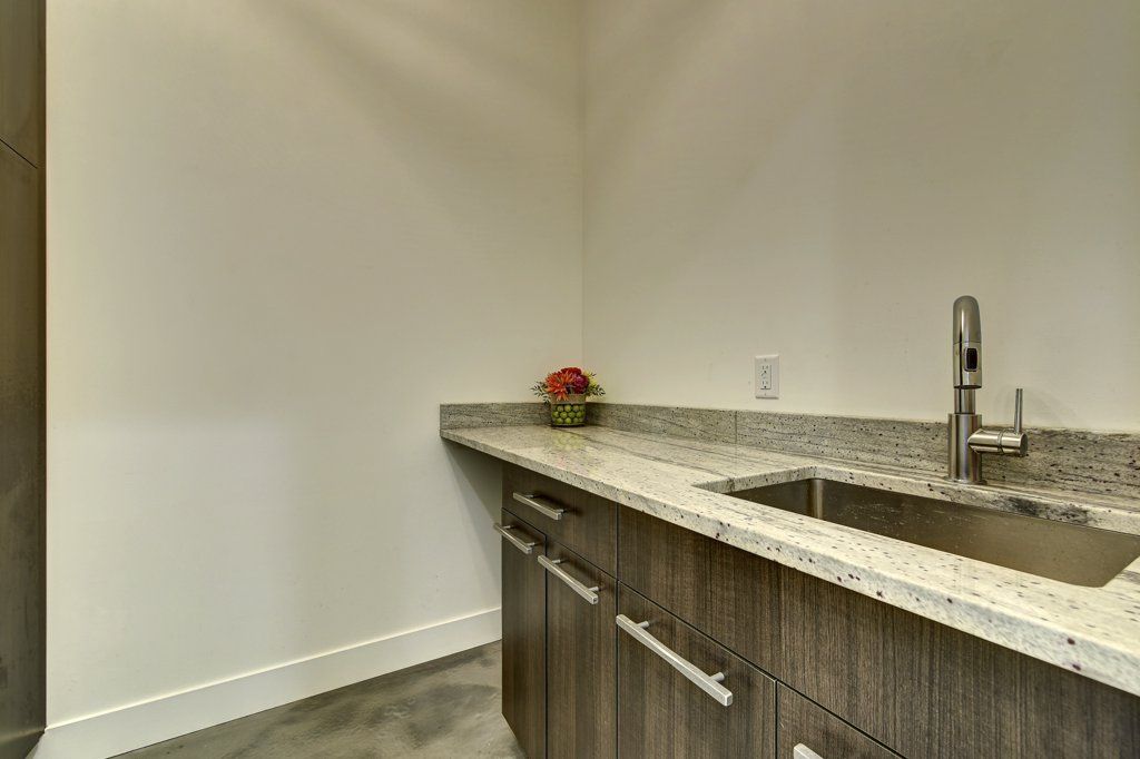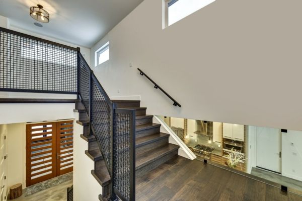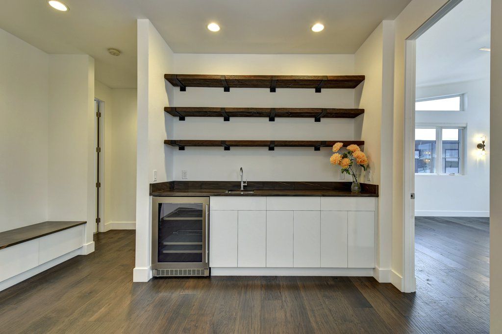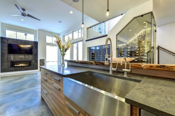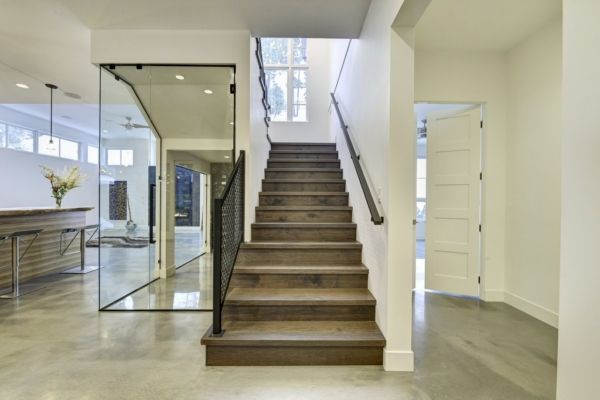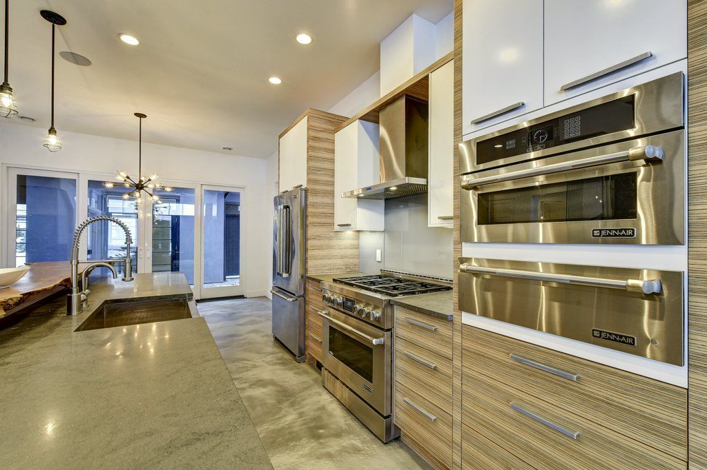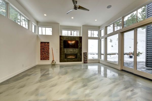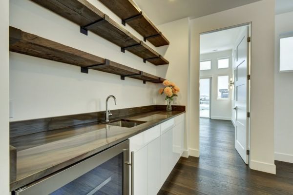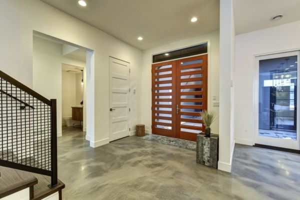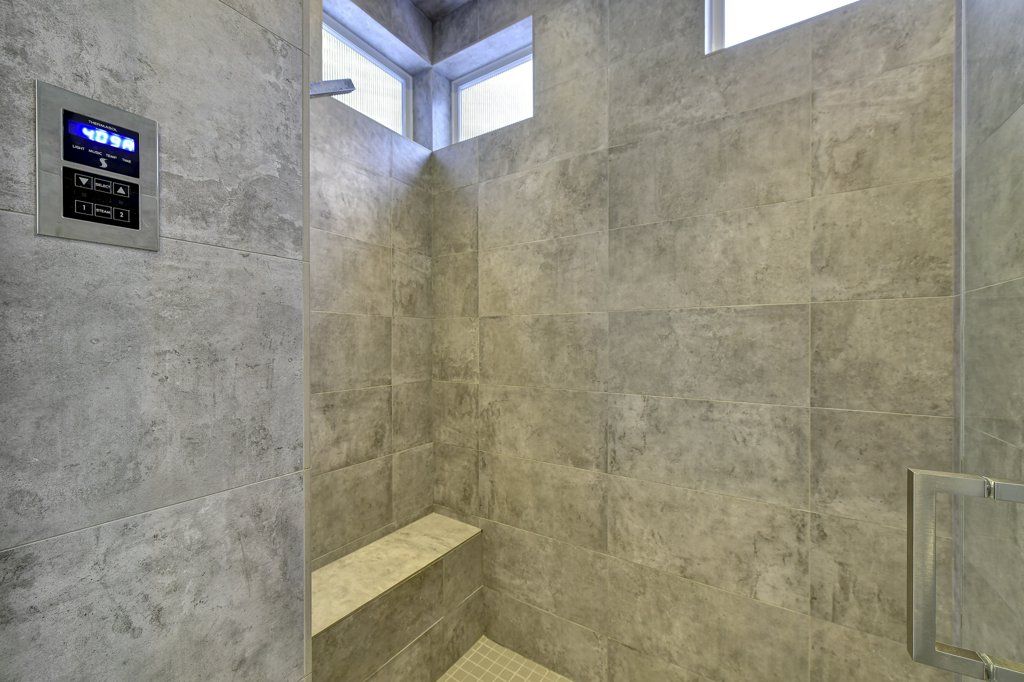 The main level of this luxury home opens to the spacious foyer with a show-stopping temperature-controlled wine cellar with a glass wall and cork detailing.  The one-of-a-kind gourmet kitchen features a connecting butler’s pantry and a climate-controlled glass cooler with concrete walls. The finishing details of the kitchen give a sleek modern look that features a live edge maple countertop, custom cabinetry, and Jen-Air stainless steel appliances. Walk to the sun-drenched living space with transom windows and a 12ft ceiling that compliments the stunning floor plan. Heated polished concrete floors run throughout this open-concept plan.  The Master Suite on the main floor is a true retreat with a double-sided fireplace, free-standing soaker tub & luxurious glass steam shower.