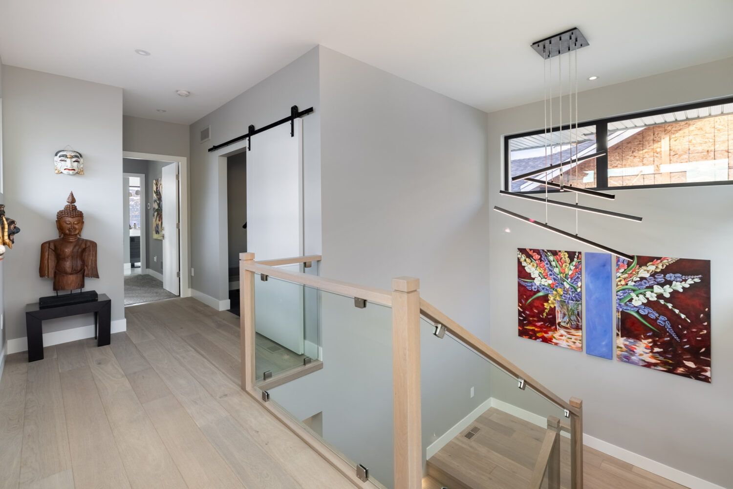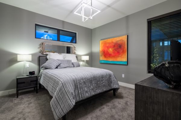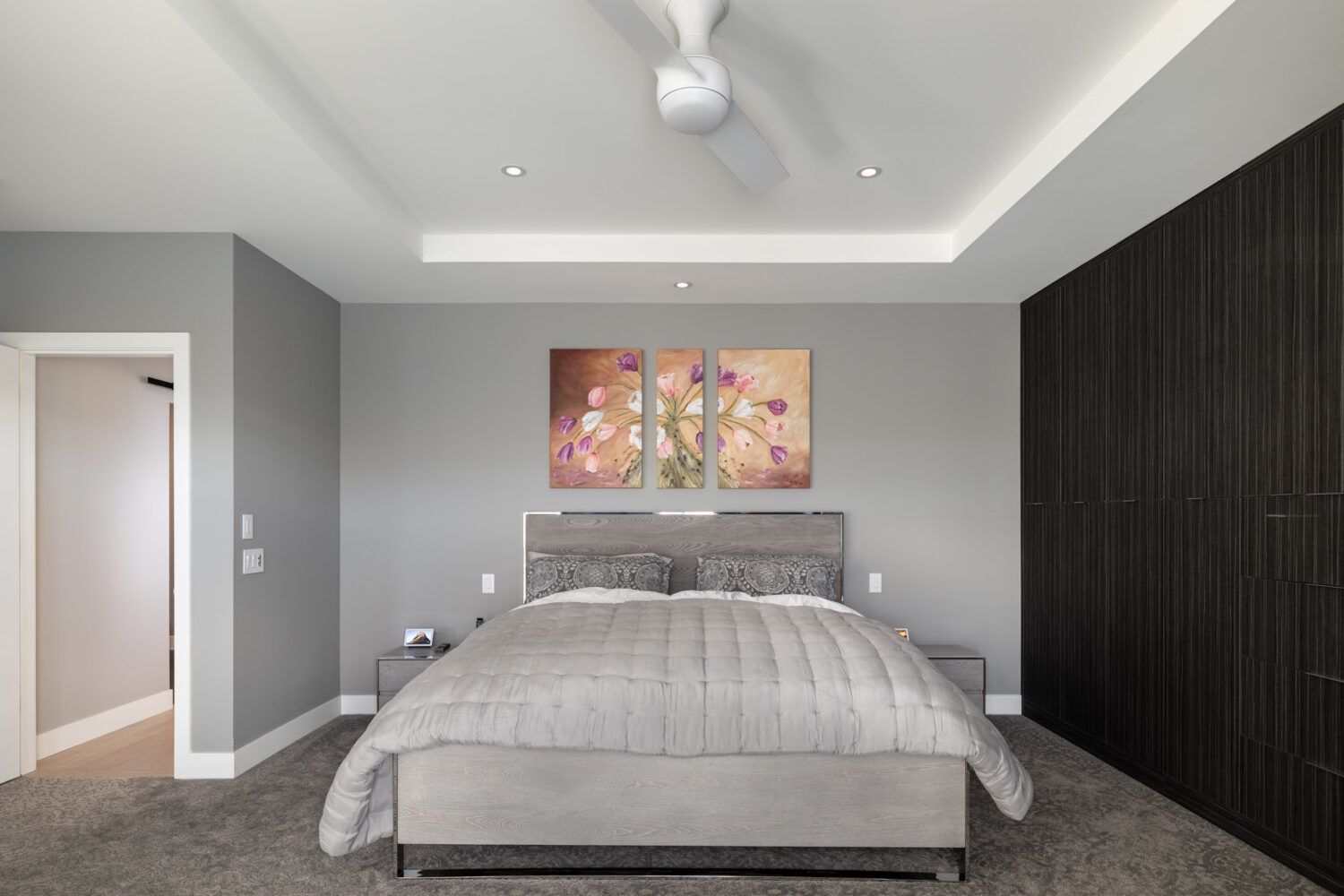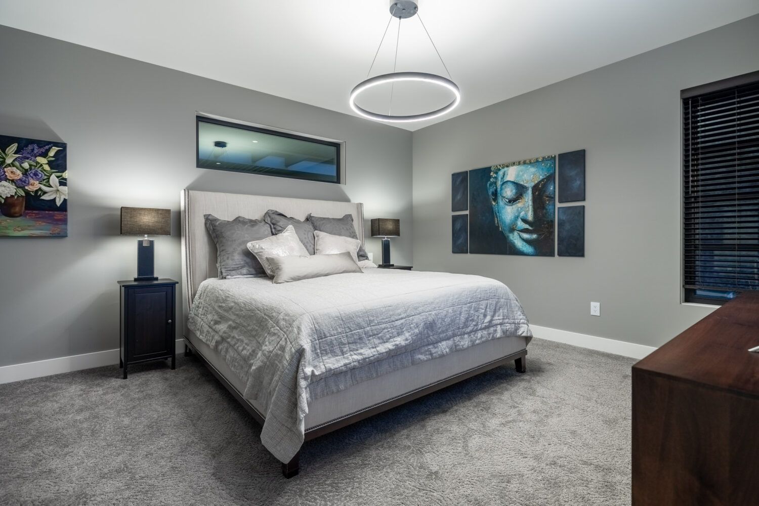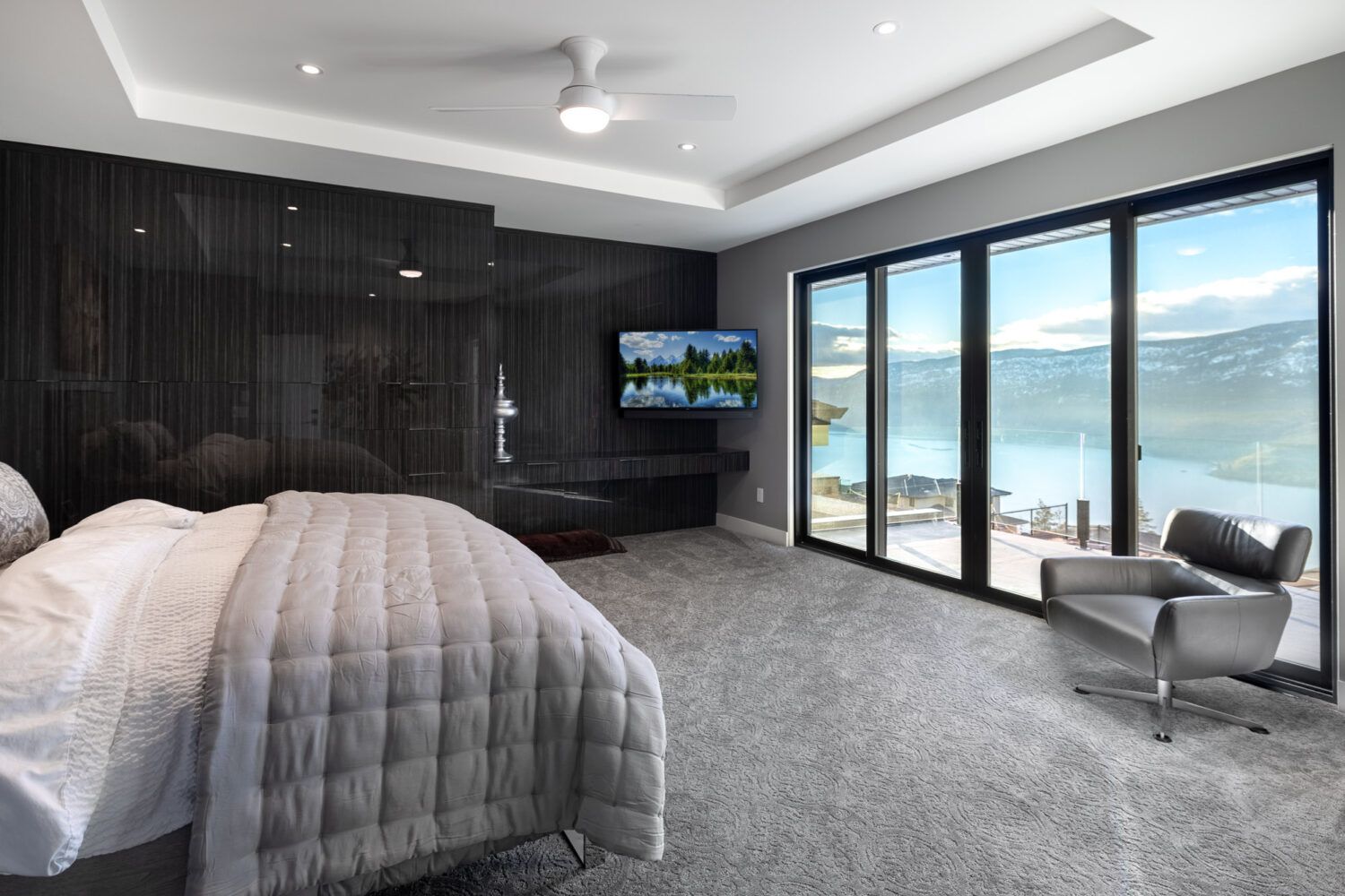 The north wing of the award-winning home leads upstairs to the master living space. This area features a home gym and a large master bedroom with a wall of custom Brillante built-in cabinetry. Wake up to the panoramic lake views and enjoy a coffee on the upper deck. The master suite is complete with a large walk-in closet and a stunning master ensuite bathroom with a large walk-in shower and floating soaker tub under the picture window. A perfect place to retreat!