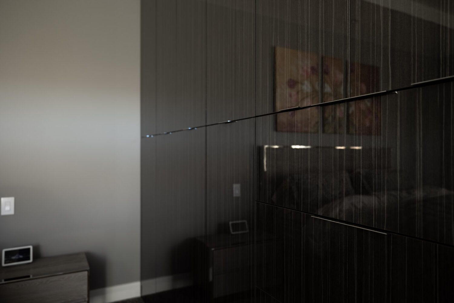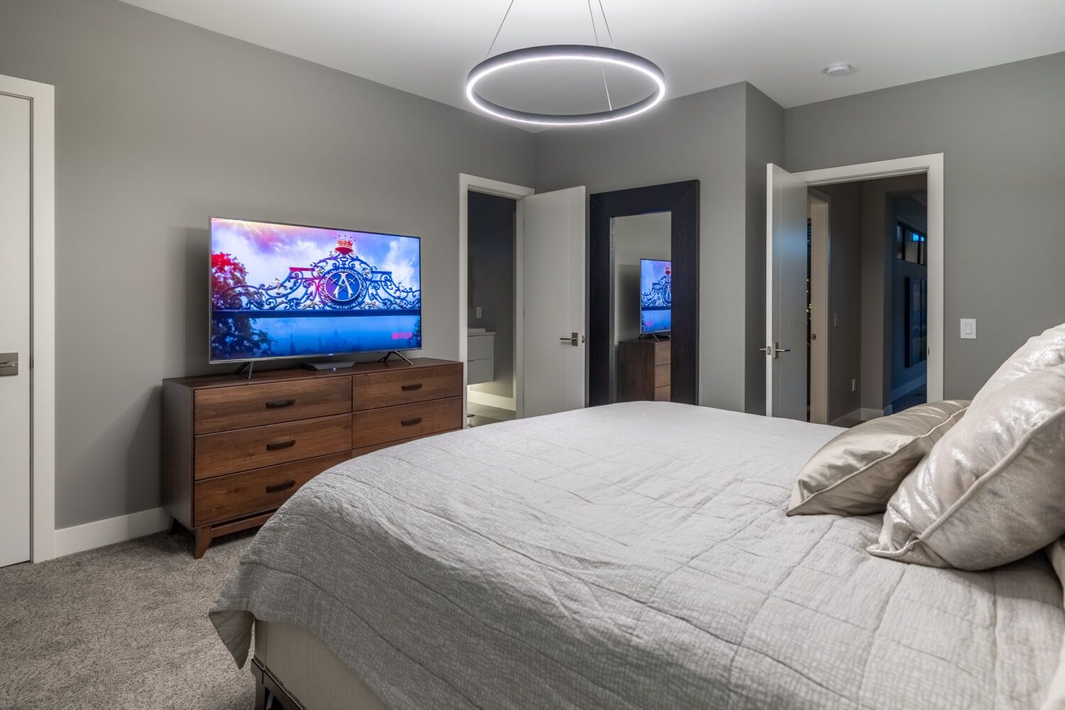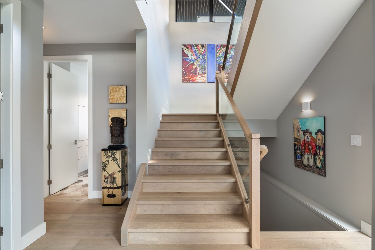 The north wing of the award-winning home leads upstairs to the master living space. This area features a home gym and a large master bedroom with a wall of custom Brillante built-in cabinetry. Wake up to the panoramic lake views and enjoy a coffee on the upper deck. The master suite is complete with a large walk-in closet and a stunning master ensuite bathroom with a large walk-in shower and floating soaker tub under the picture window. A perfect place to retreat!