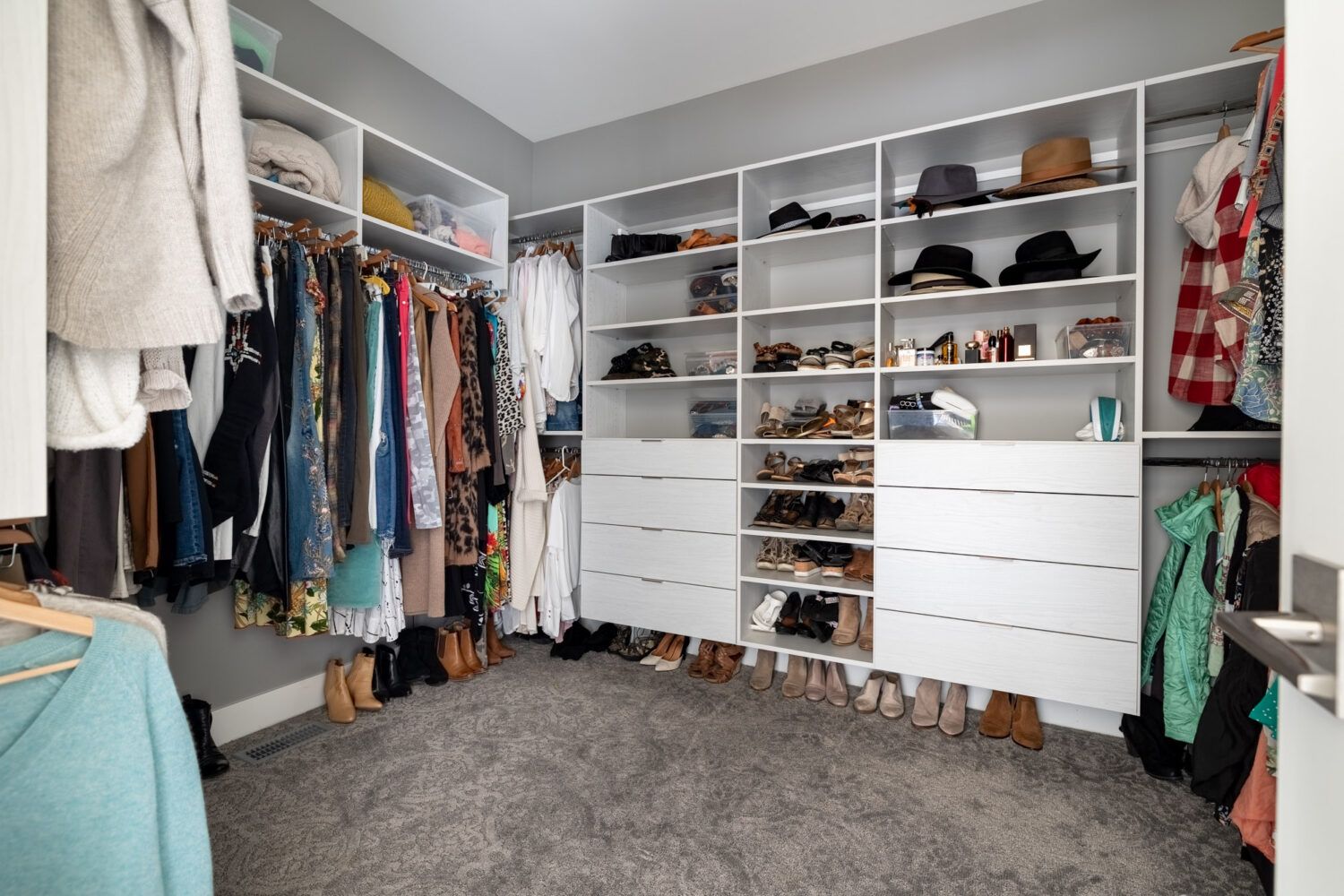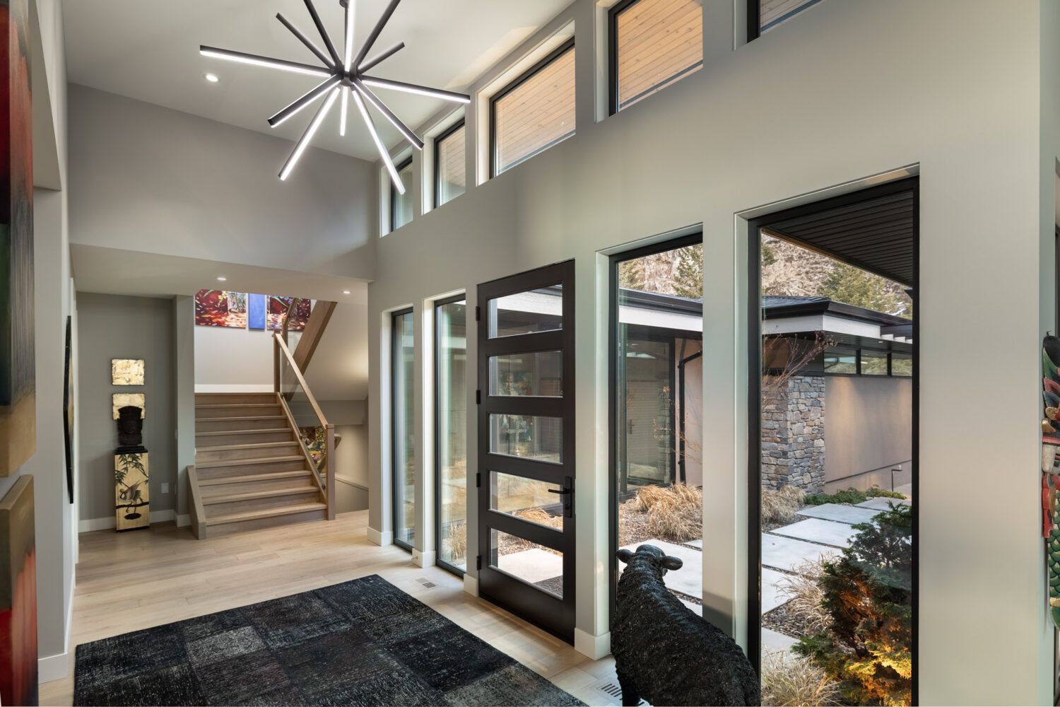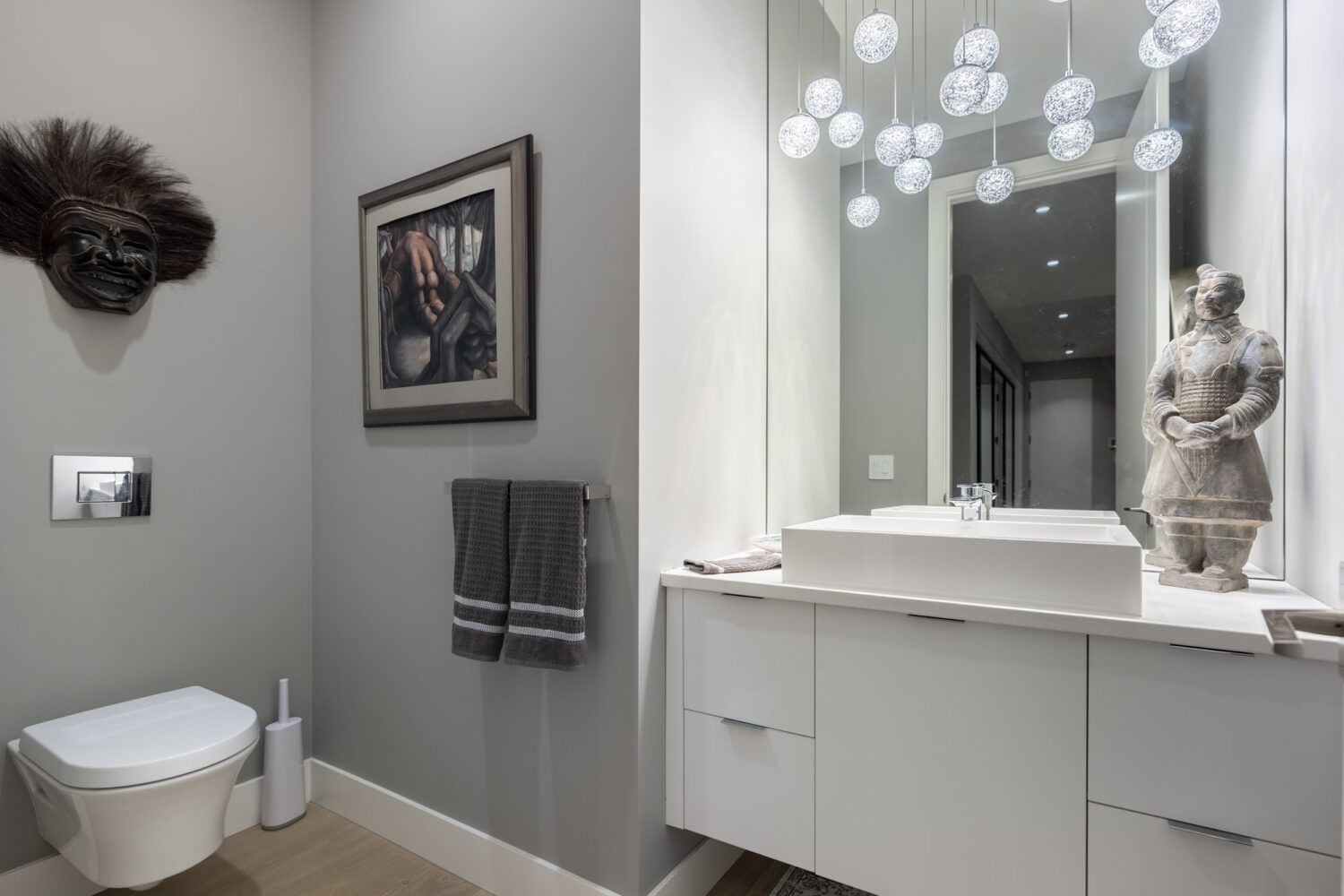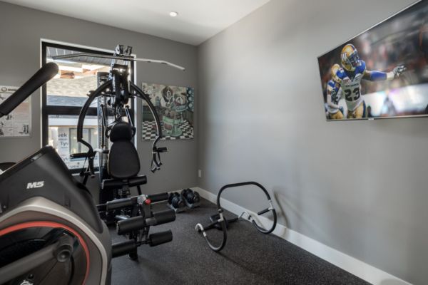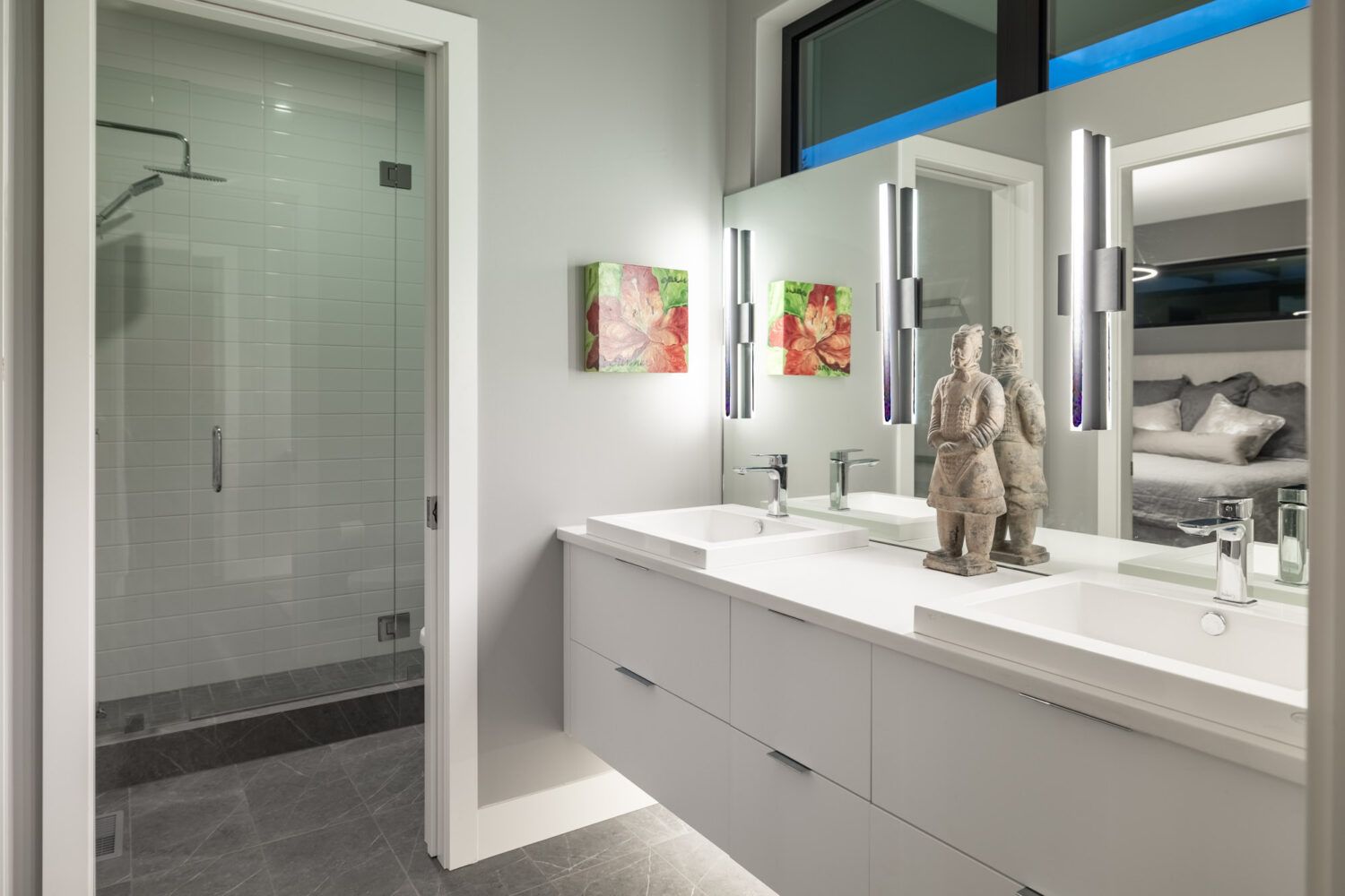 The north wing of the award-winning home leads upstairs to the master living space. This area features a home gym and a large master bedroom with a wall of custom Brillante built-in cabinetry. Wake up to the panoramic lake views and enjoy a coffee on the upper deck. The master suite is complete with a large walk-in closet and a stunning master ensuite bathroom with a large walk-in shower and floating soaker tub under the picture window. A perfect place to retreat!