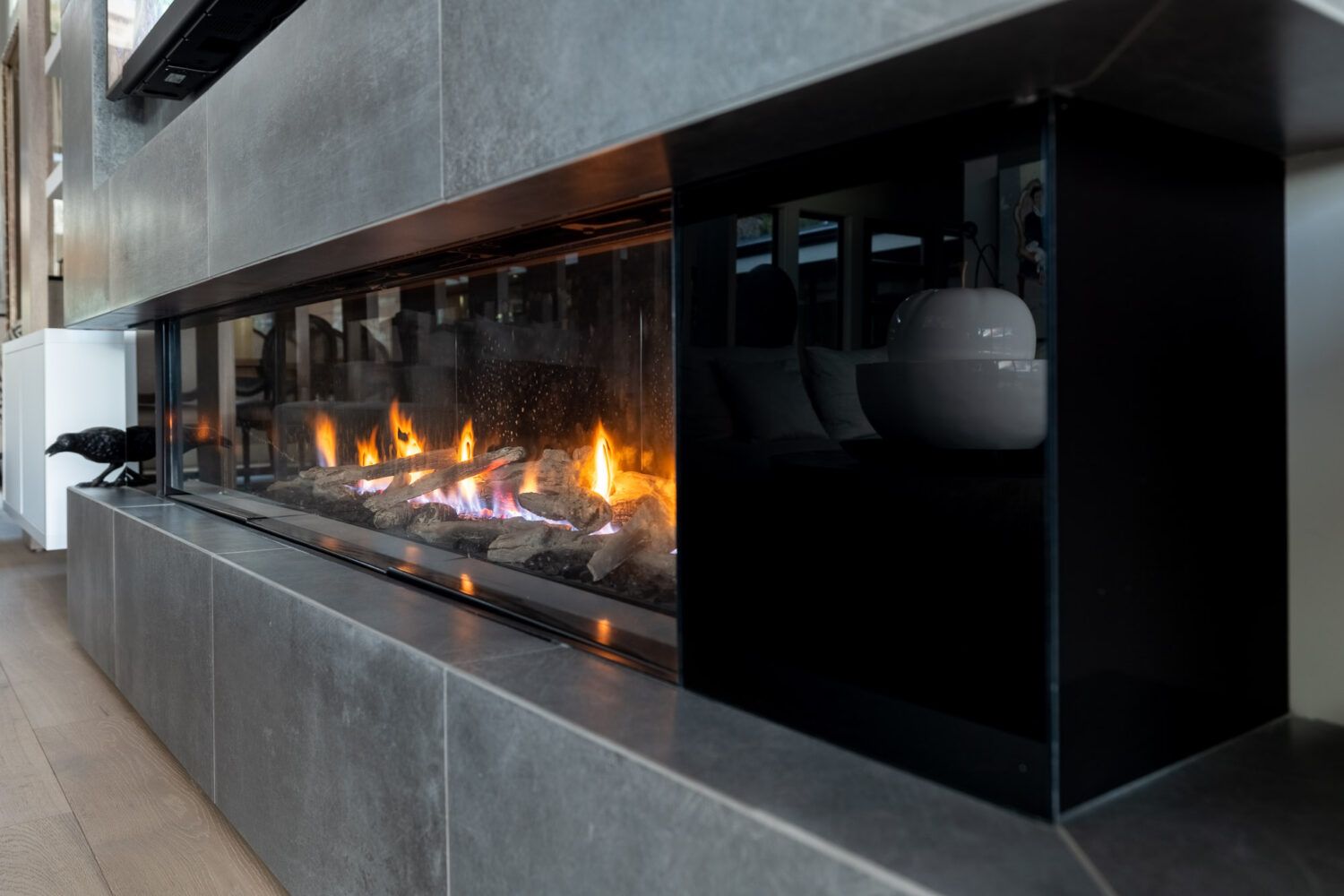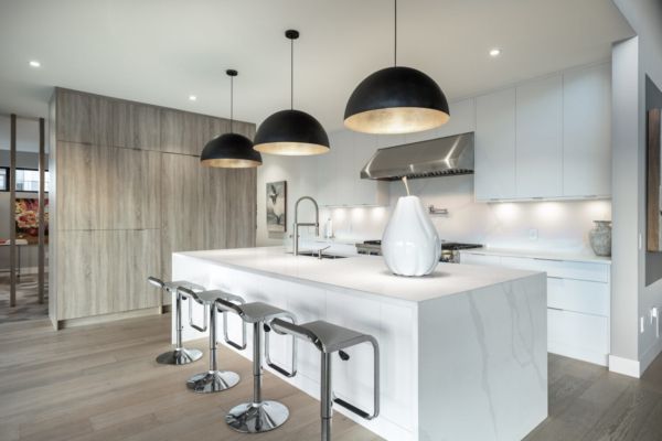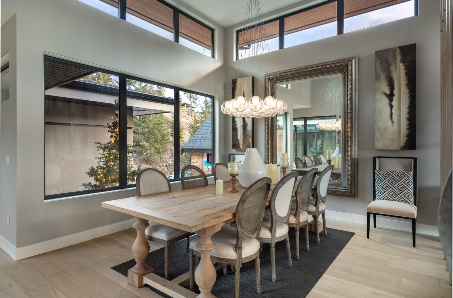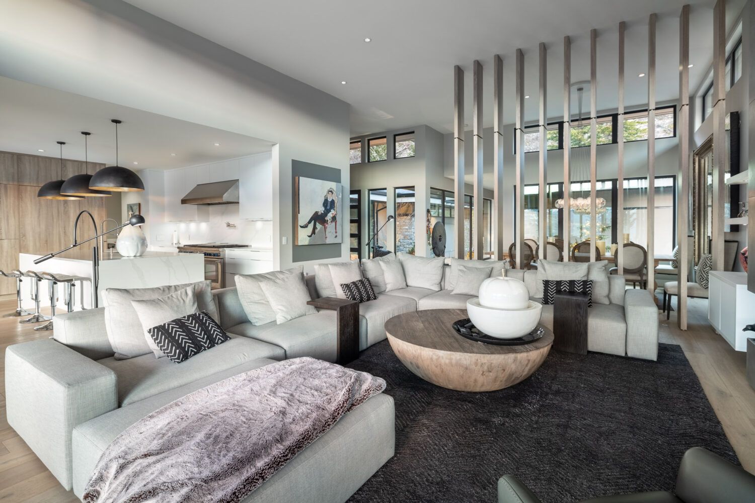 The center of this stunning award-winning home is anchored by an open living and dining area. The formal dining room is framed by glass windows and wood accents and features a custom hand-blown glass light fixture. The living room overlooks the backyard and pool deck with the main focal piece being the beautiful linear fireplace. The use of floating wood panels allows the light and views to continuously flow from room to room.
