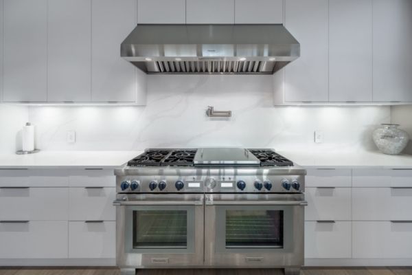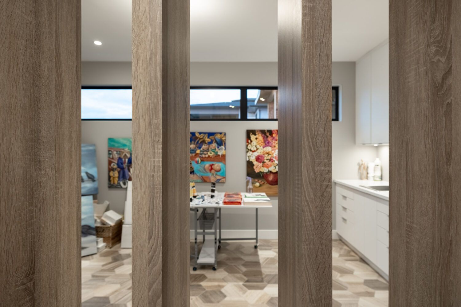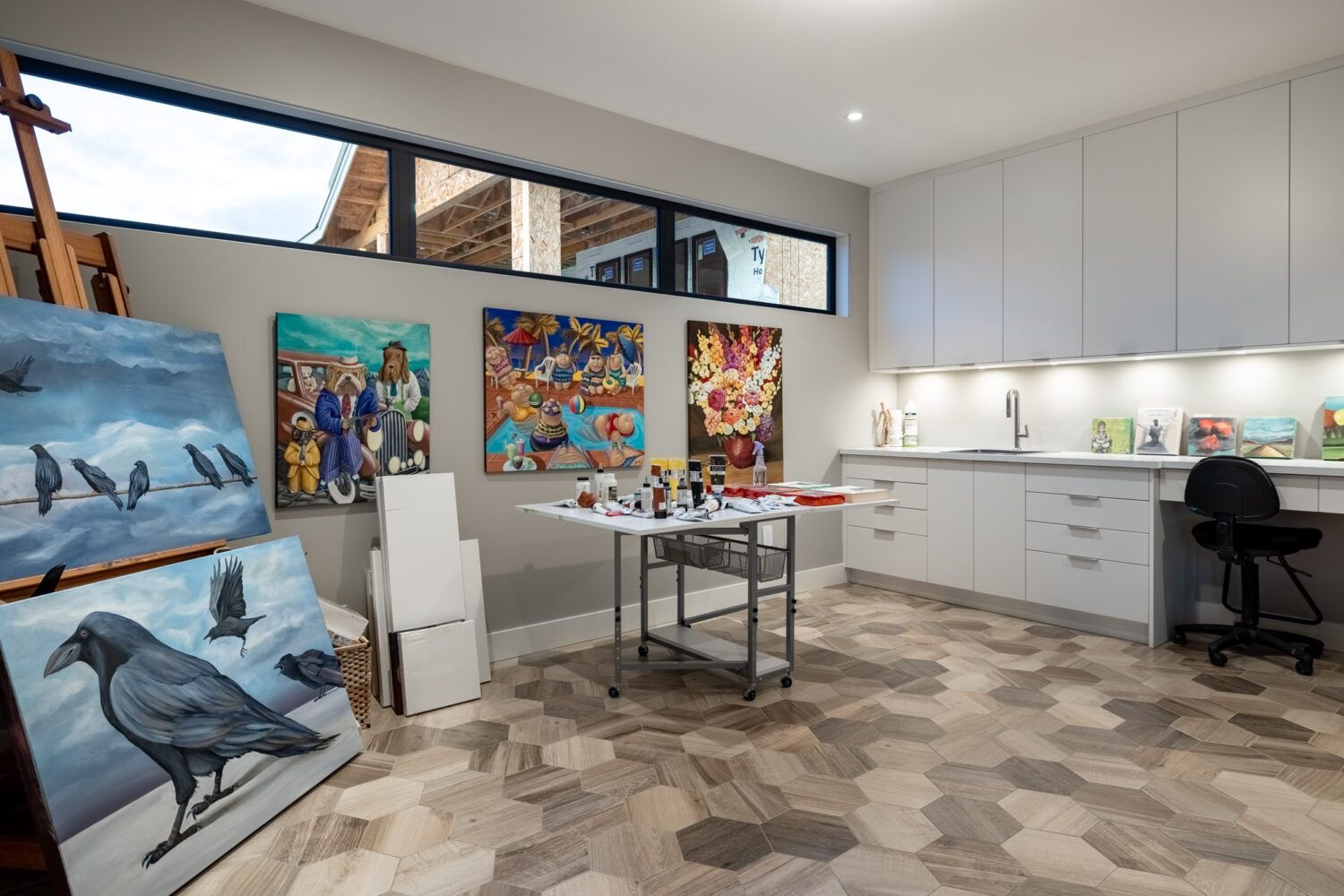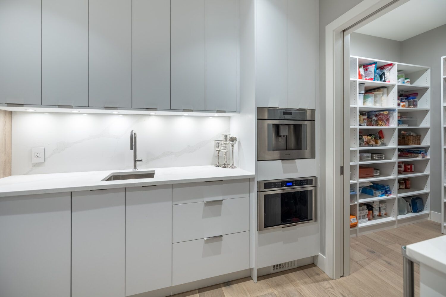 The sleek kitchen design features flat white cabinetry complemented by a Beachwood floating wall with cabinetry. Top-of-the-line 5ft Thermador gas stove with dual ovens, 6 burners with grill, and a convenient pot filler. Off the kitchen is a beverage center, butler pantry, and unique studio space with its own ensuite and access to the pool deck, perfect for a painting studio, yoga room, or home office.