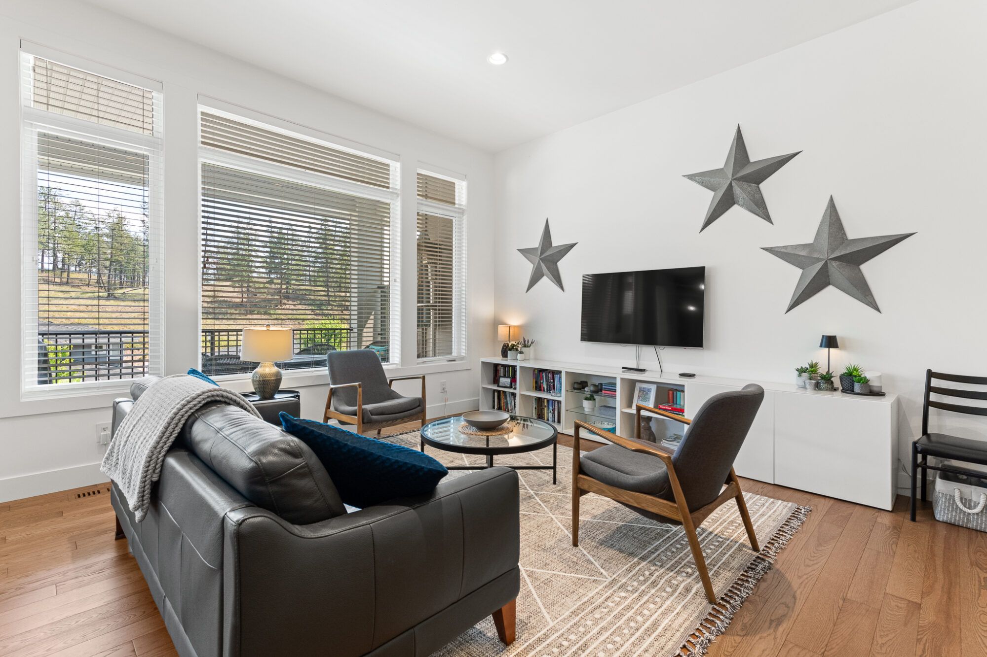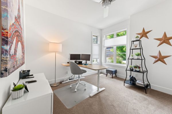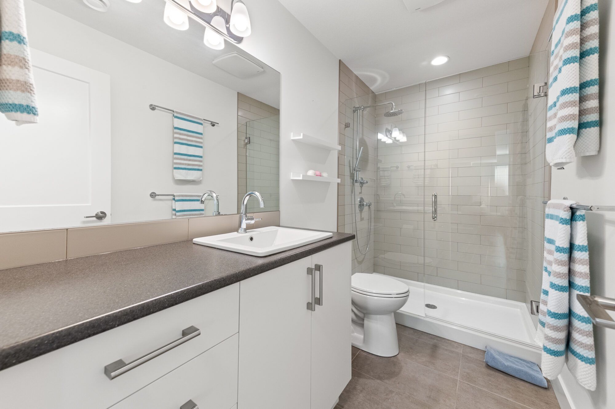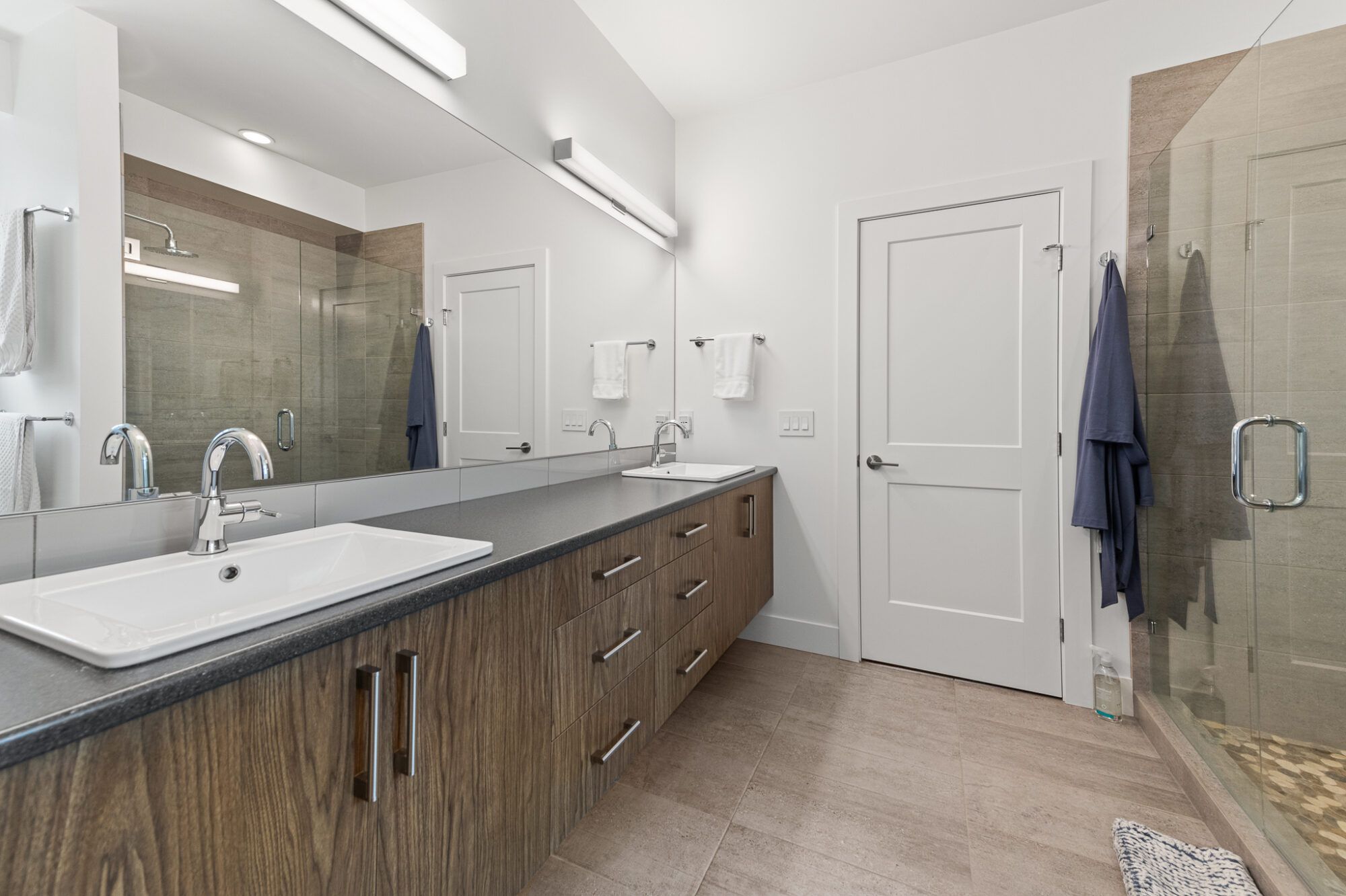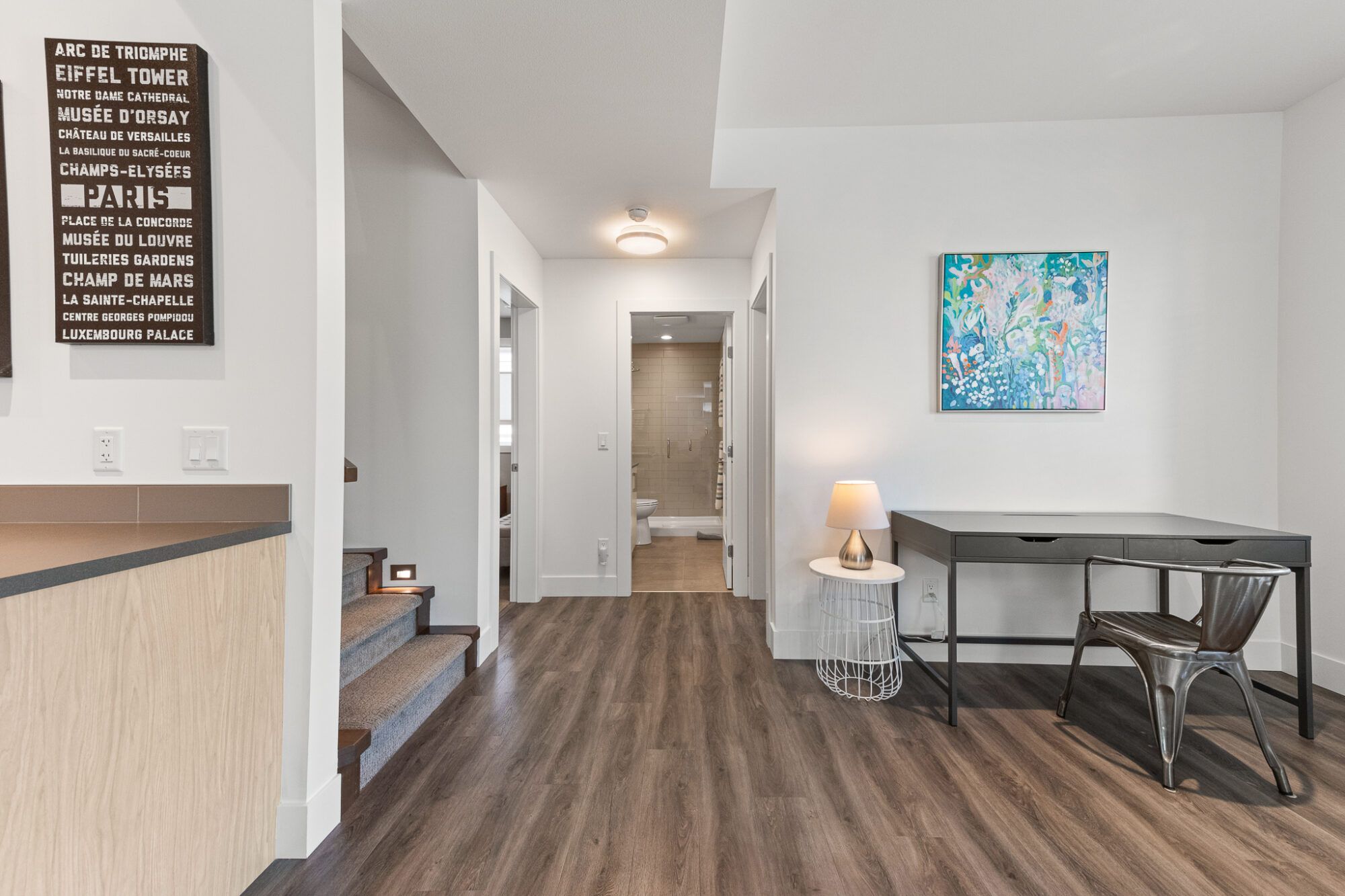 The main level is complete with a front den perfect for a home office or bedroom, a full bathroom, and a large primary suite. The primary offers an ensuite with double sinks, a large glass shower, and a walk-in closet.