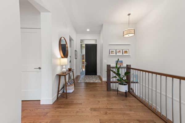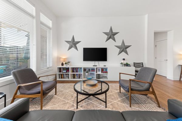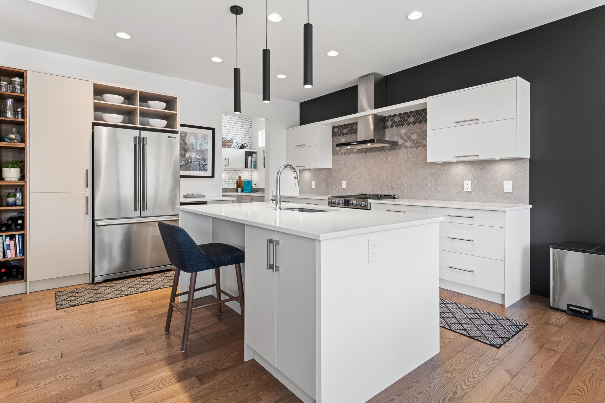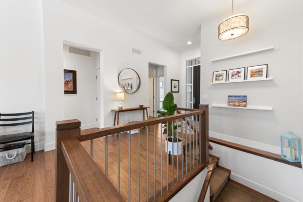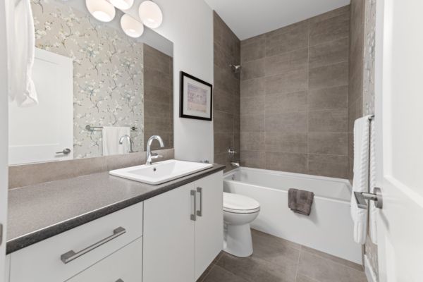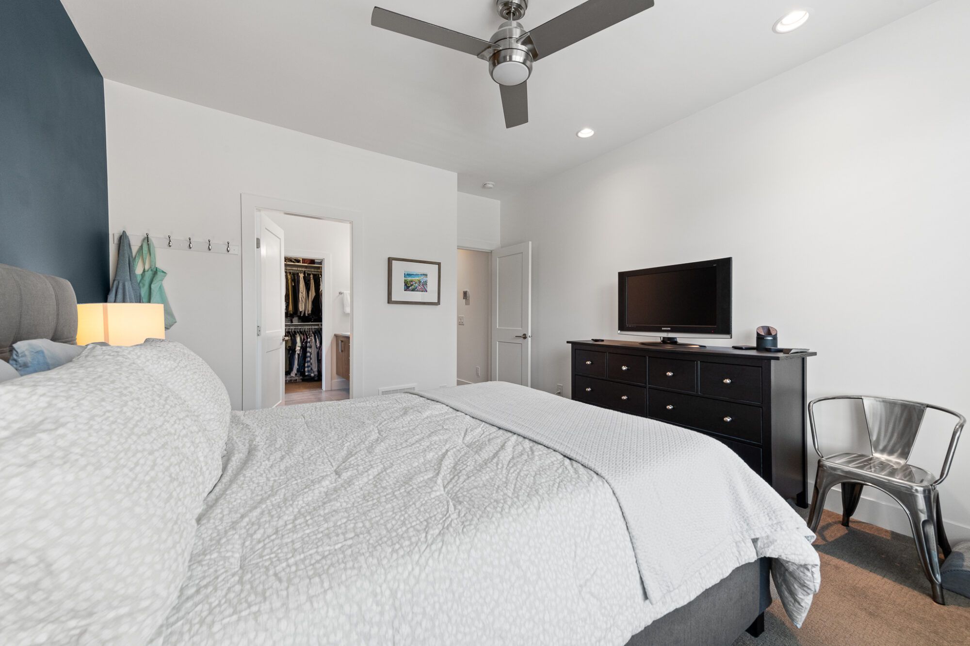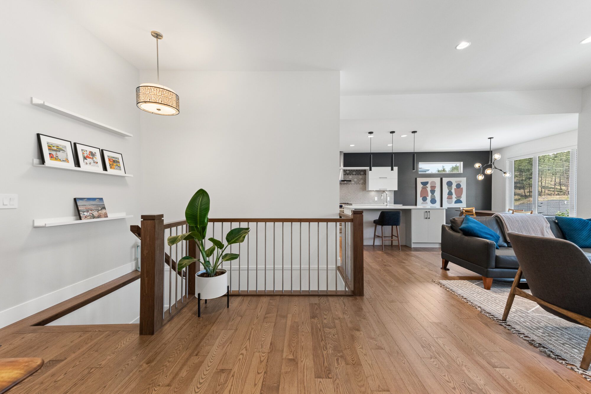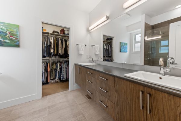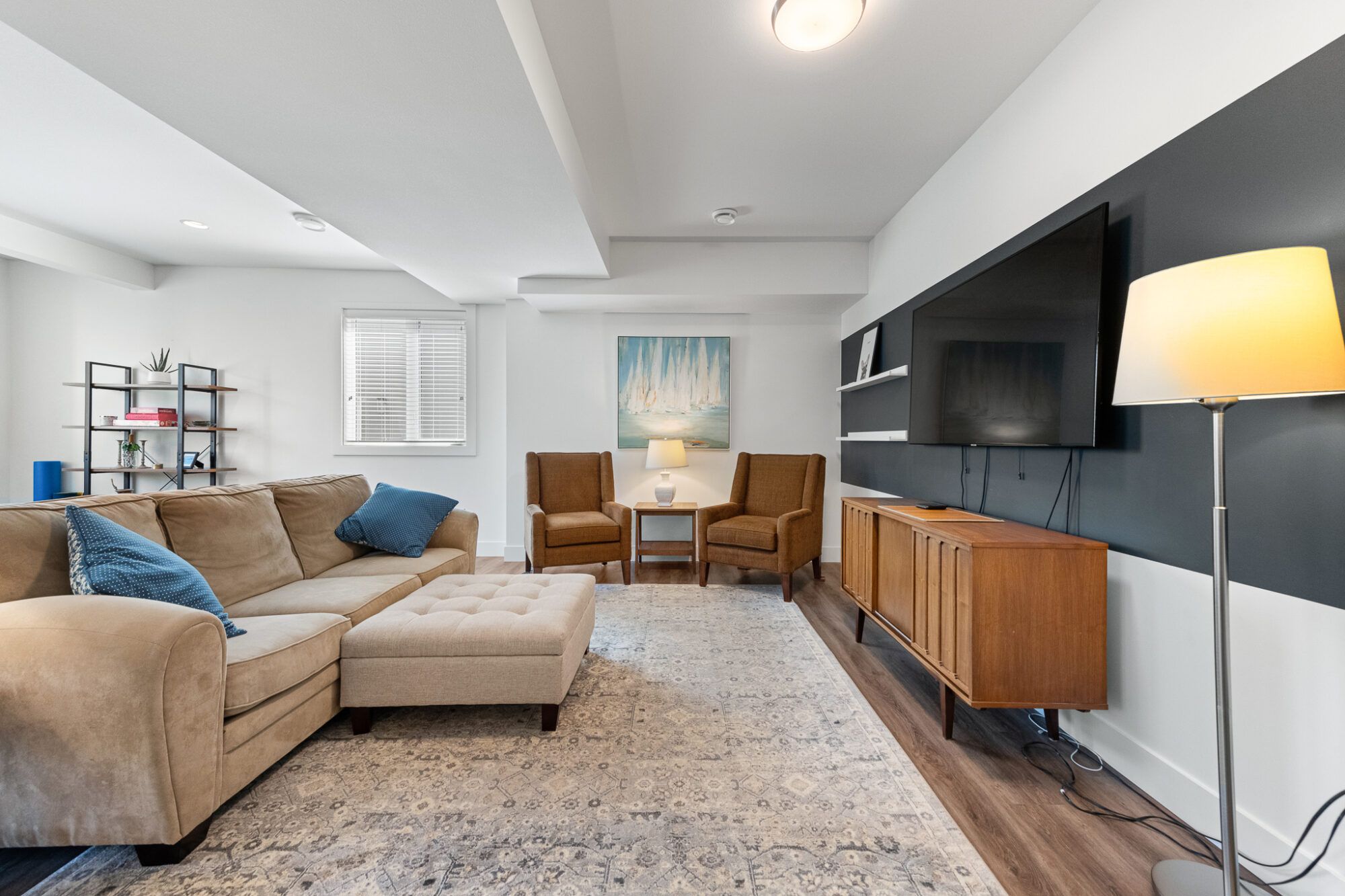 The main level is complete with a front den perfect for a home office or bedroom, a full bathroom, and a large primary suite. The primary offers an ensuite with double sinks, a large glass shower, and a walk-in closet.