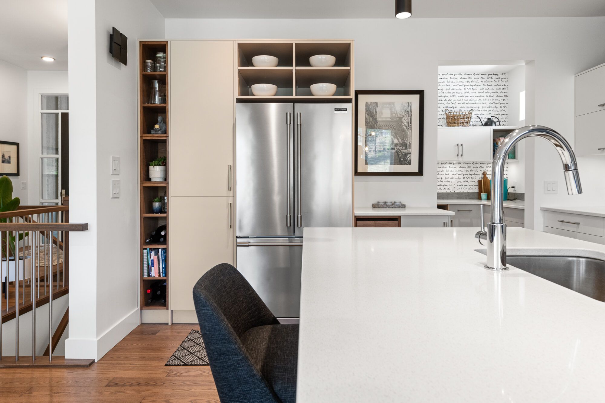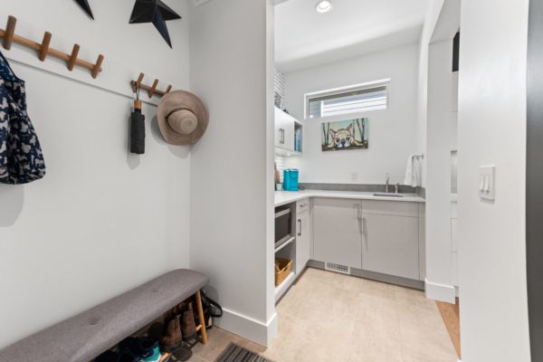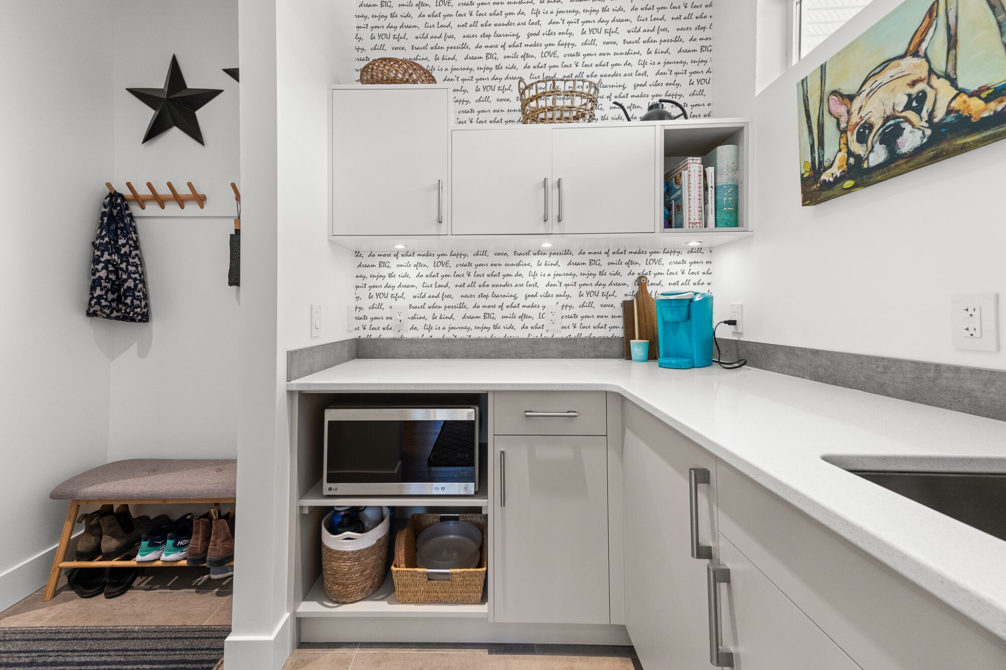 The timeless white kitchen features wood accents, honeycomb backsplash, and gleaming quartz countertops. This great functional kitchen is equipped with a large center island, a 5-burner gas stove, and a convenient prep kitchen with sink, microwave, and storage located just off the garage mud room, perfect for unloading groceries.