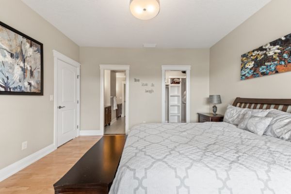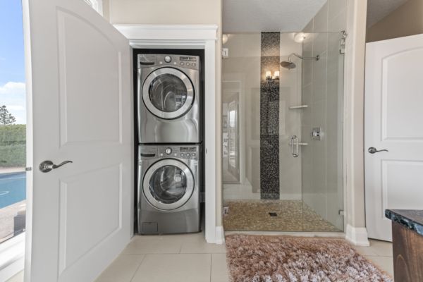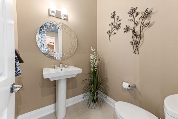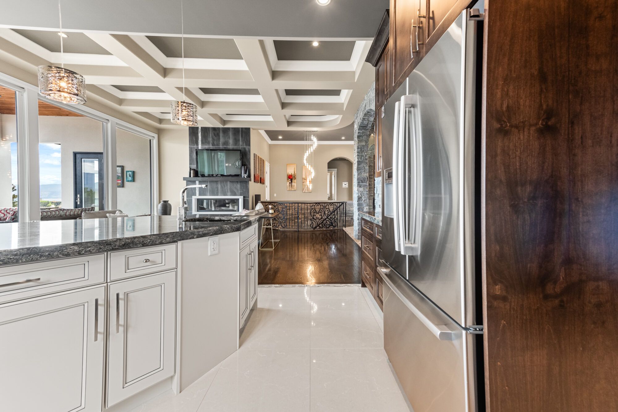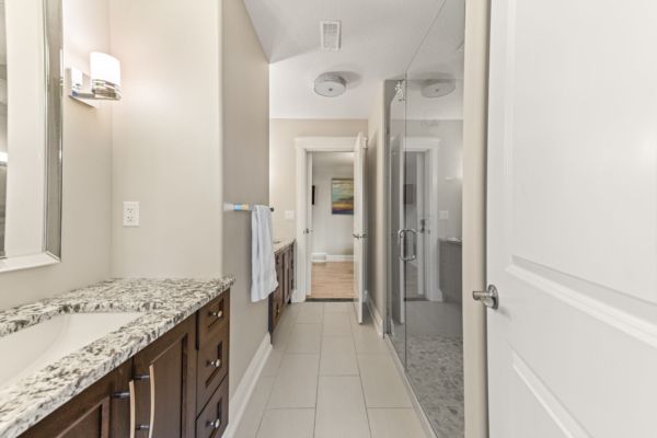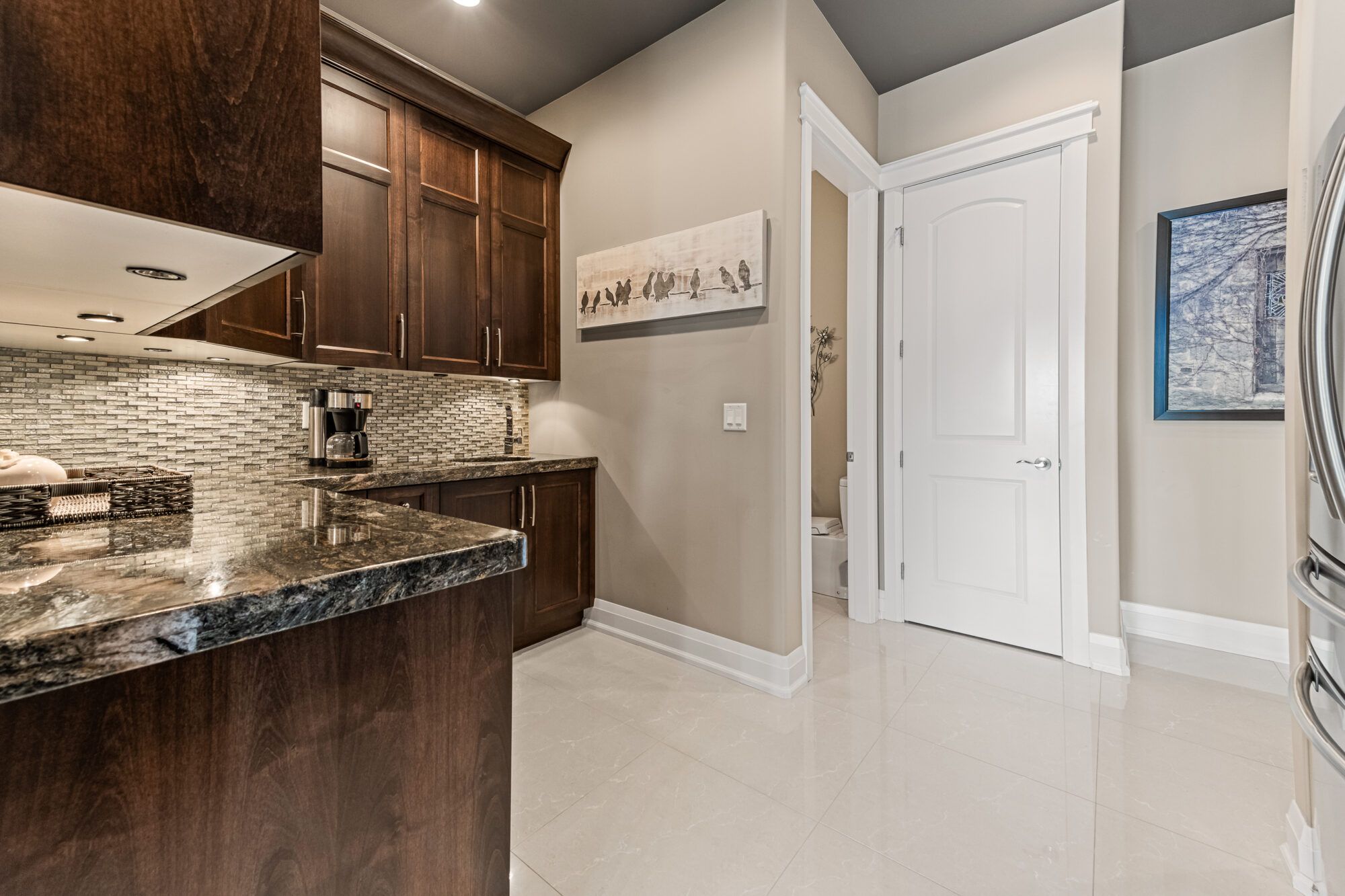 Upon entering the main level, you are greeted by a spacious formal dining room, a living room adorned with picture windows, and a kitchen nook that provides stunning views of the lake. The kitchen is equipped with luxurious wooden cabinetry, state-of-the-art appliances, and Quartz countertops. Adjacent to the kitchen, there’s a generously sized prep pantry, a powder room, the first of two laundry rooms, and access to the upper-level triple-car garage.
