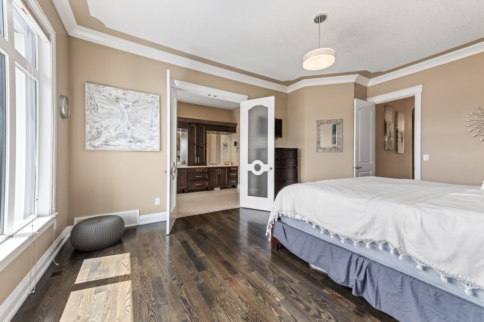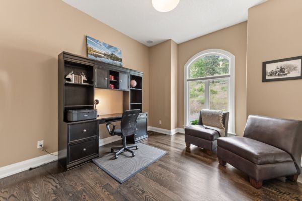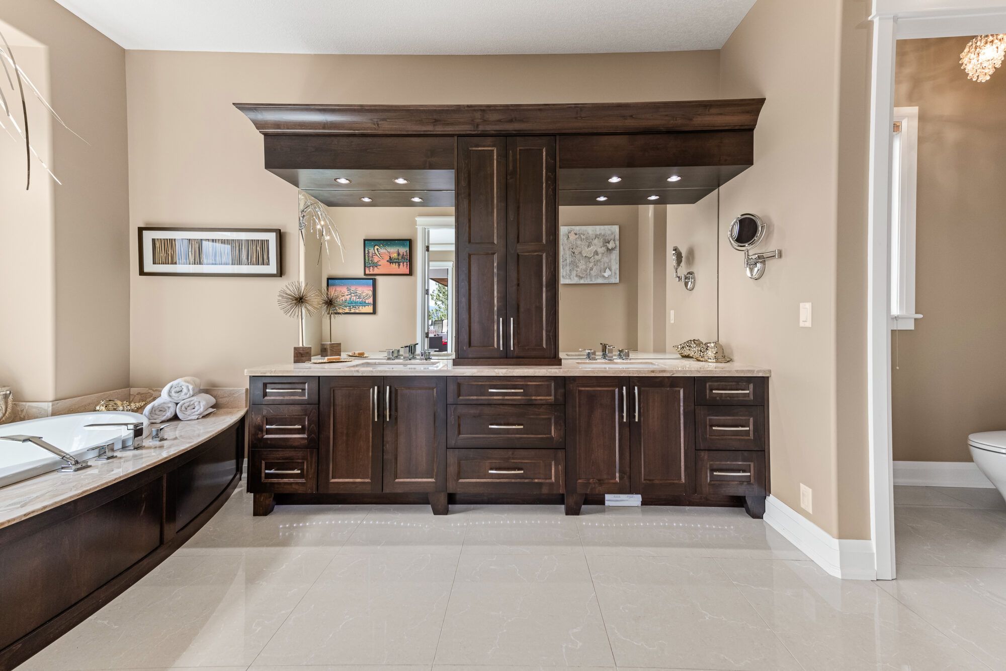 Continuing through the main level, you’ll find the home’s west wing featuring a den, a full bathroom, and the primary suite, which boasts a lavish ensuite with a soaker tub, dual sinks, a walk-in tile shower, and a spacious closet.