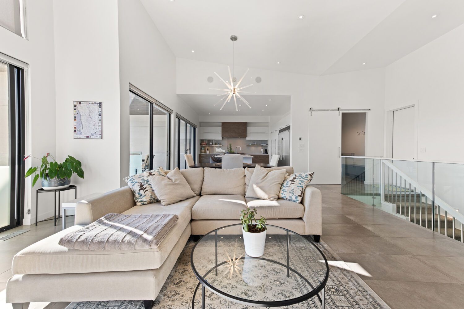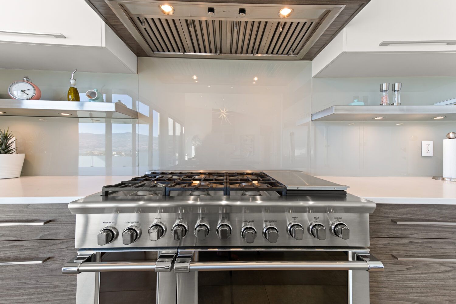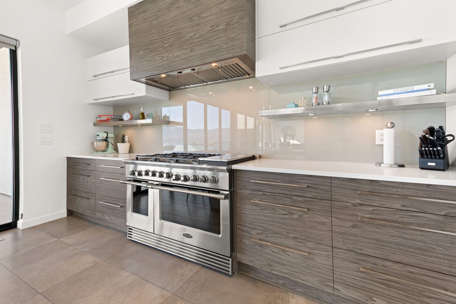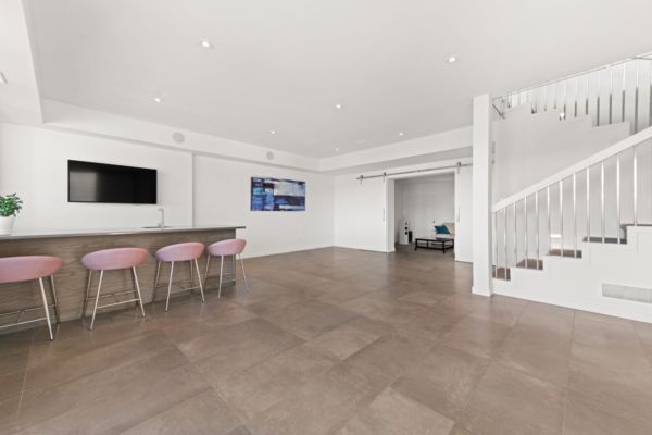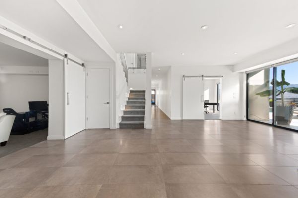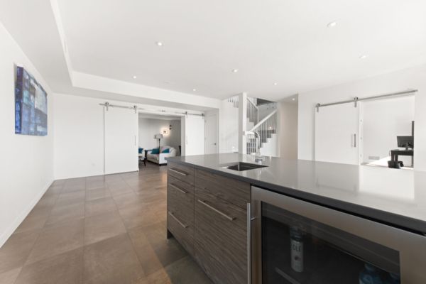 The kitchen is equipped with top-of-the-line appliances including a 6 burner gas stove and full size side by side fridge and freezer. The prep kitchen was brilliantly hidden behind cabinet doors to maintain the sleek lines and offers a sink, wine fridge, and microwave. The two-toned flat panel cabinetry compliments the white marbled quartz countertop and glass backsplash.