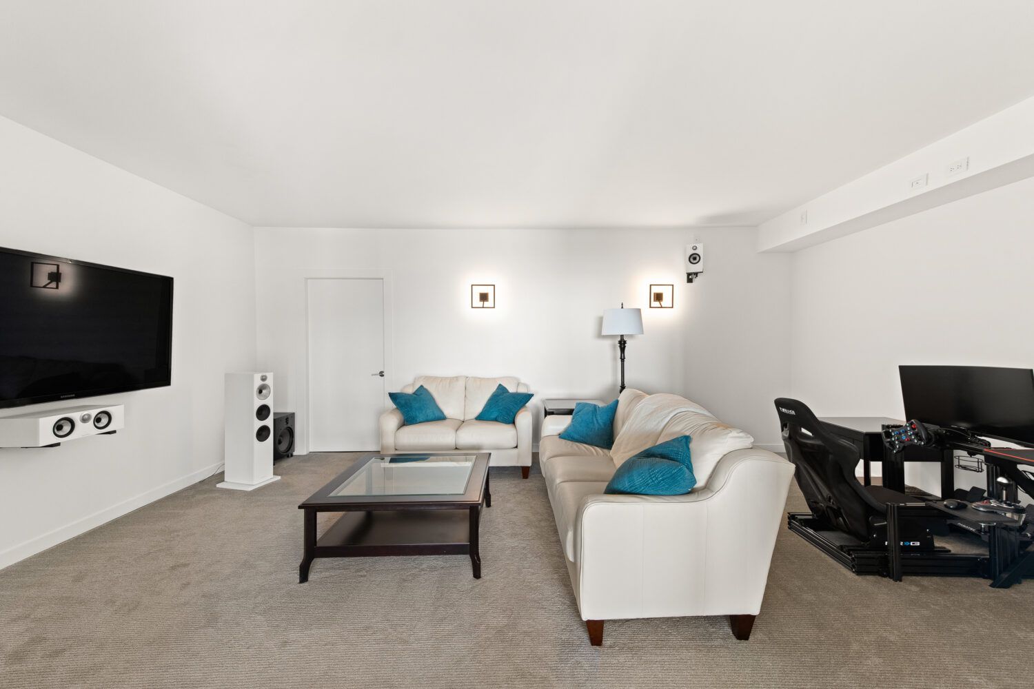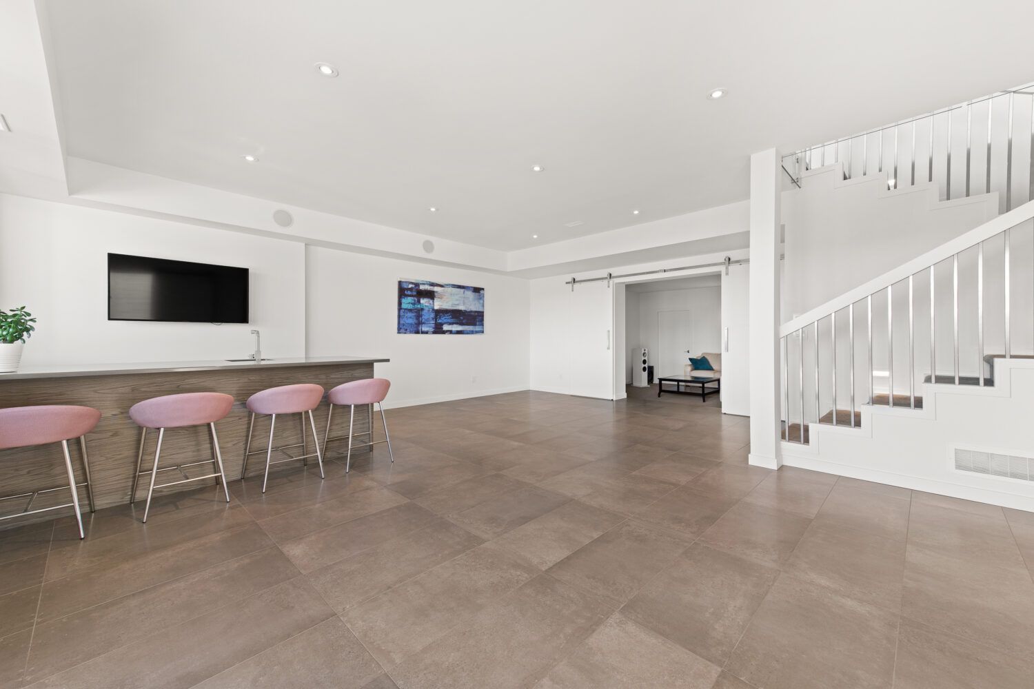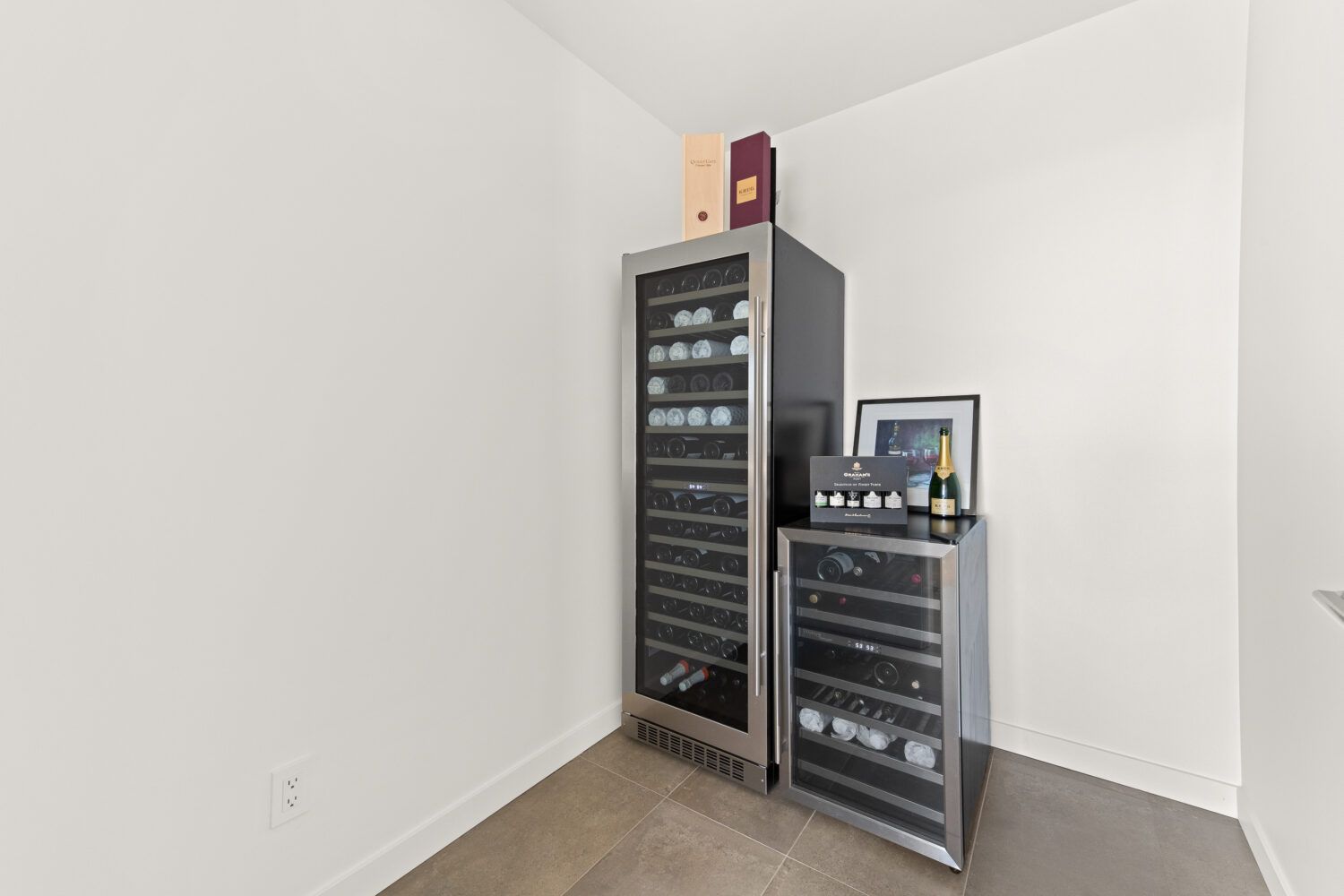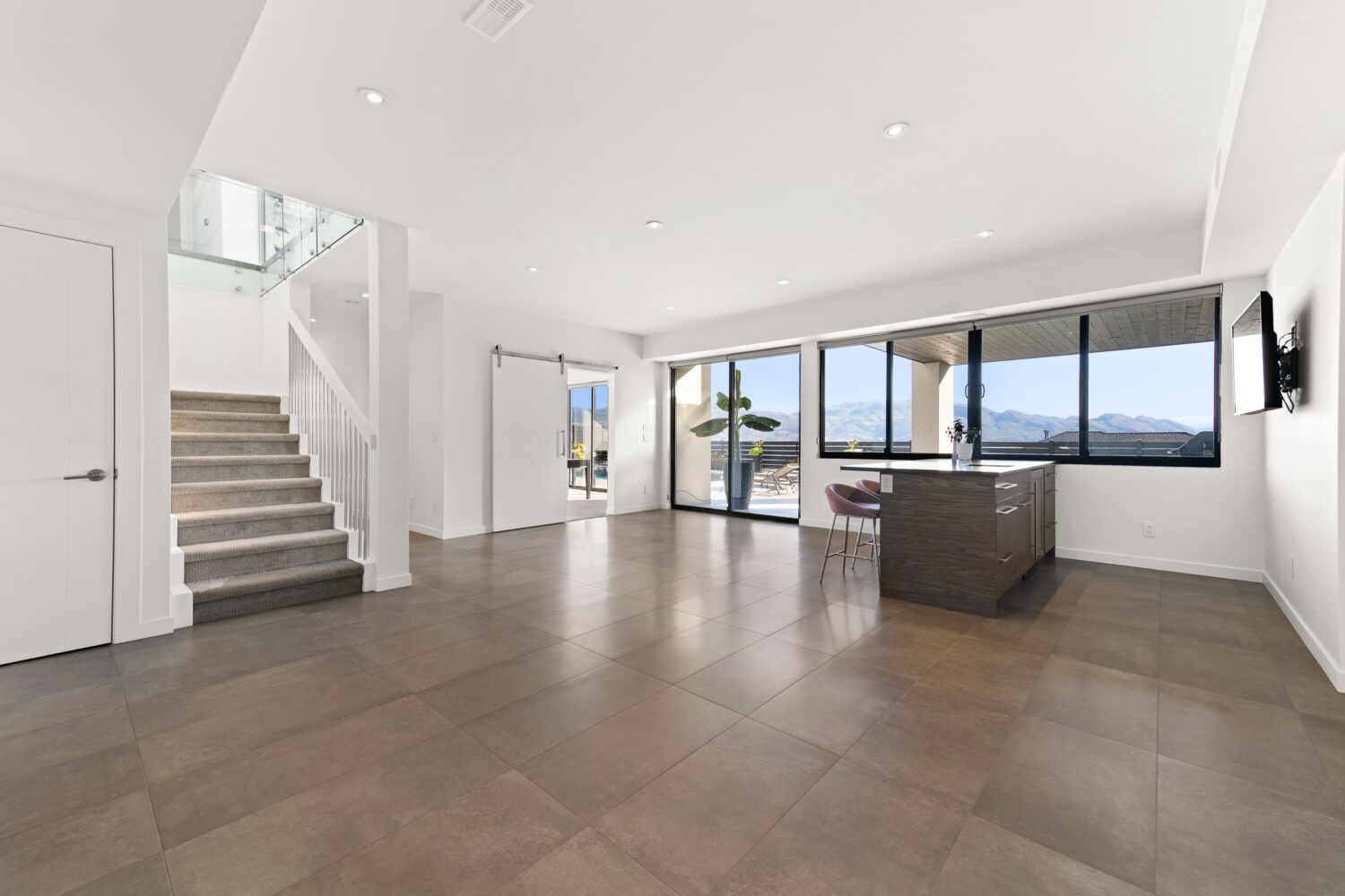 The kitchen is equipped with top-of-the-line appliances including a 6 burner gas stove and full size side by side fridge and freezer. The prep kitchen was brilliantly hidden behind cabinet doors to maintain the sleek lines and offers a sink, wine fridge, and microwave. The two-toned flat panel cabinetry compliments the white marbled quartz countertop and glass backsplash.