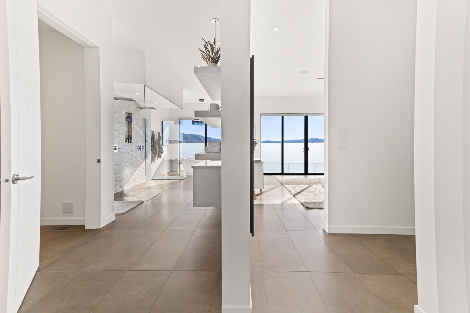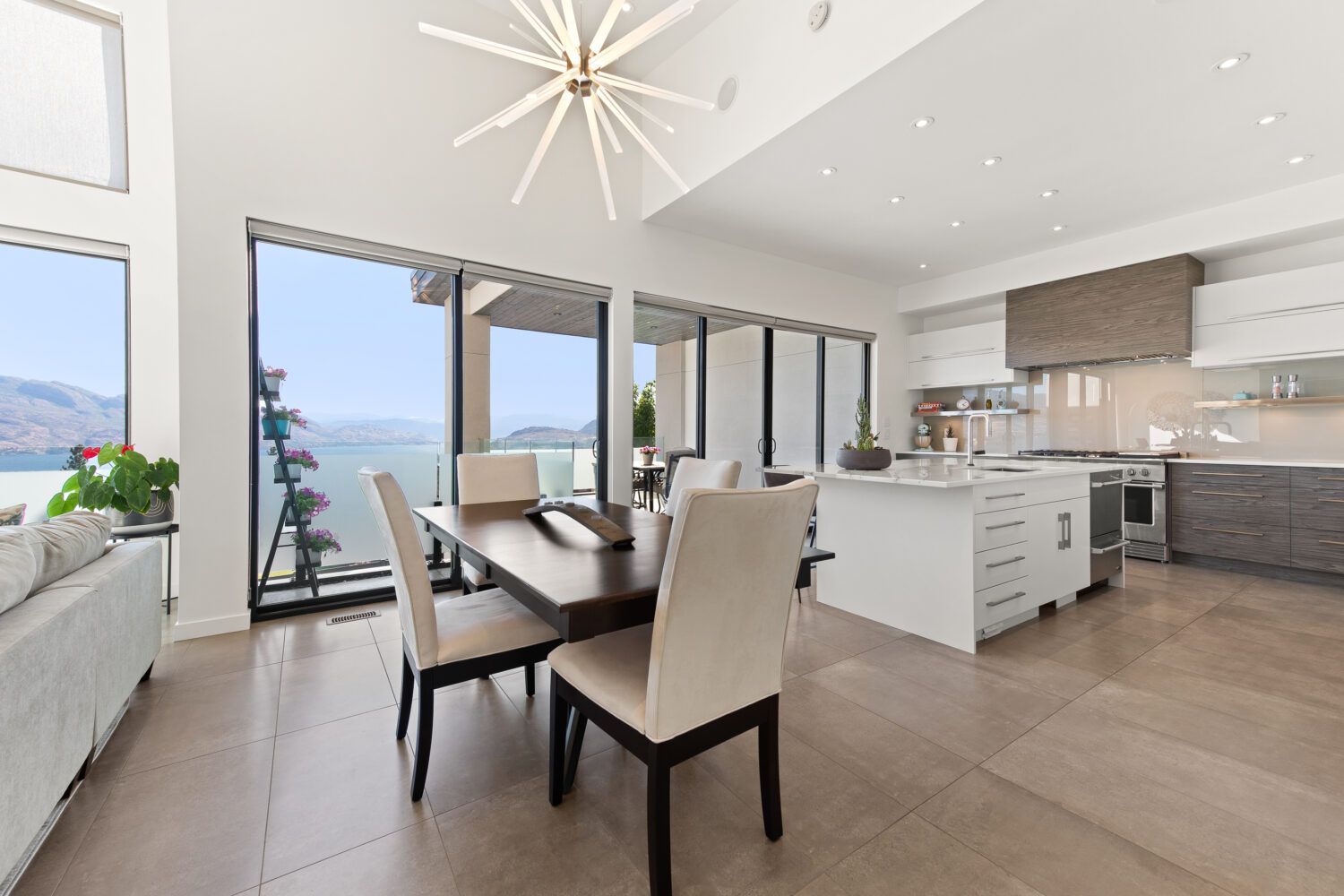 The open-concept living area is flooded with natural light and offers spectacular lake views. This area opens to the upper deck that wraps around to overlook the pool. With a cozy wood ceiling, this is a perfect space to enjoy a glass of wine while taking in the lake views. The main floor primary bedroom features a spa-inspired ensuite offering a walk-through glass shower with a double shower and rain heads. The sleek flat panel cabinetry carries through the walk-in closet to keep this area clean and organized.