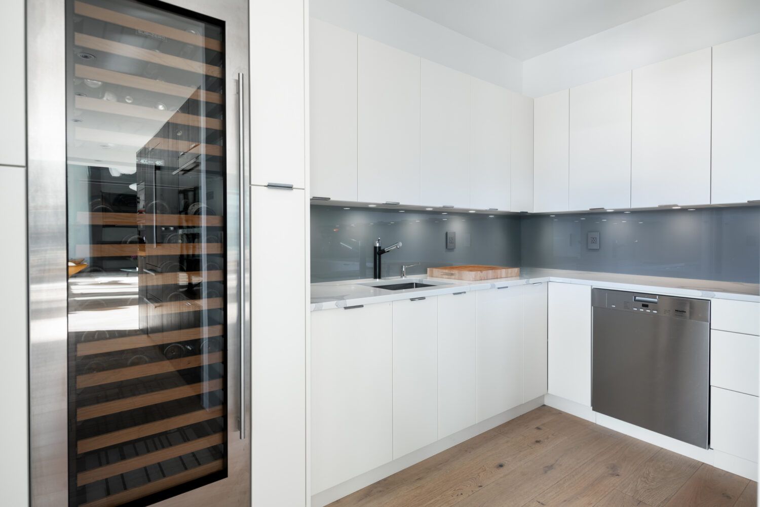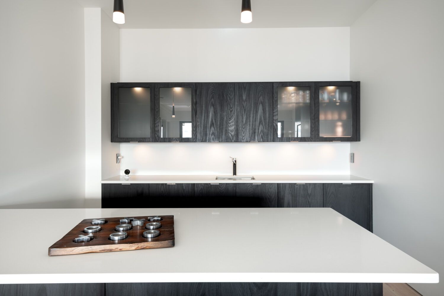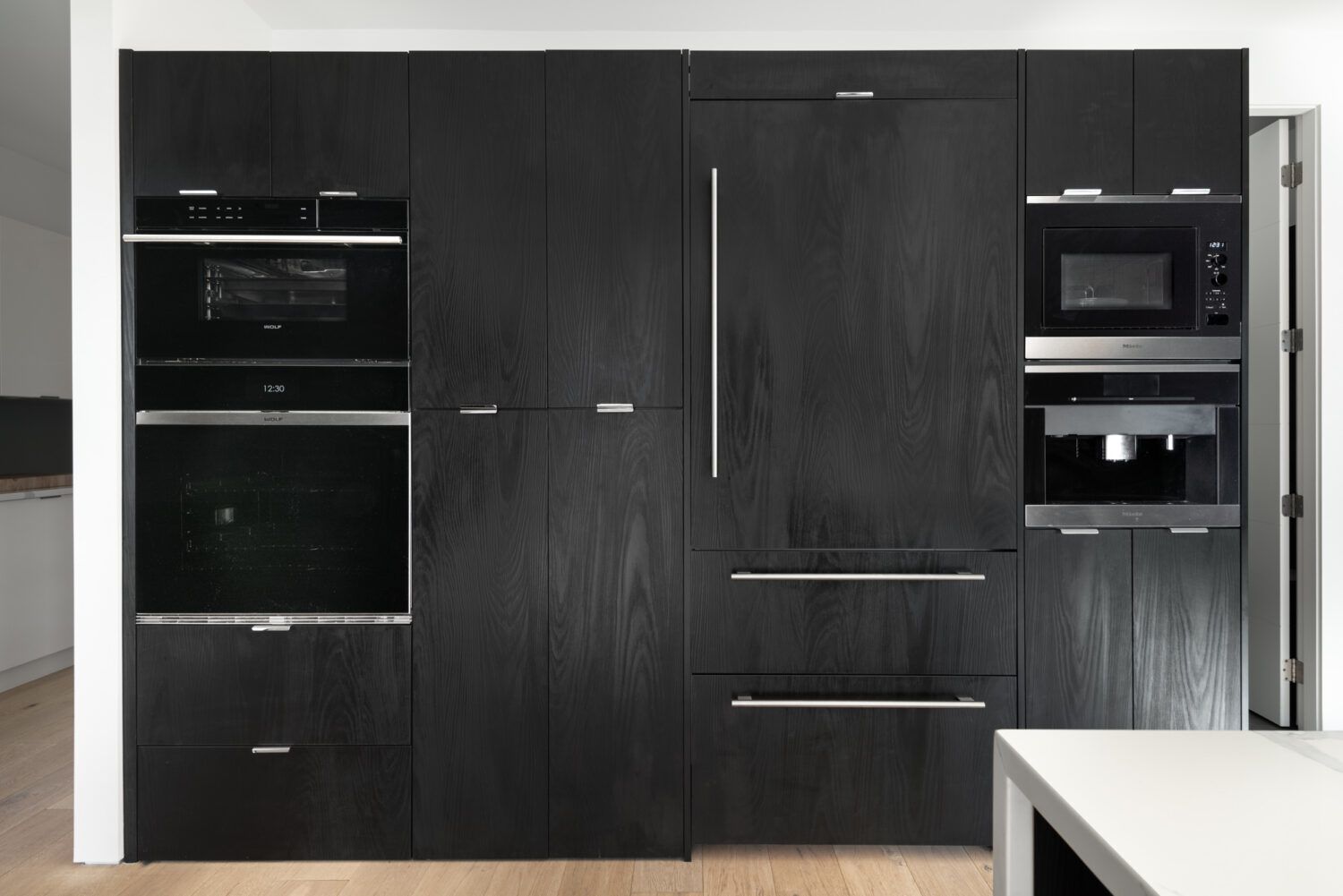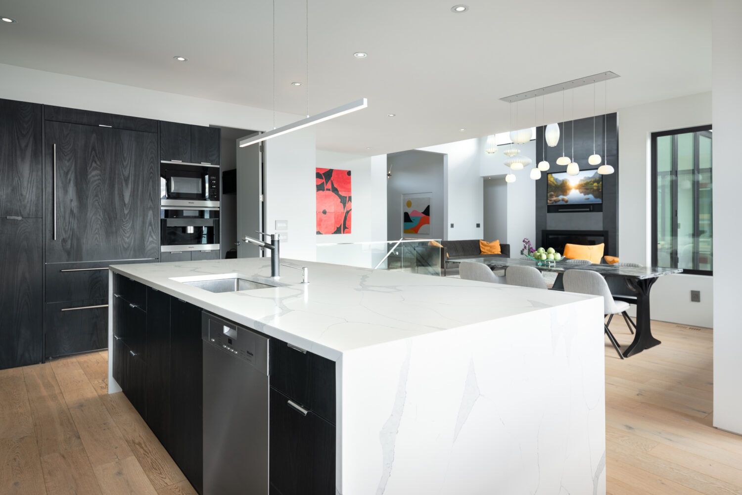 The kitchen in this lake view home is right out of a design magazine with striking rich black wood cabinetry accented with white quartz countertops leading to the bright butler pantry with a Sub Zero wine cooler and dishwasher. The pantry includes direct access to the BBQ deck. Top-of-line appliances complete this stunning space with a built-in Wolf oven and steam/convection oven, paneled Sub-Zero fridge/freezer, Meile built-in coffee maker, and Wolf range with Blanco pot filler.