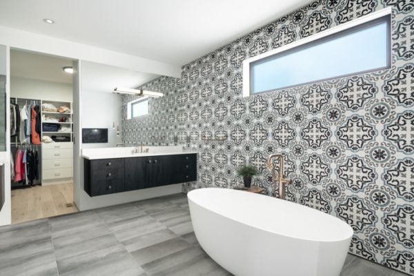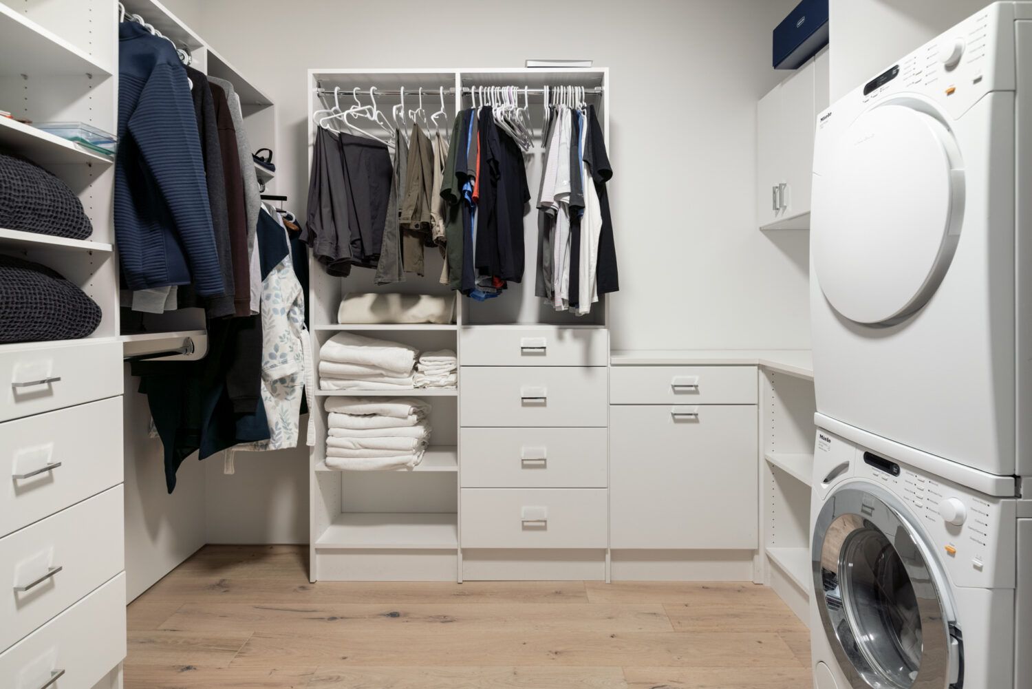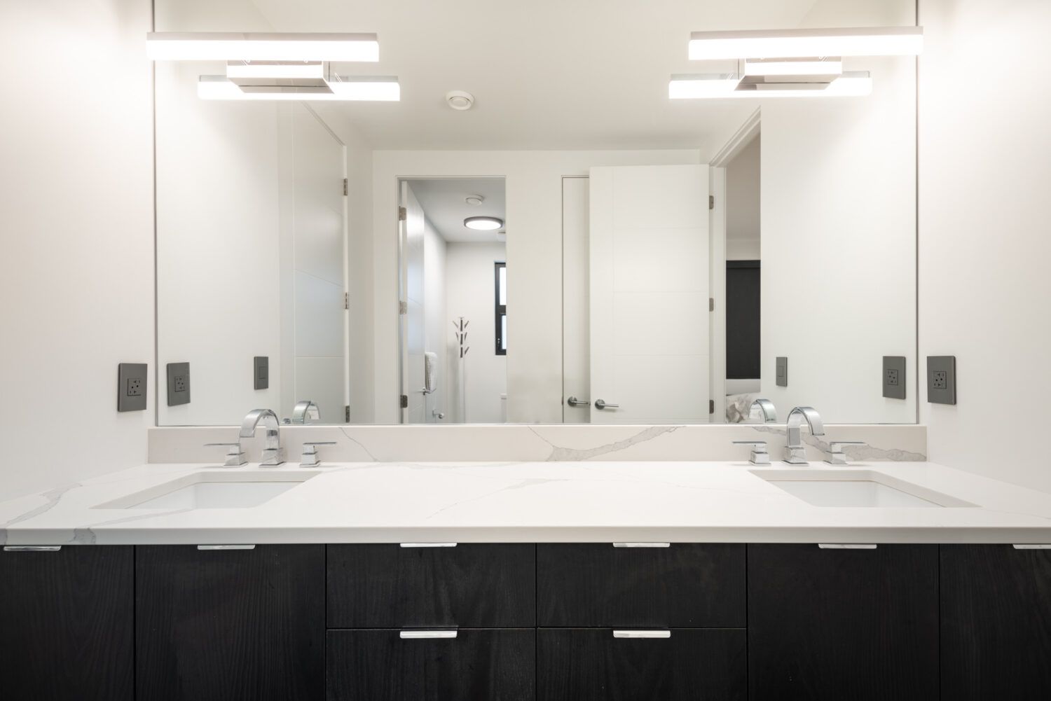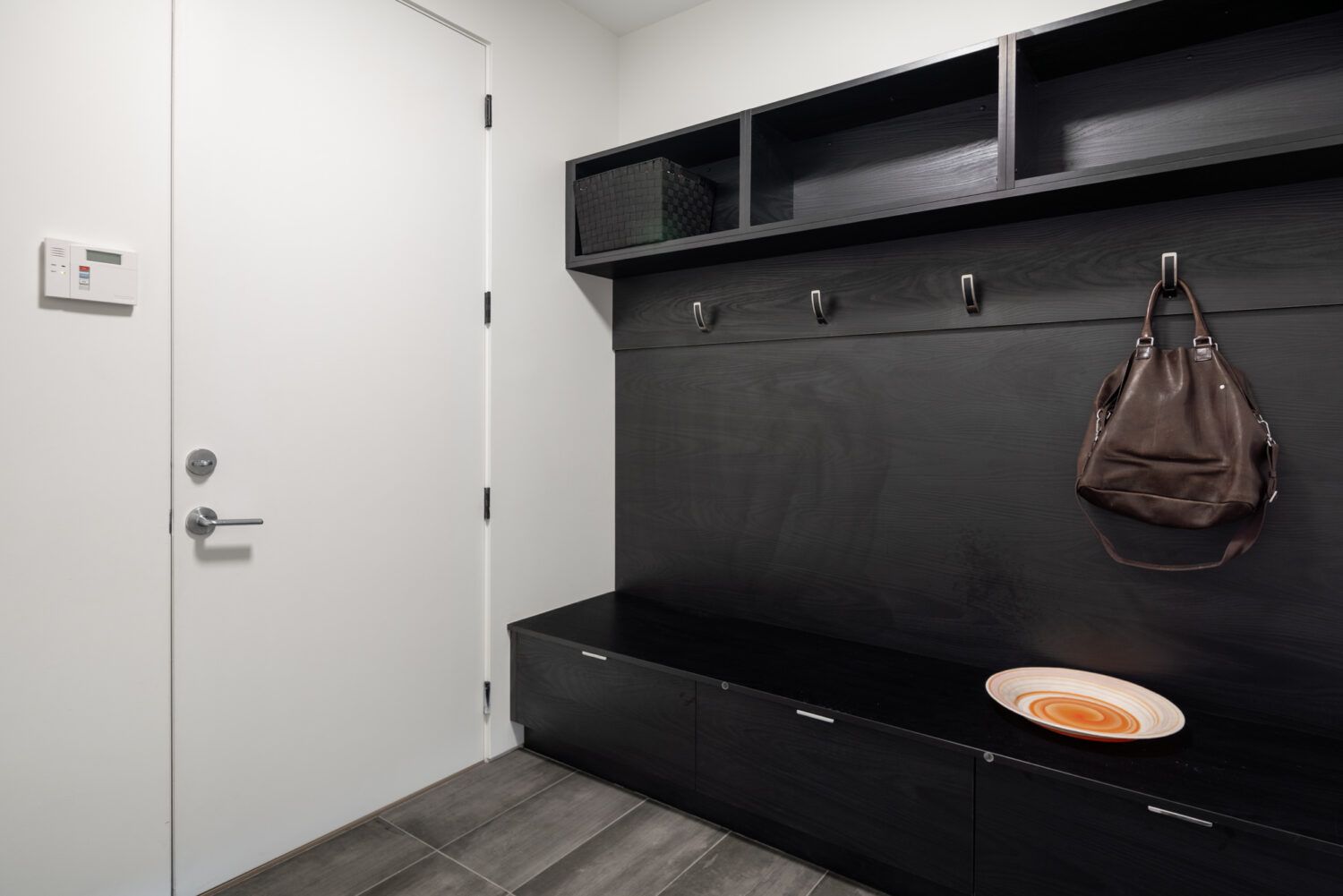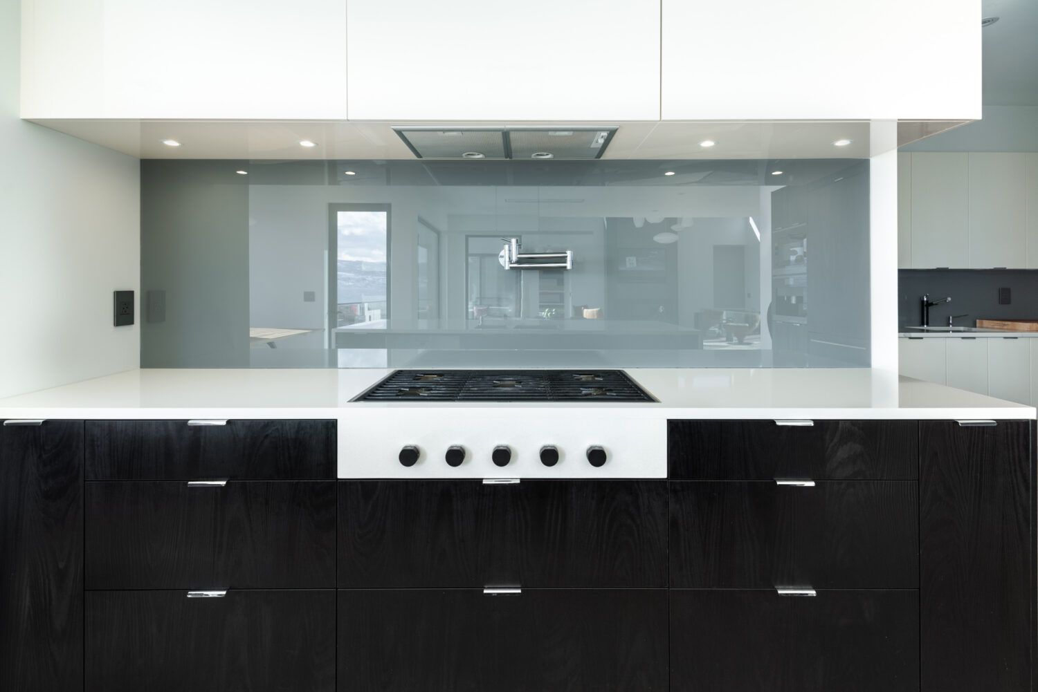 The kitchen in this lake view home is right out of a design magazine with striking rich black wood cabinetry accented with white quartz countertops leading to the bright butler pantry with a Sub Zero wine cooler and dishwasher. The pantry includes direct access to the BBQ deck. Top-of-line appliances complete this stunning space with a built-in Wolf oven and steam/convection oven, paneled Sub-Zero fridge/freezer, Meile built-in coffee maker, and Wolf range with Blanco pot filler.