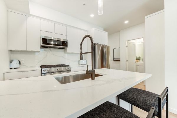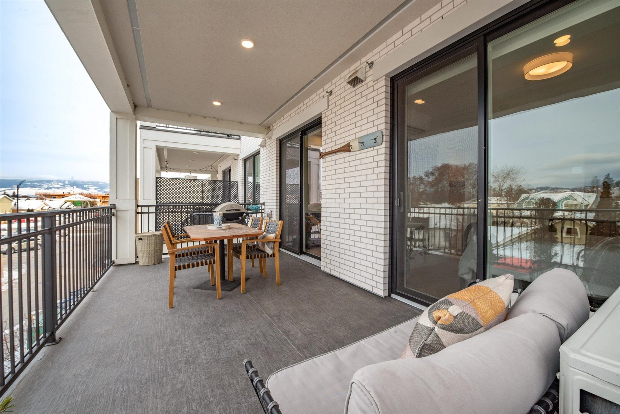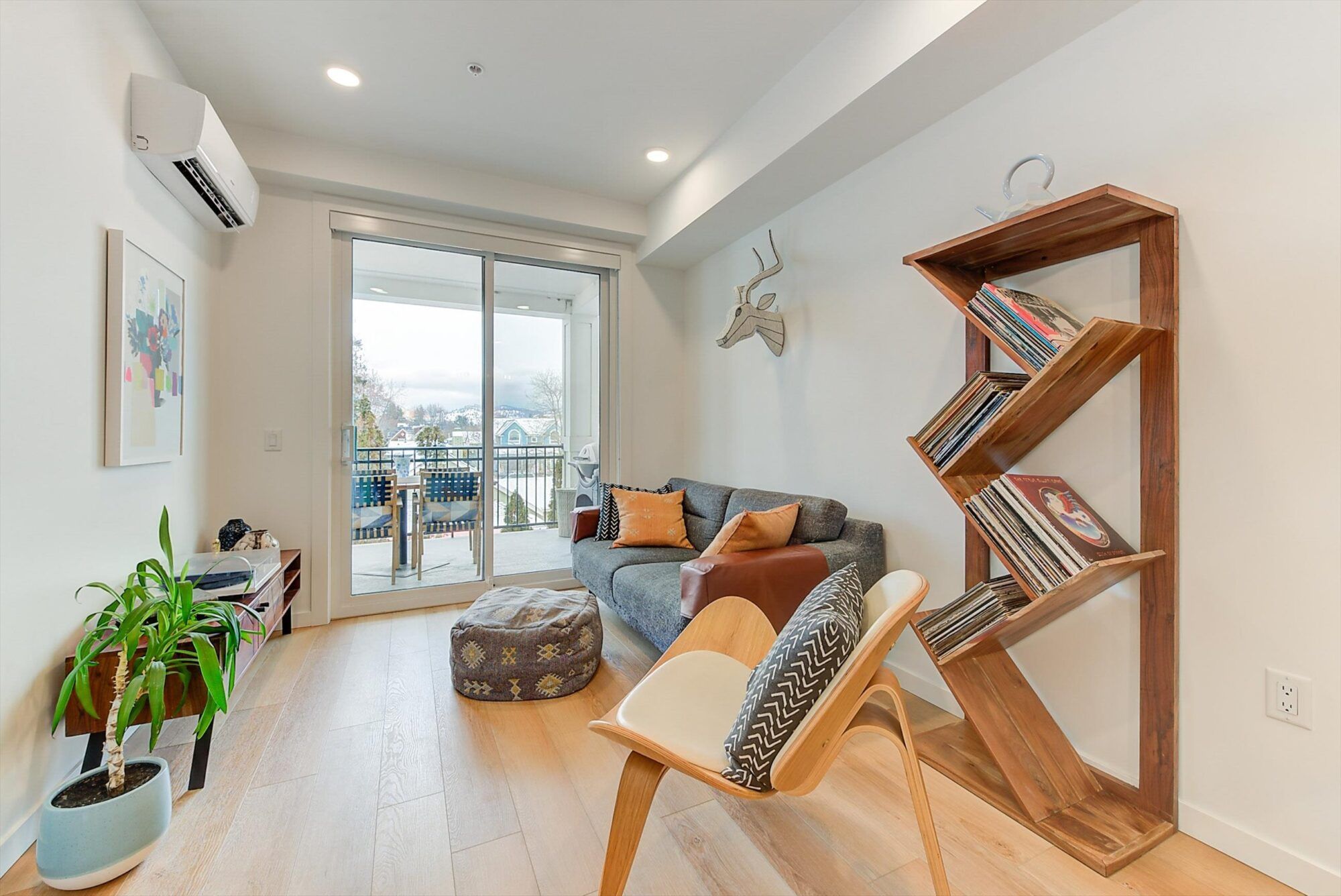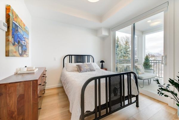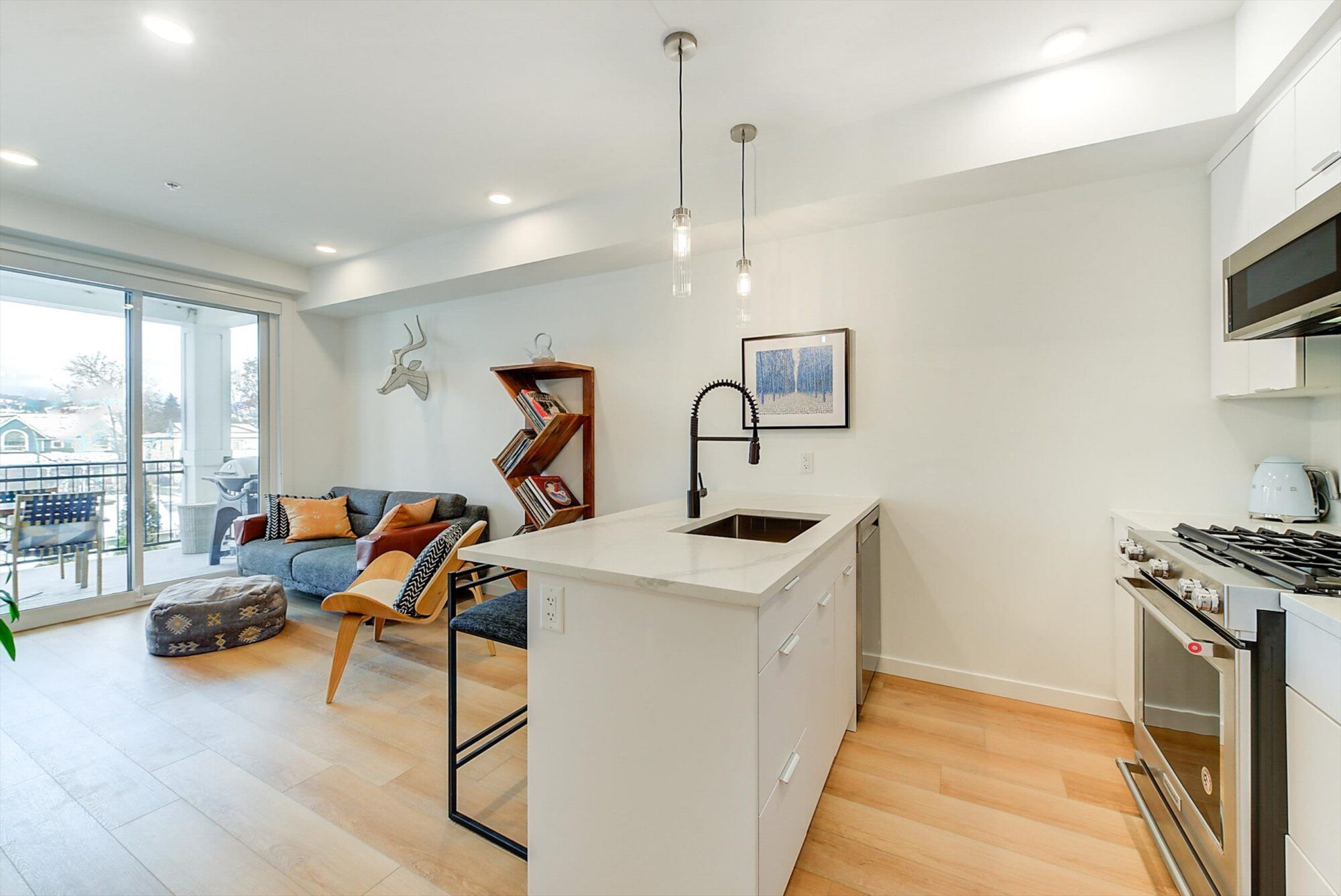 Built-in 2021, the unit offers 2 parking stalls and is strategically laid out to maximize space and features a large outdoor patio area accessed from both the living room and bedroom. Enjoy the Okanagan sun, lounging on the large deck with a BBQ hookup perfect for entertaining with plenty of room for a patio table and chairs. The unit is tastefully finished with vinyl flooring, white cabinetry, quartz countertops, and a custom front entry cabinet and coat rack. The kitchen is equipped with a 5-burner gas stove, a built-in microwave, and plenty of cabinet and counter space. The bedroom has a large sliding glass door to the patio and the unit is complete with a full bathroom and laundry.