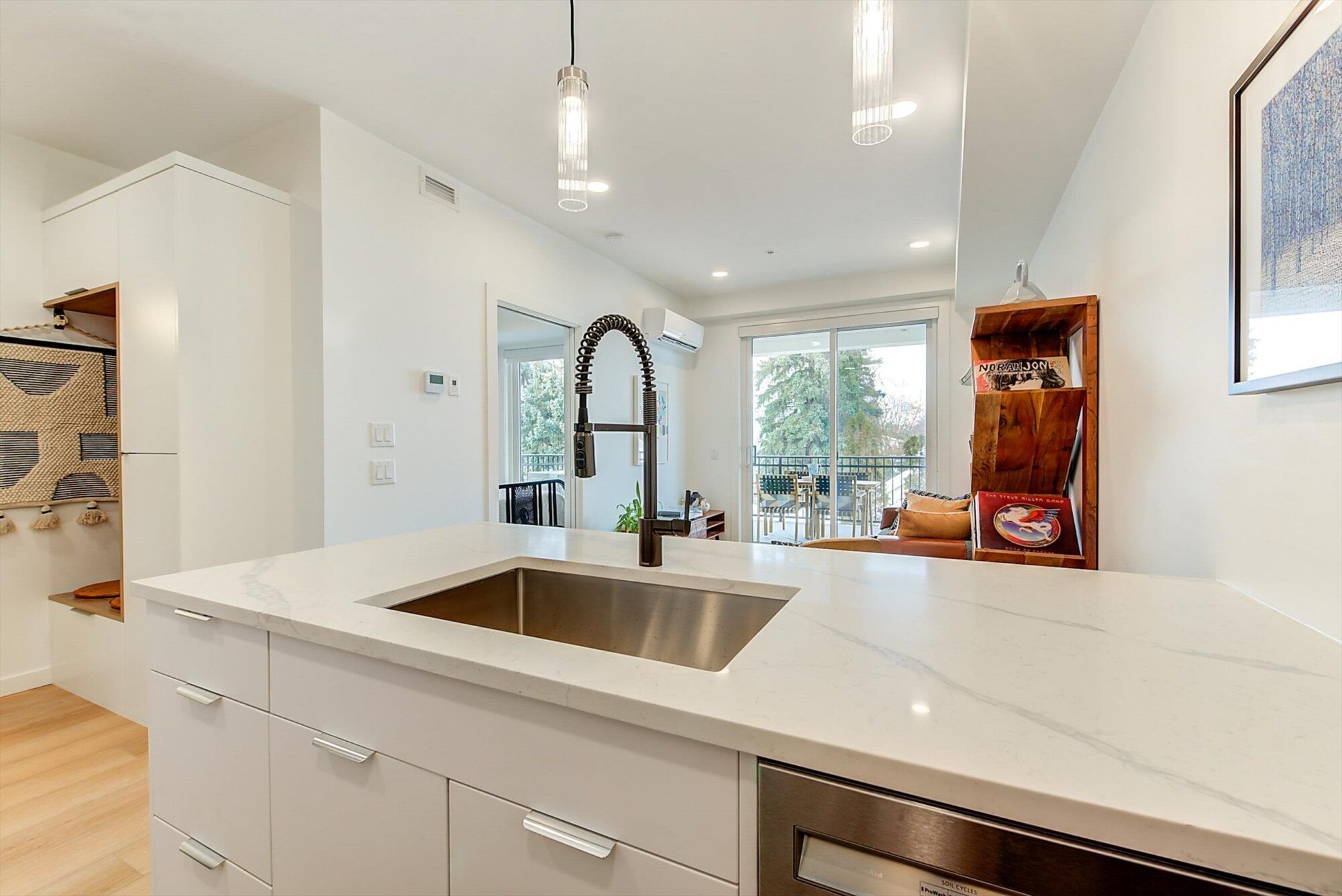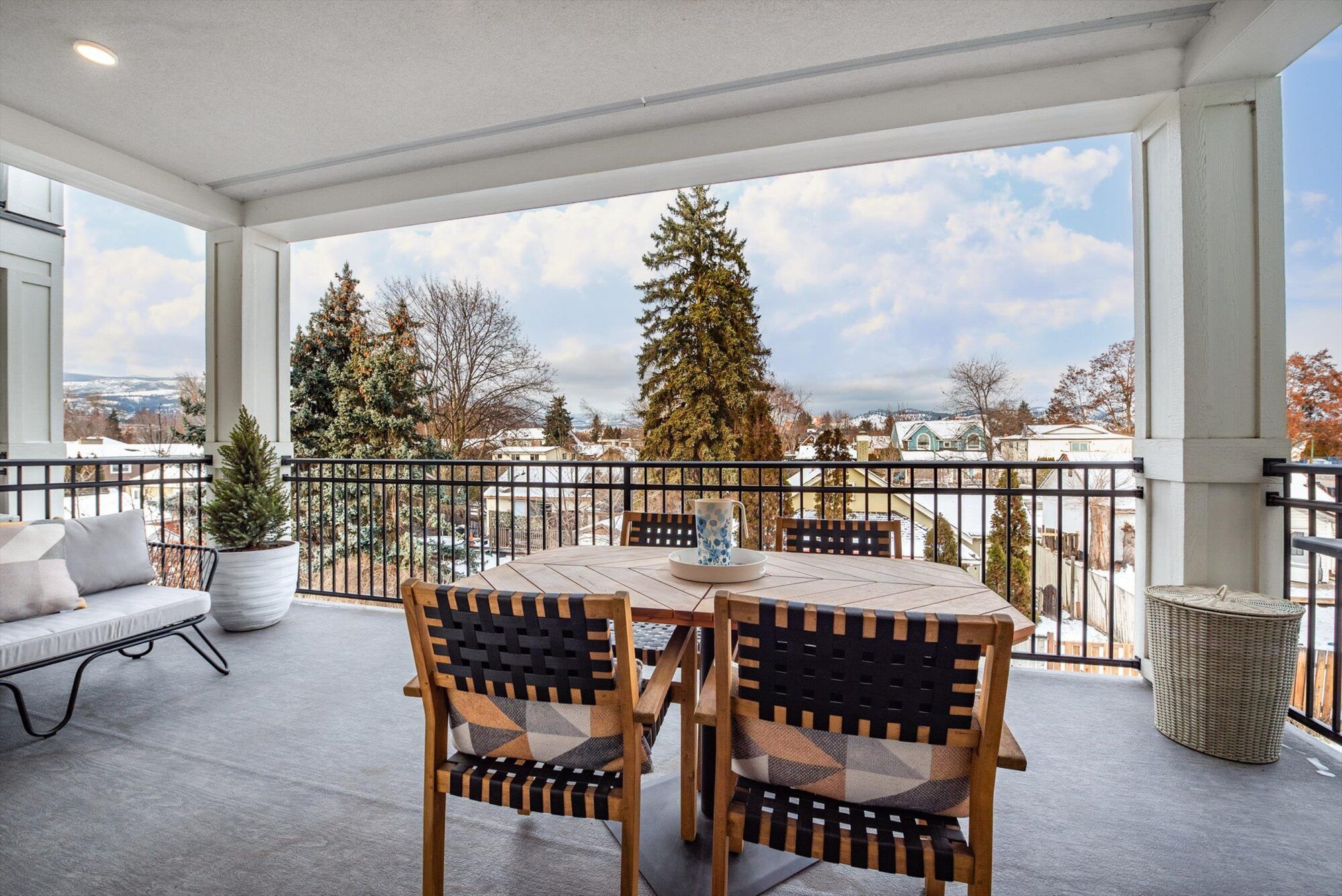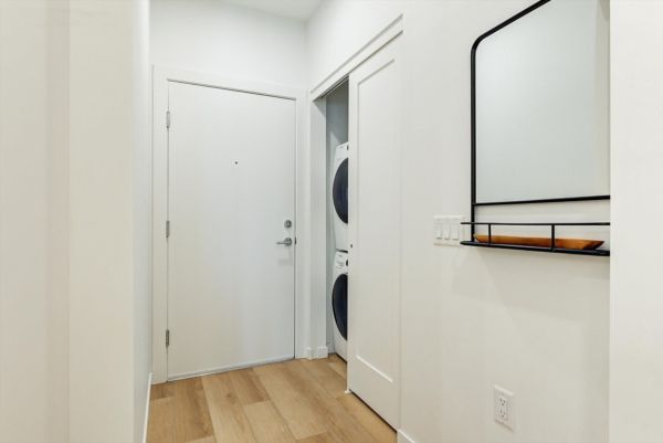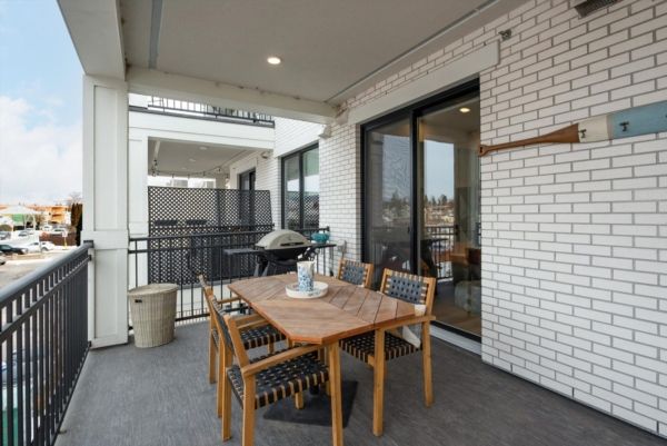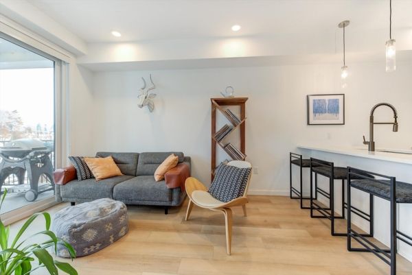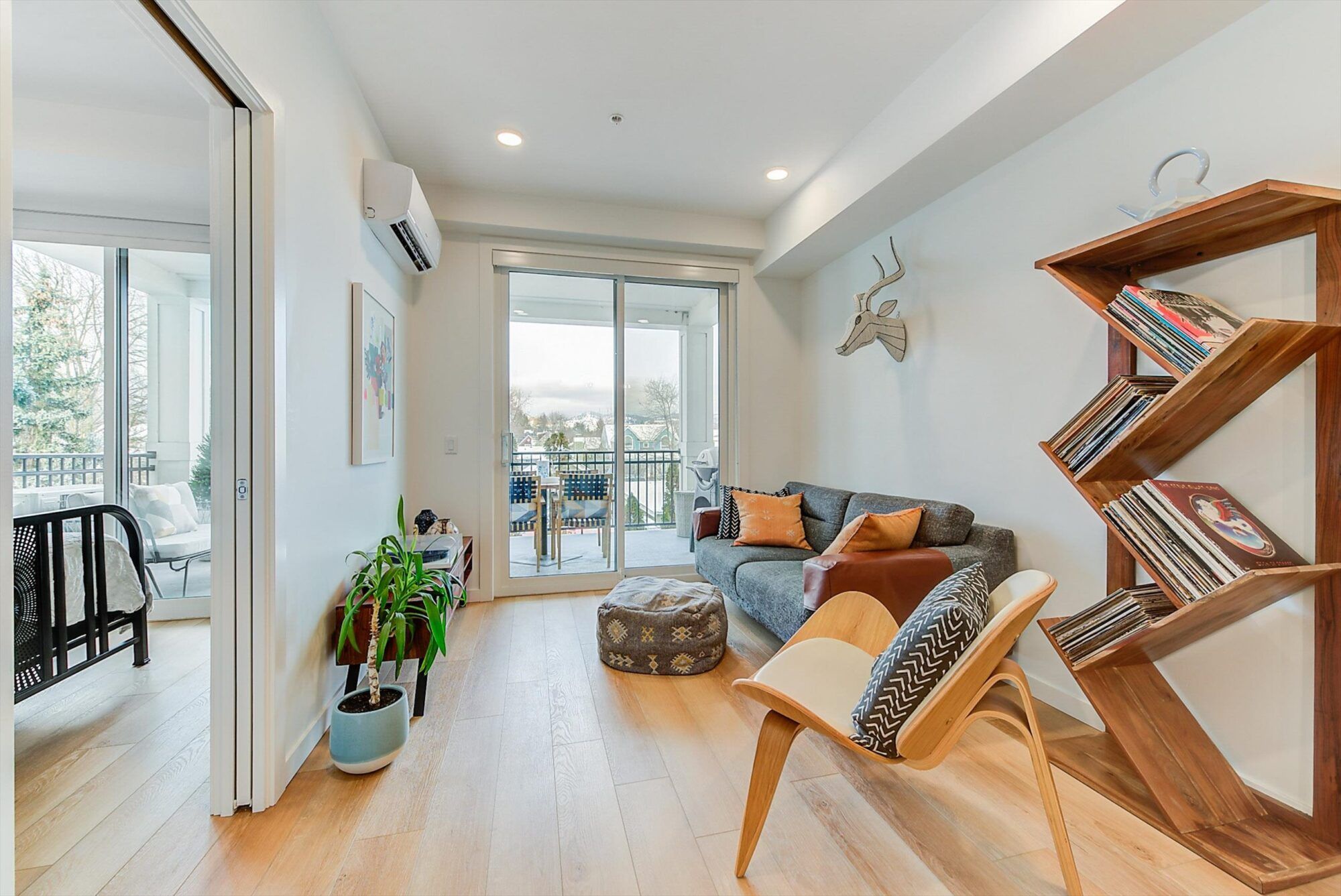 Built-in 2021, the unit offers 2 parking stalls and is strategically laid out to maximize space and features a large outdoor patio area accessed from both the living room and bedroom. Enjoy the Okanagan sun, lounging on the large deck with a BBQ hookup perfect for entertaining with plenty of room for a patio table and chairs. The unit is tastefully finished with vinyl flooring, white cabinetry, quartz countertops, and a custom front entry cabinet and coat rack. The kitchen is equipped with a 5-burner gas stove, a built-in microwave, and plenty of cabinet and counter space. The bedroom has a large sliding glass door to the patio and the unit is complete with a full bathroom and laundry.