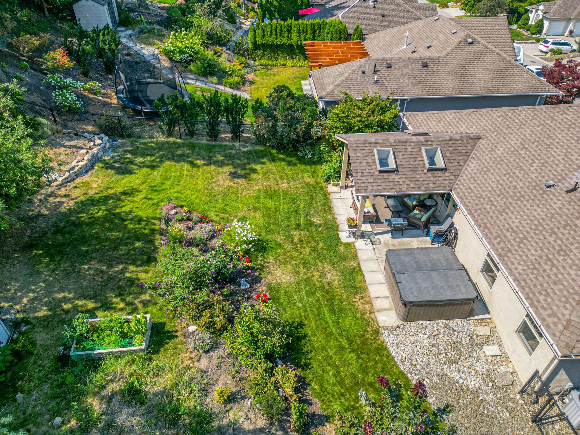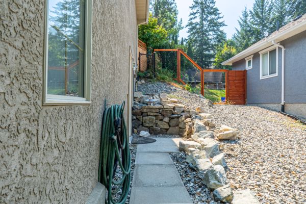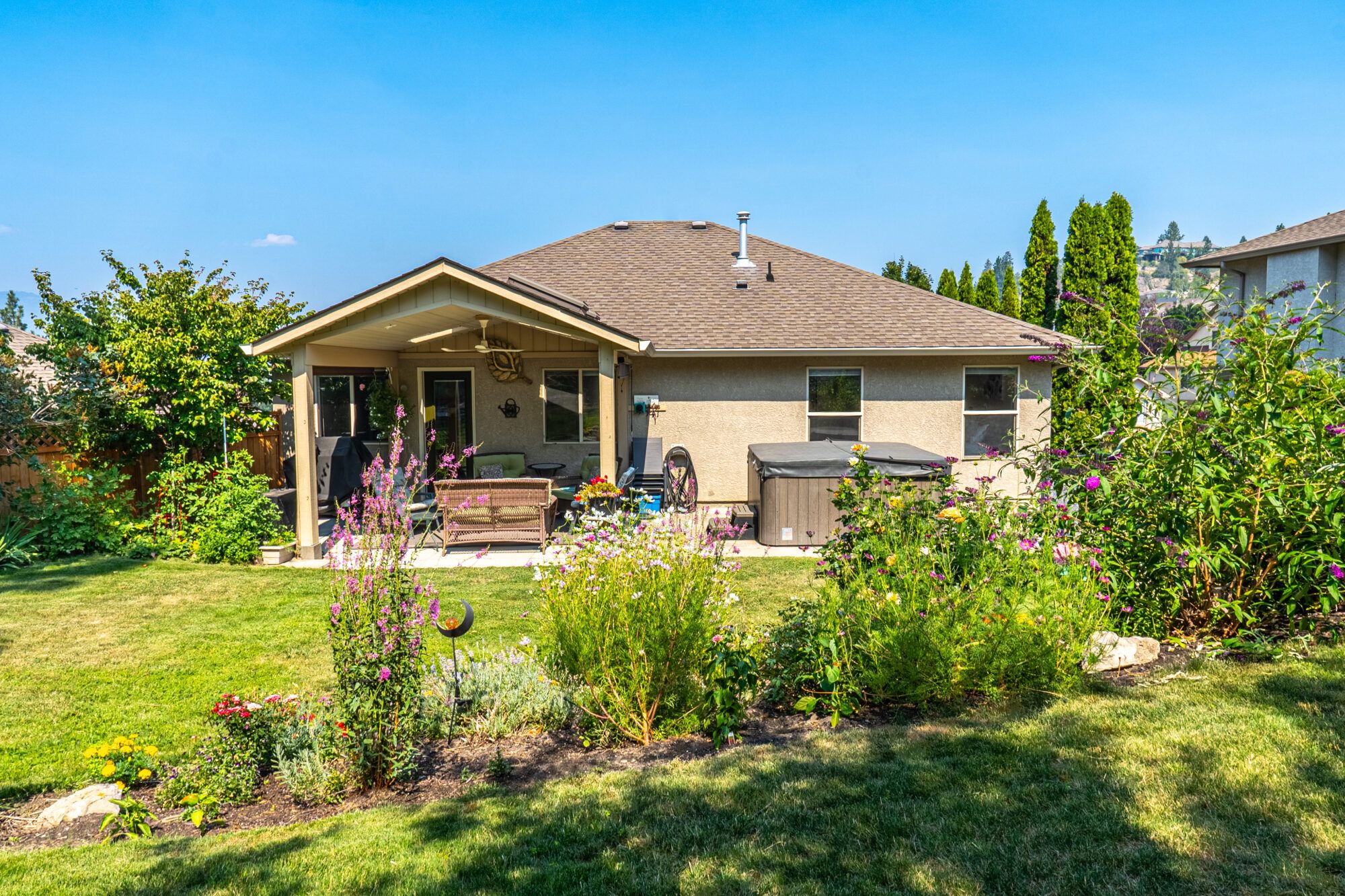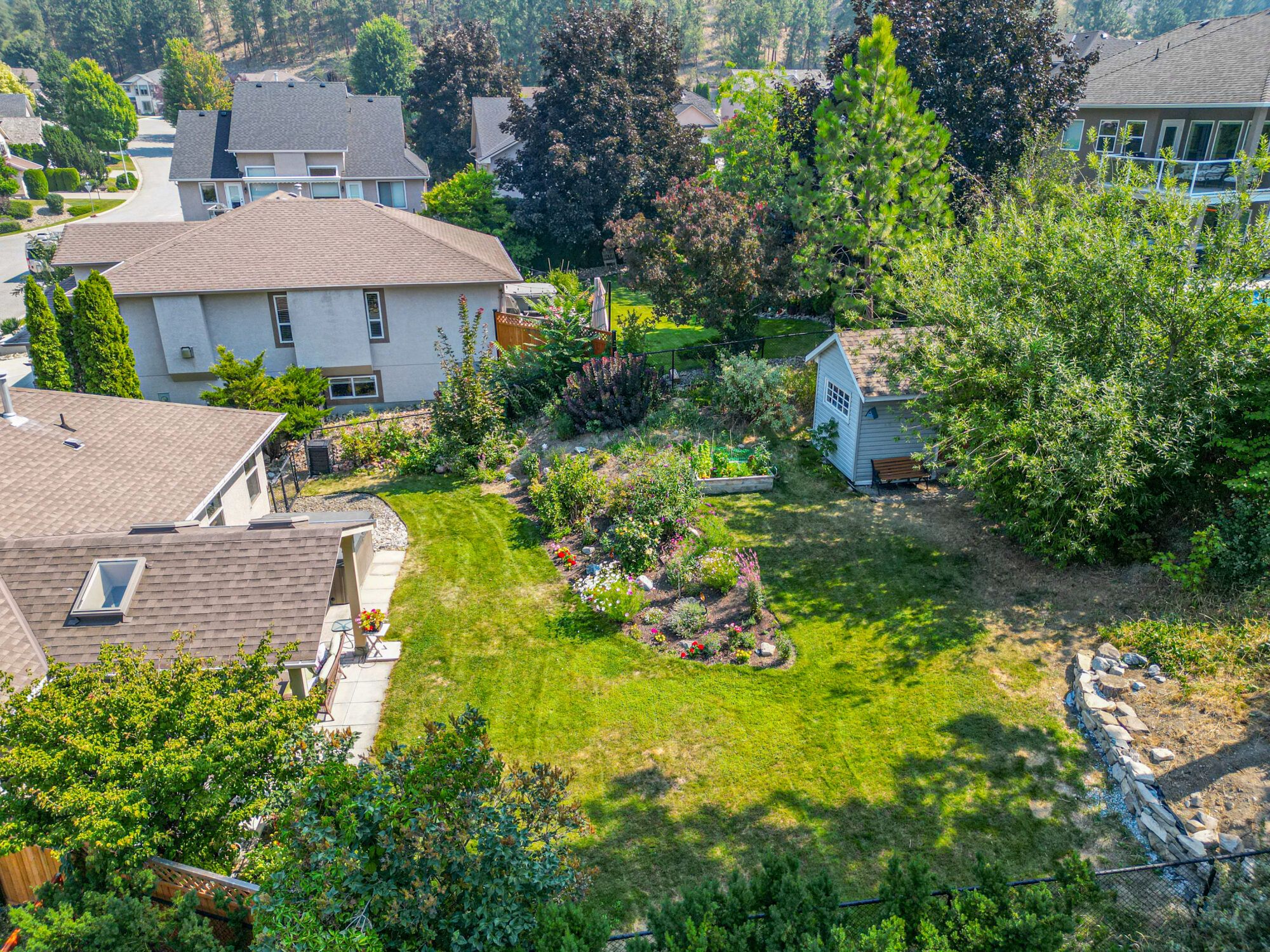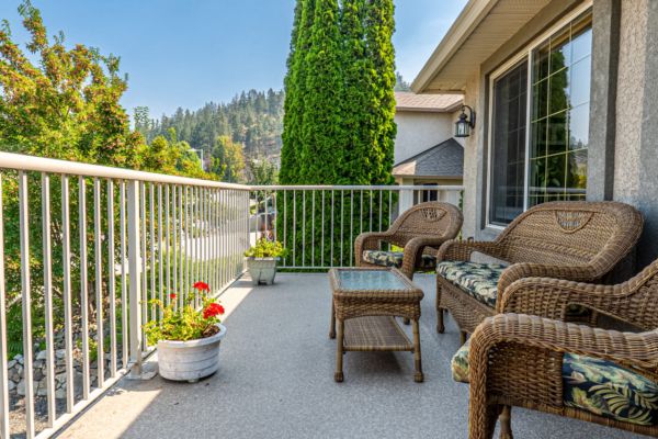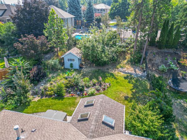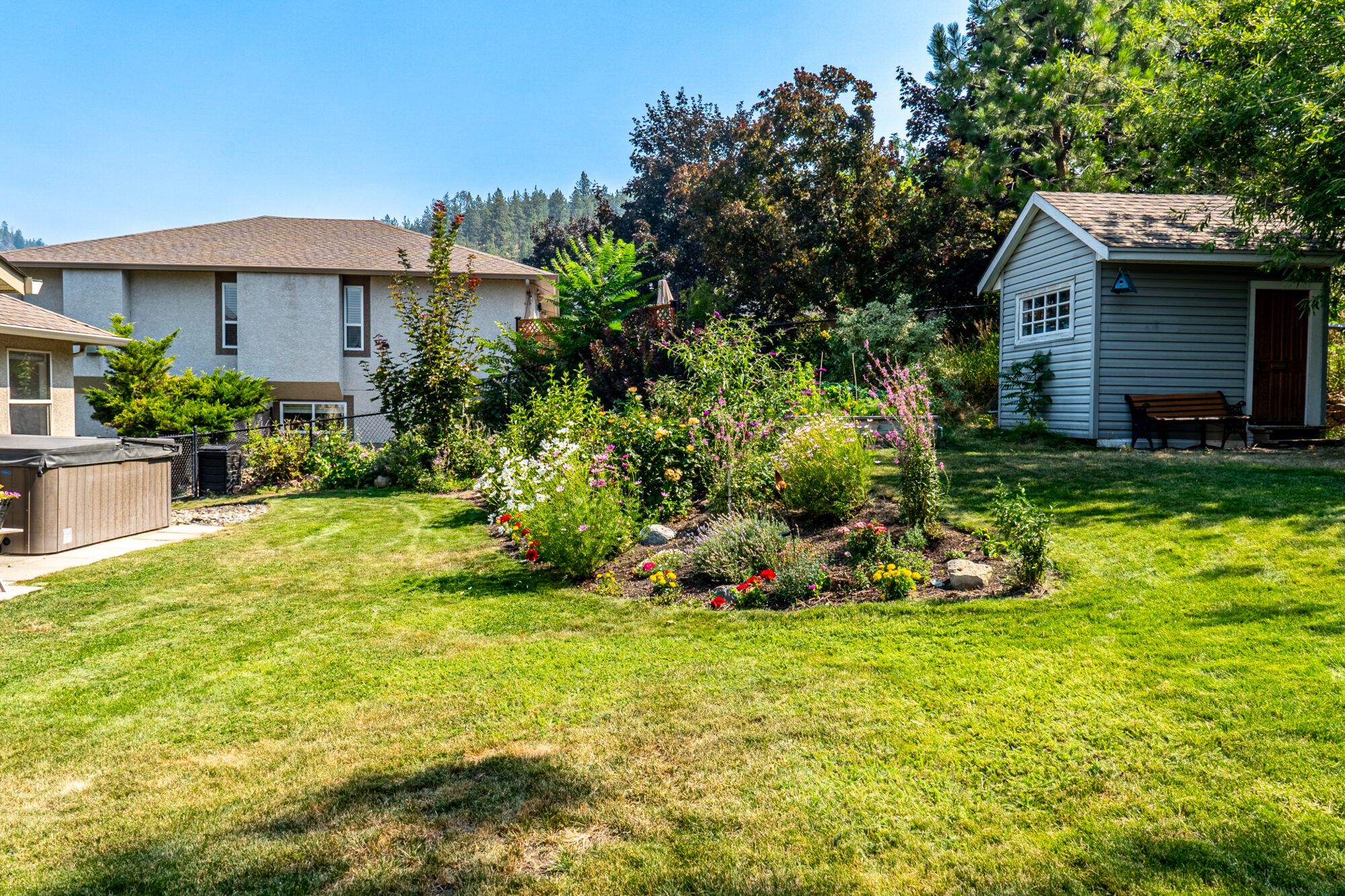 The allure of the main level extends beyond its interiors, flowing into the expansive backyard. Recently enhanced by the addition of a covered patio, this outdoor space becomes an extension of your living area. It provides the ideal setting to savor the balmy Okanagan summers, creating cherished moments with friends and family against the backdrop of a thriving garden.