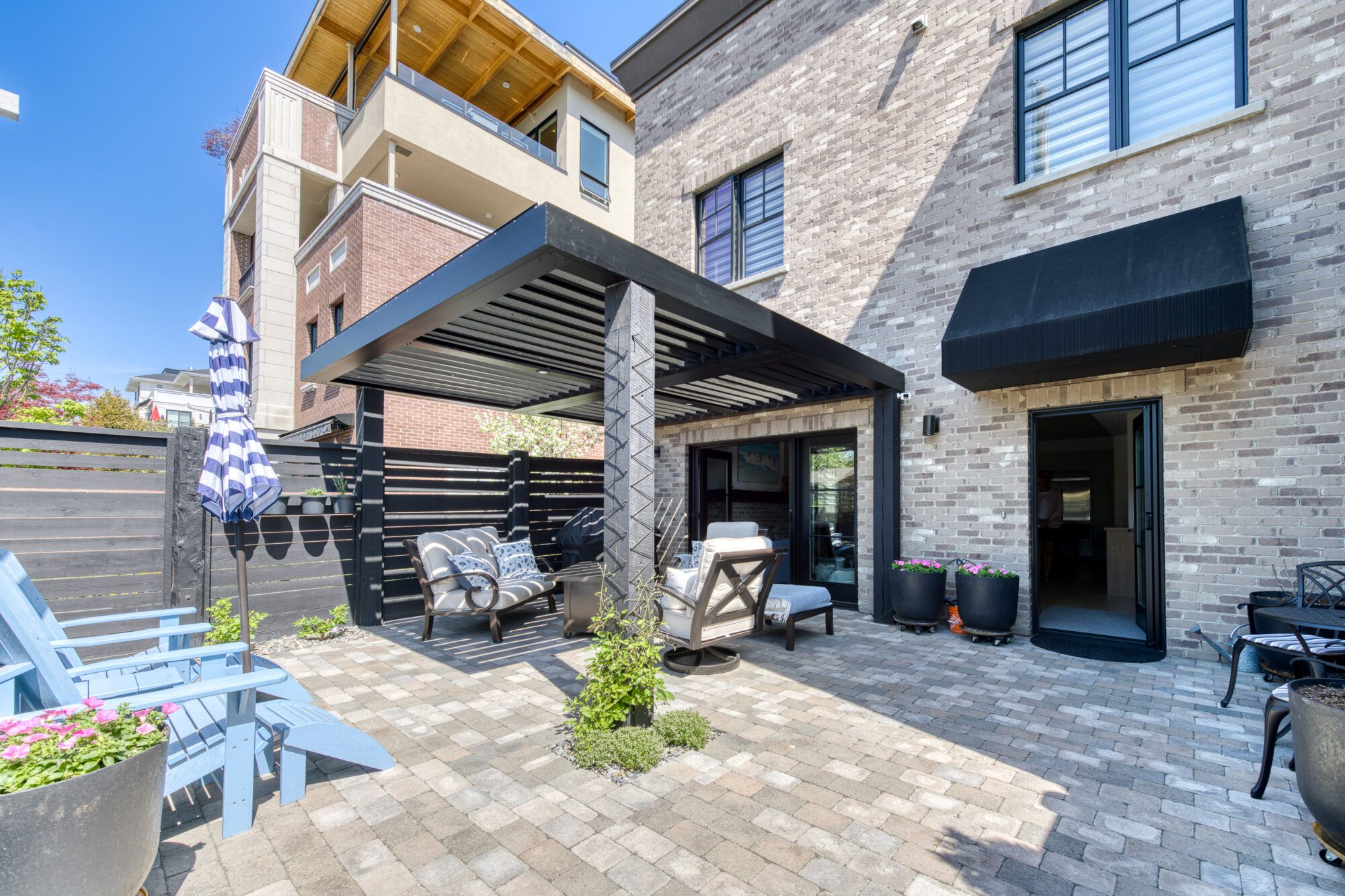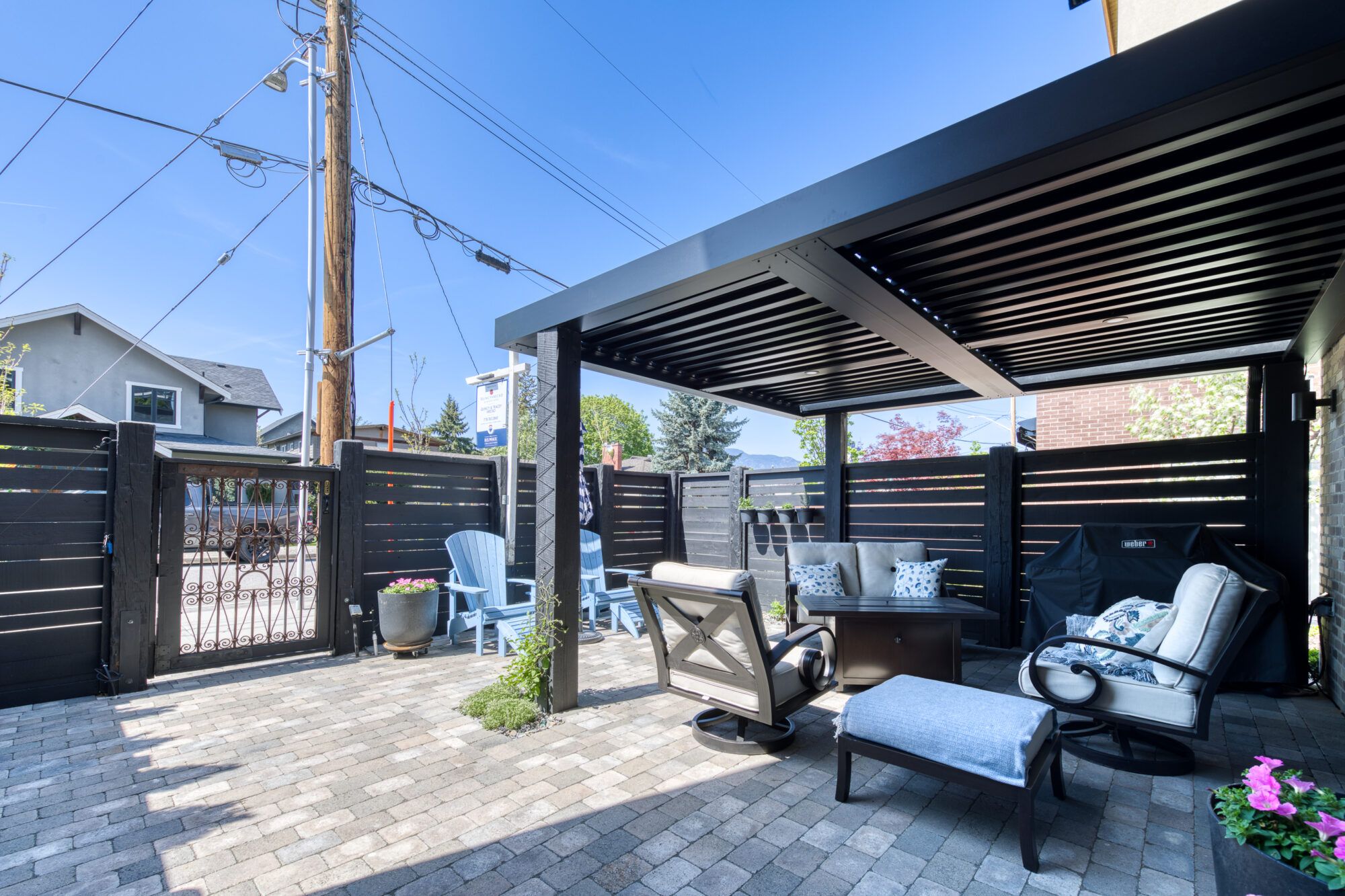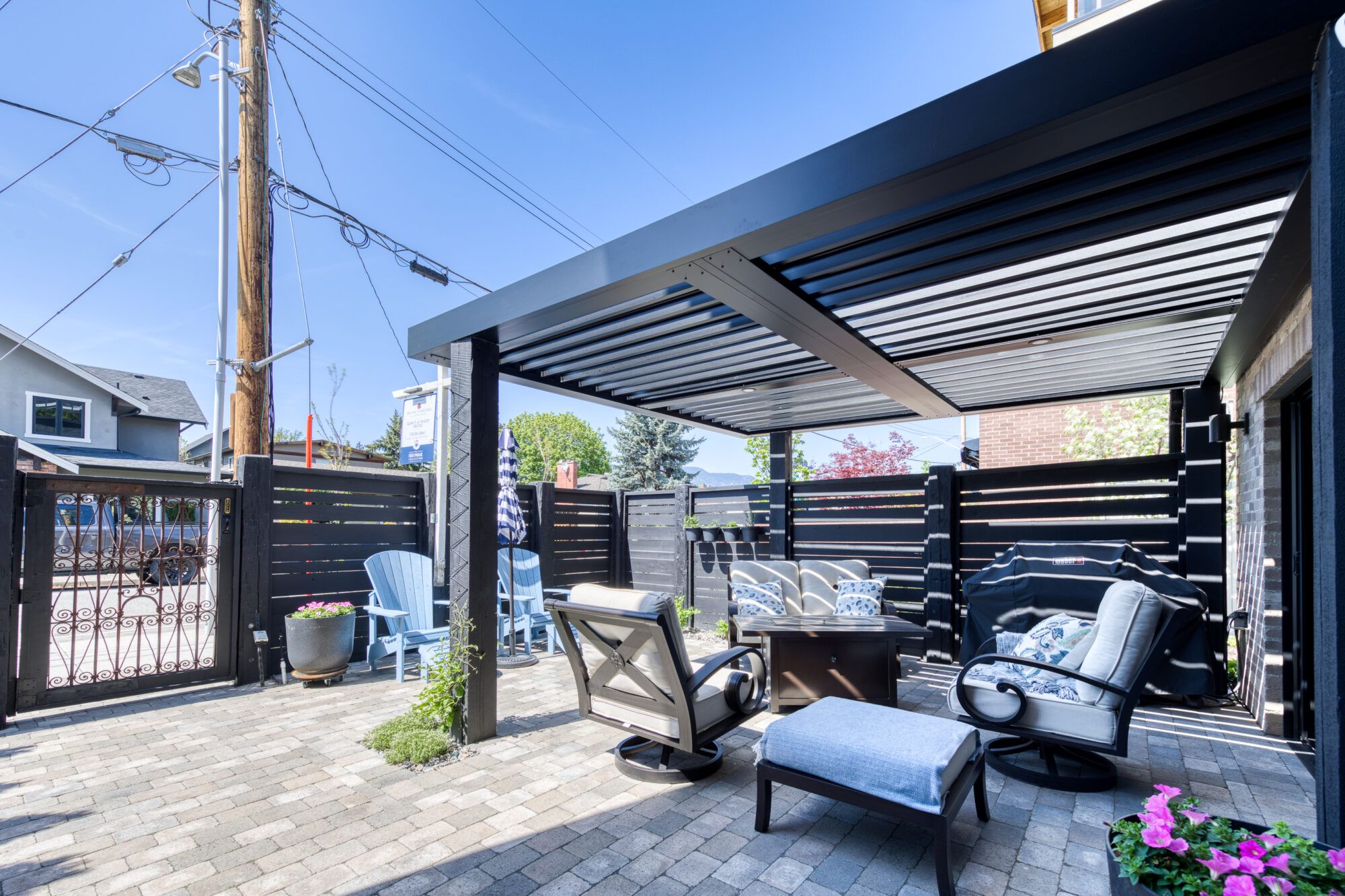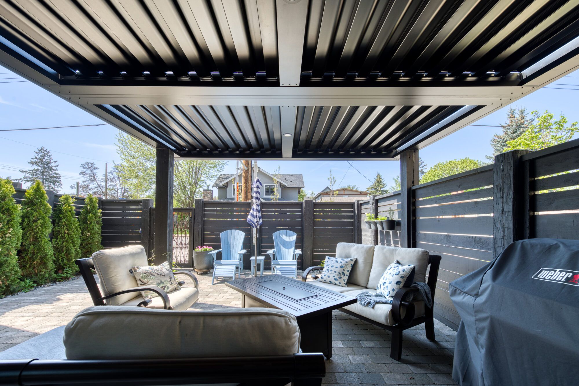 The patio is framed by a rich wood pergola and towering cedars allowing for light while offering privacy. The patio oasis houses a large 22 x 24 (500 sq. ft) patio area along with a covered powered louver pergola measuring 13 x 12 (150 sq. ft), which can be opened or closed to be fully weatherproof perfect for those rainy and snowy days! The gate to the patio is a one-of-a-kind piece of art from Nepal, made from hand-forged steel, a showstopper from the moment you arrive.