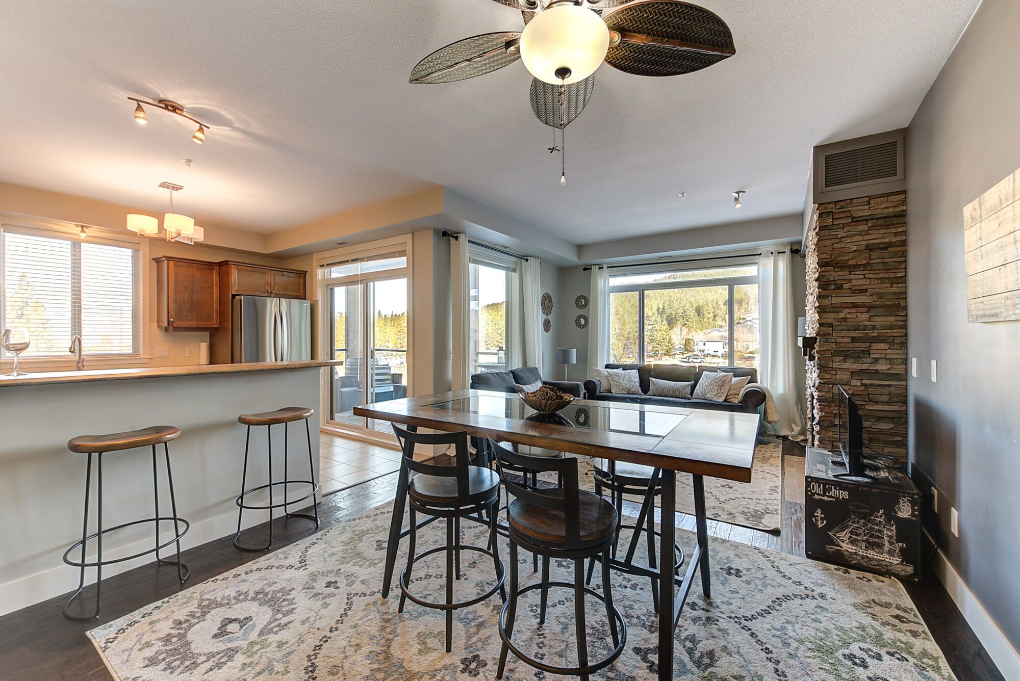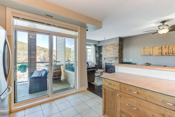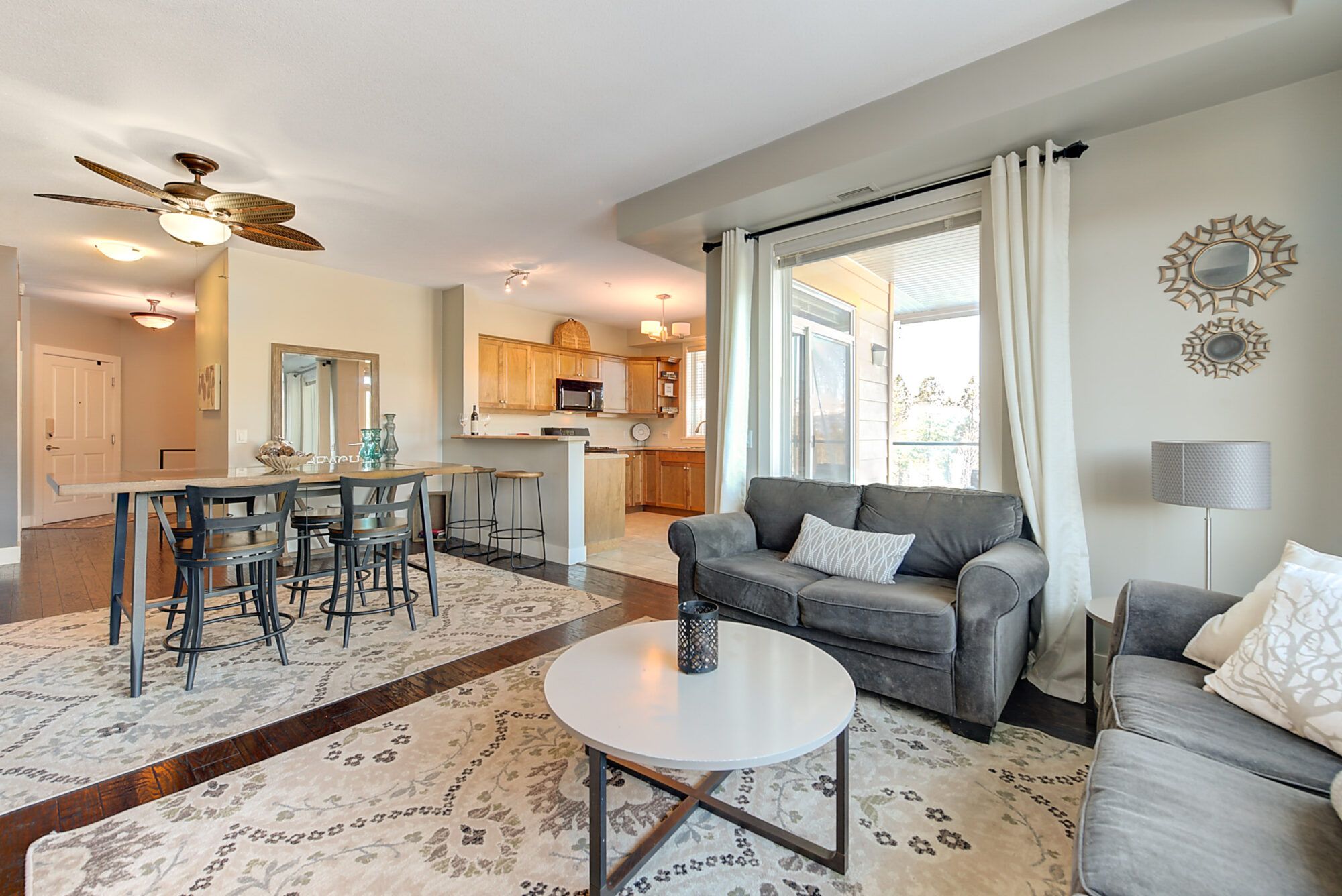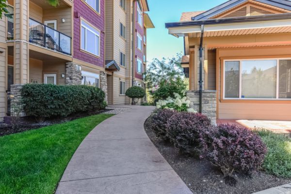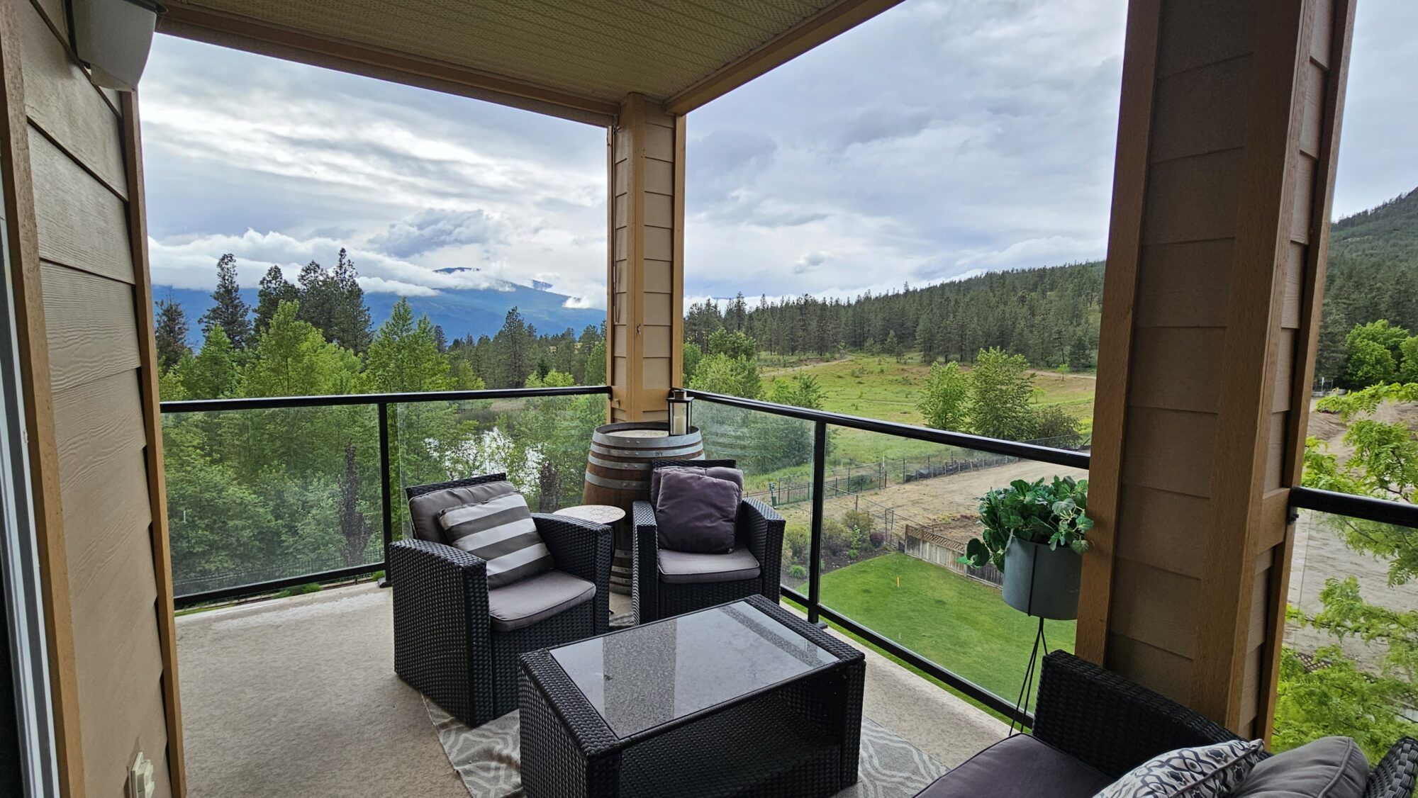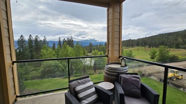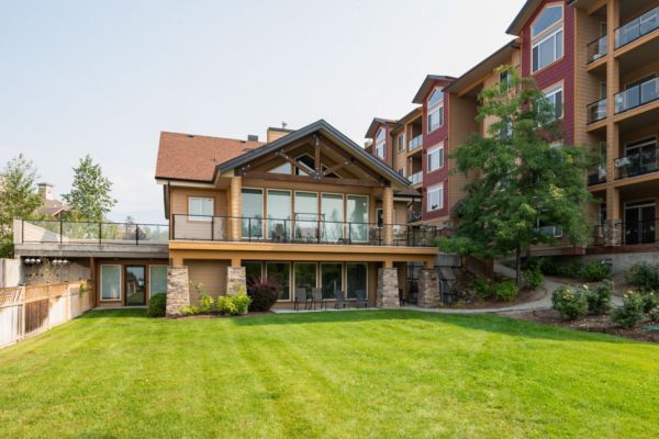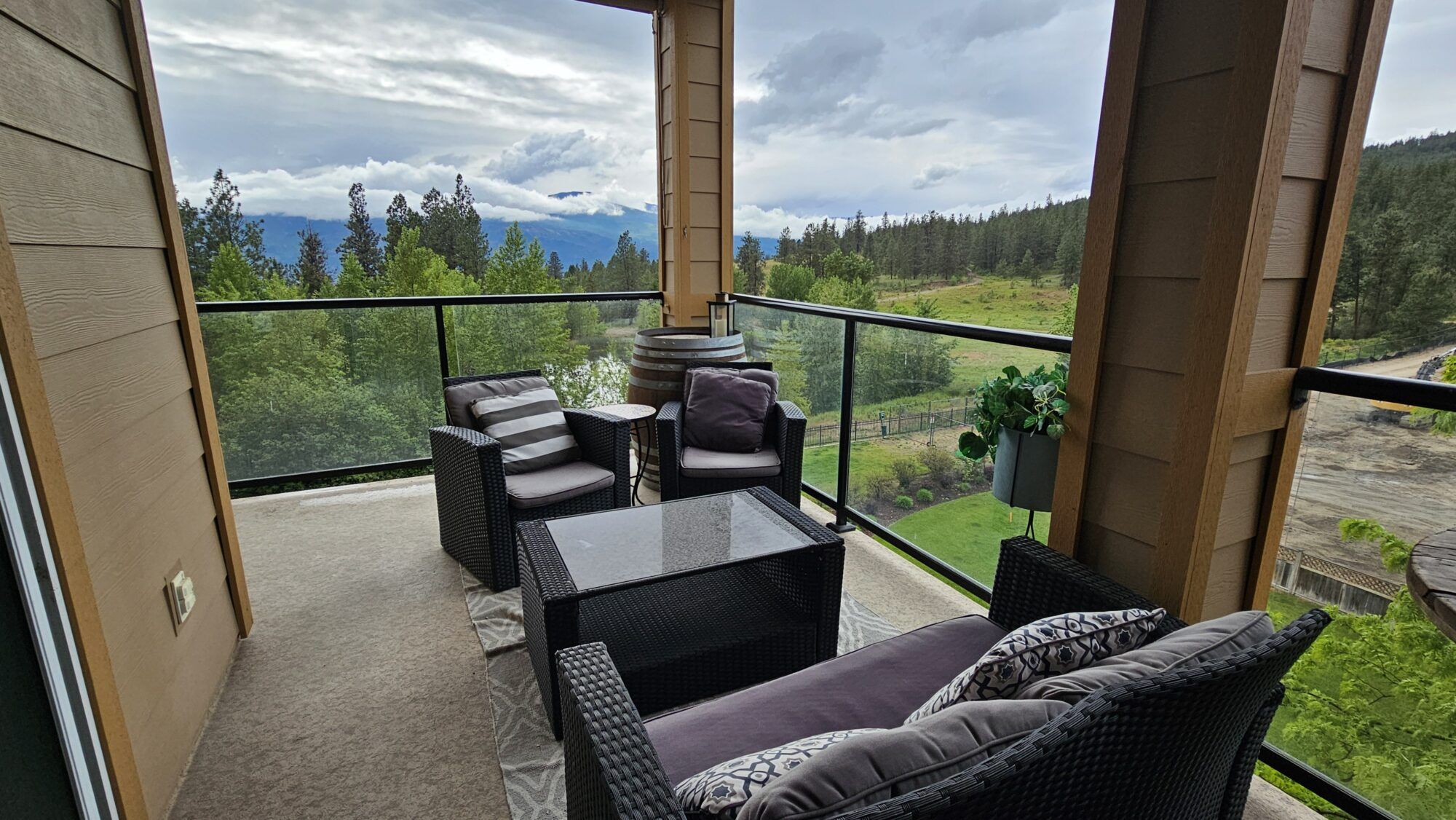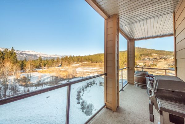 318 2532 Shoreline DriveThe spacious wrap-around deck gives another 300 sq.ft of outdoor living perfect for enjoying the Okanagan summers.  The unit is perfectly positioned to capture incredible views of the sun setting over the mountains and overlooking the pond.  The outdoor living area has complete privacy to enjoy a quiet summer evening while taking in the views.