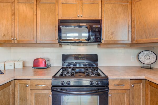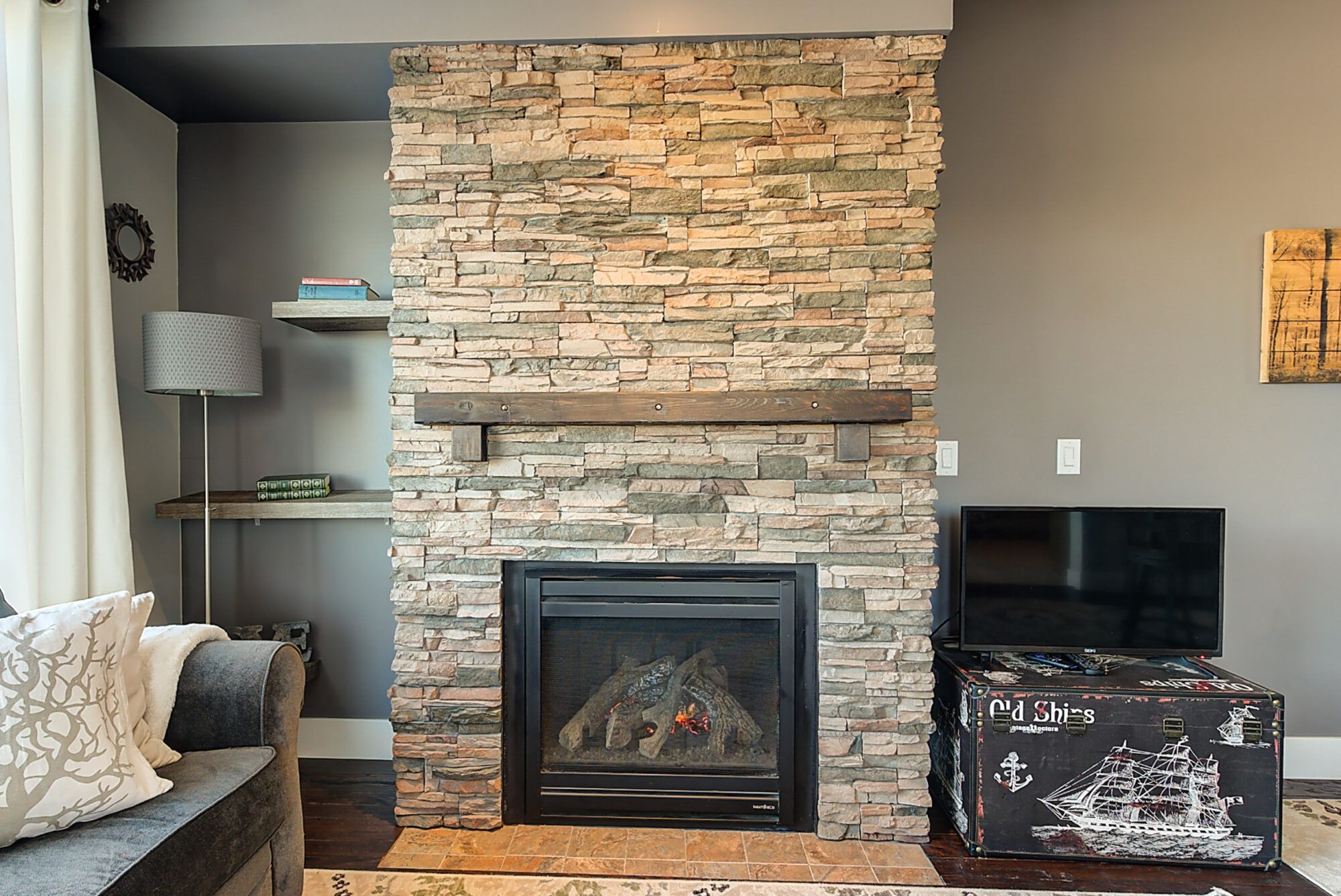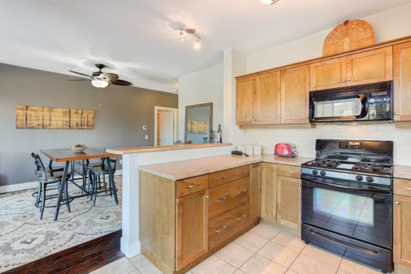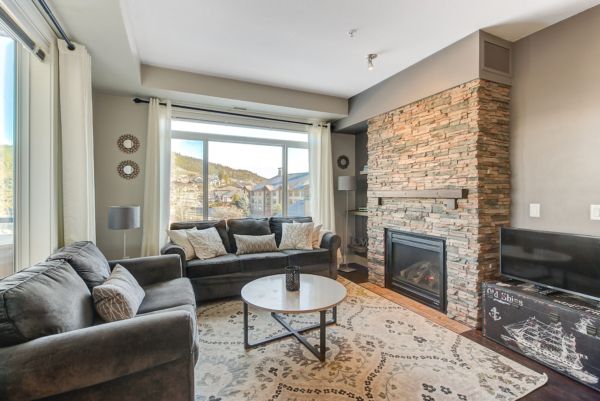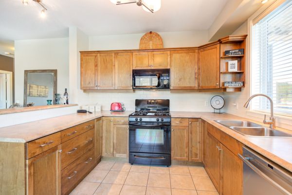 The main living area is an open concept with spacious living, dining, and kitchen.  The living room has a cozy gas fireplace with floor-to-ceiling stone surround.  The dining room is conveniently located next to the kitchen, perfect for entertaining.  The full-size kitchen has plenty of counter and storage space with a gas range and a brand-new LG refrigerator.  This area has direct access to the patio and offers oversized picture windows that allow the room to flood with light while offering great views.