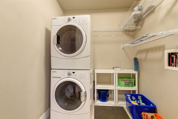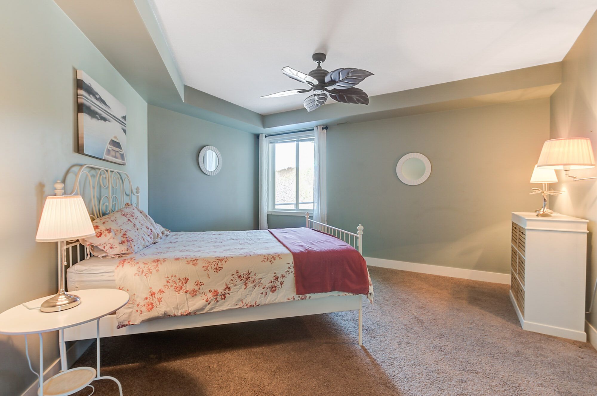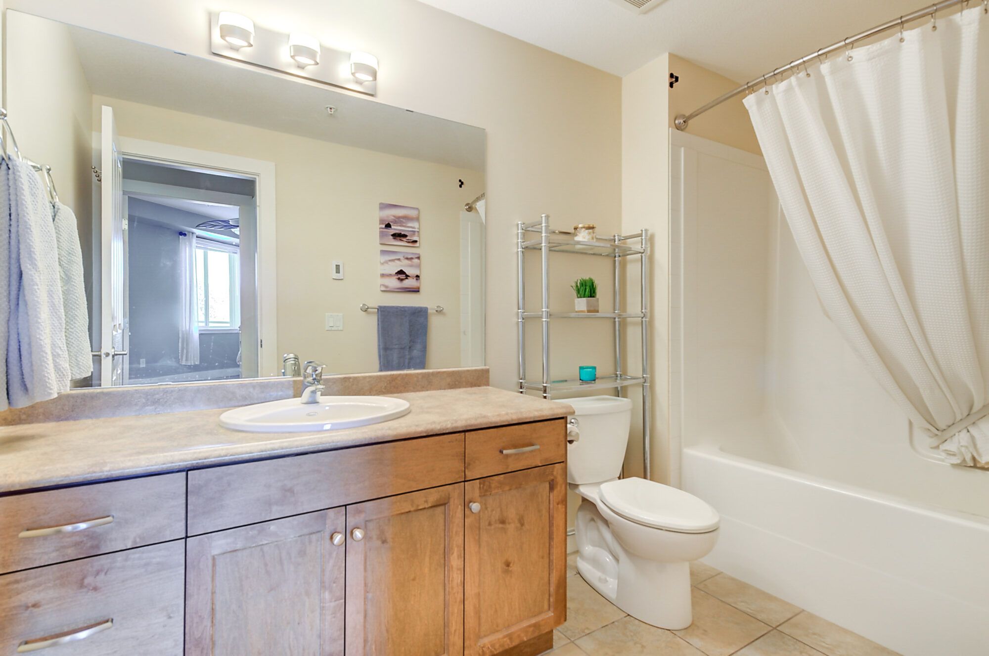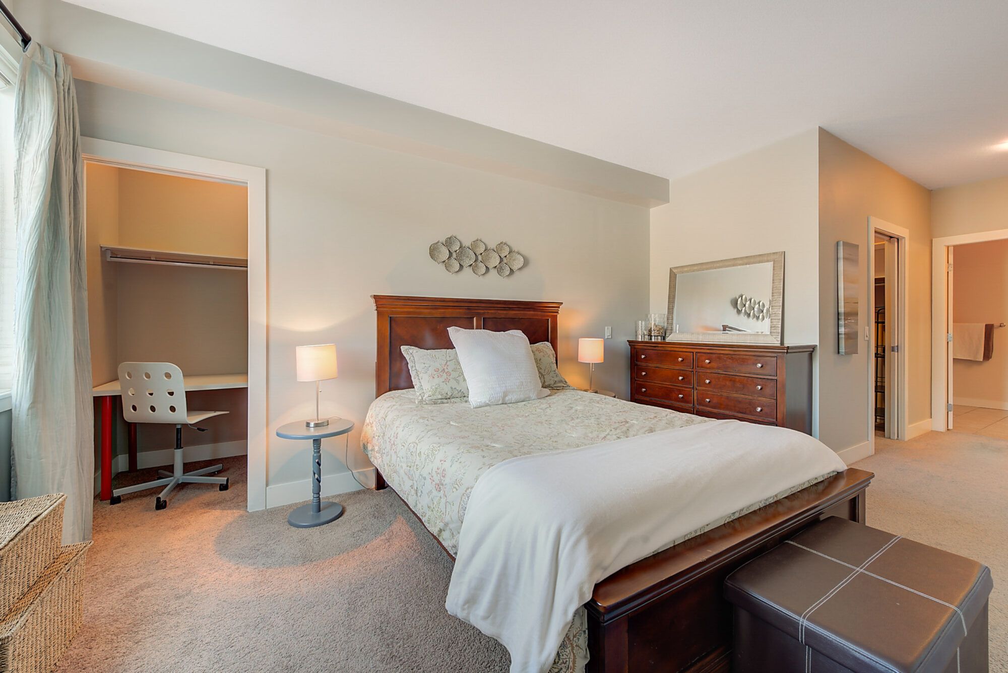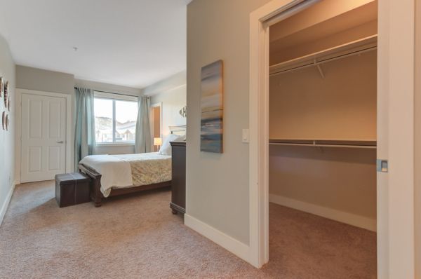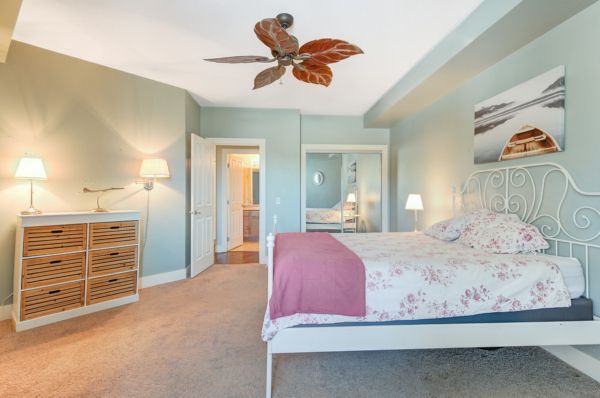 This Lake Country condo has the most desirable layout with 2 oversized bedrooms on either side of the living space.  The primary bedroom is off to the right and has 2 walk-in closets (one used as a small home office).  The ensuite has a large soaker tub and a separate shower. The second bedroom is on the left side of the unit and can fit 2 queen size beds comfortably.  There is a second bathroom just off the bedroom and a large laundry room with storage.