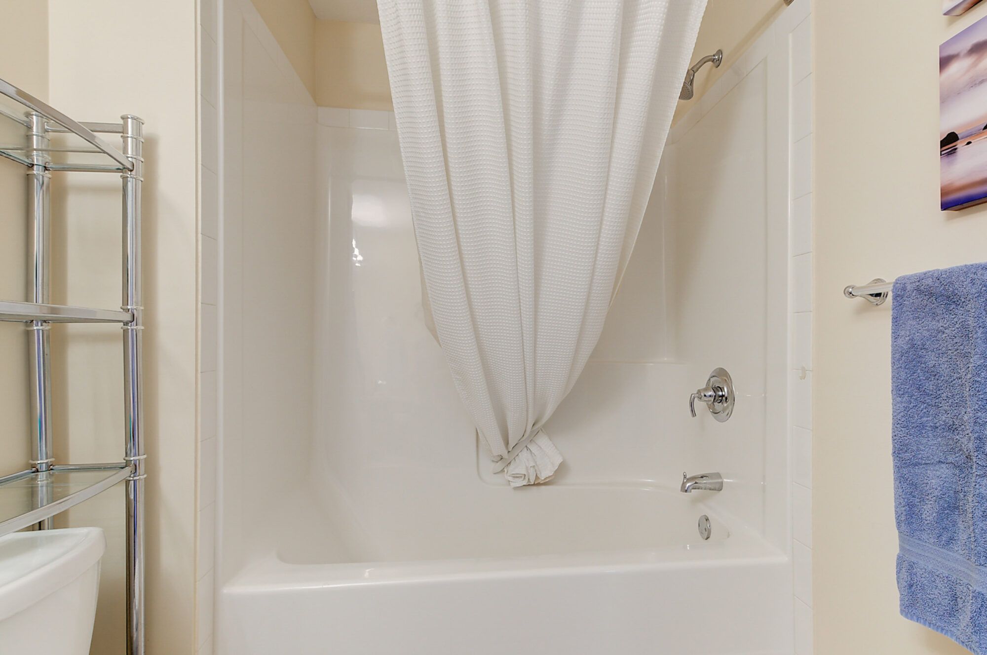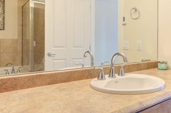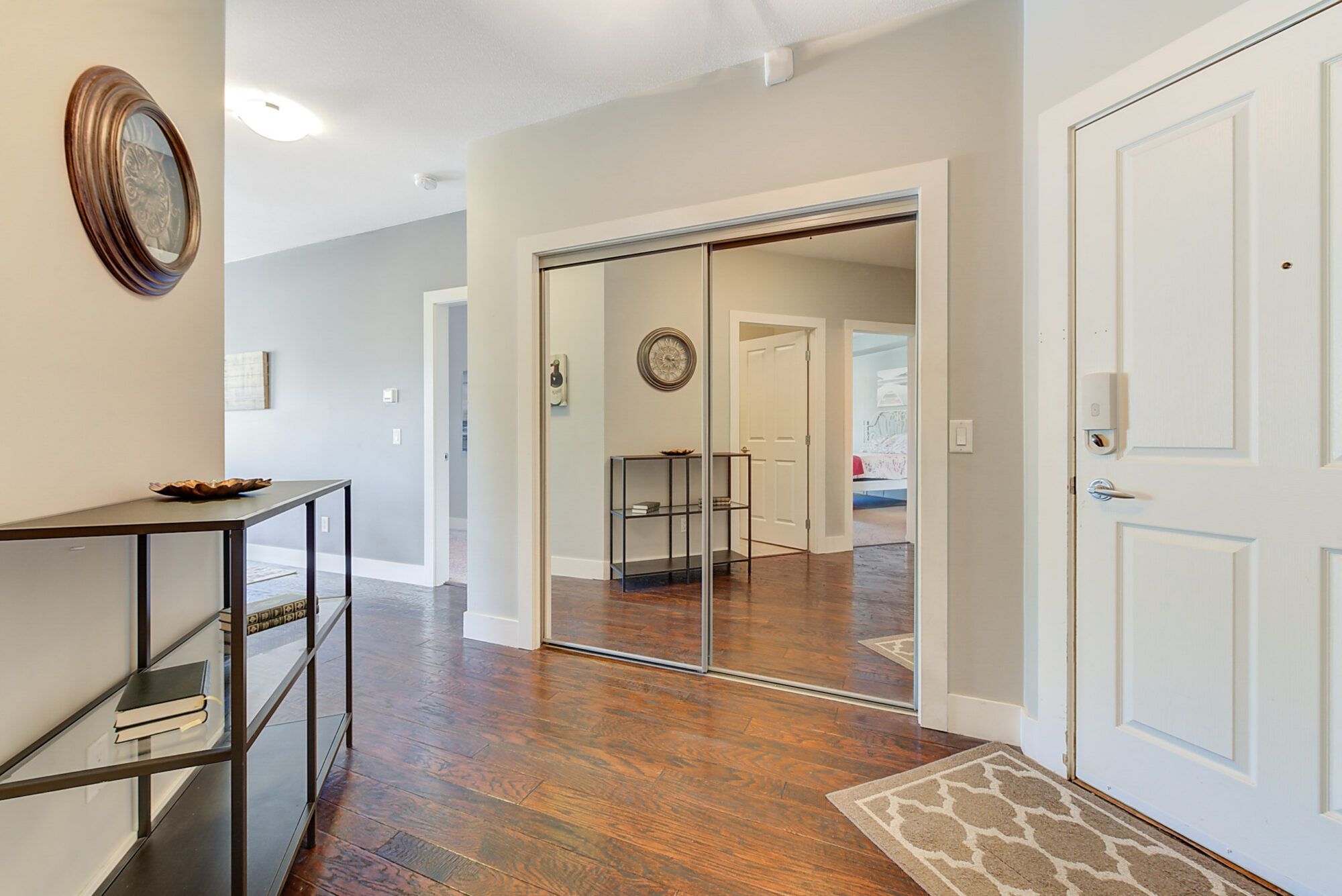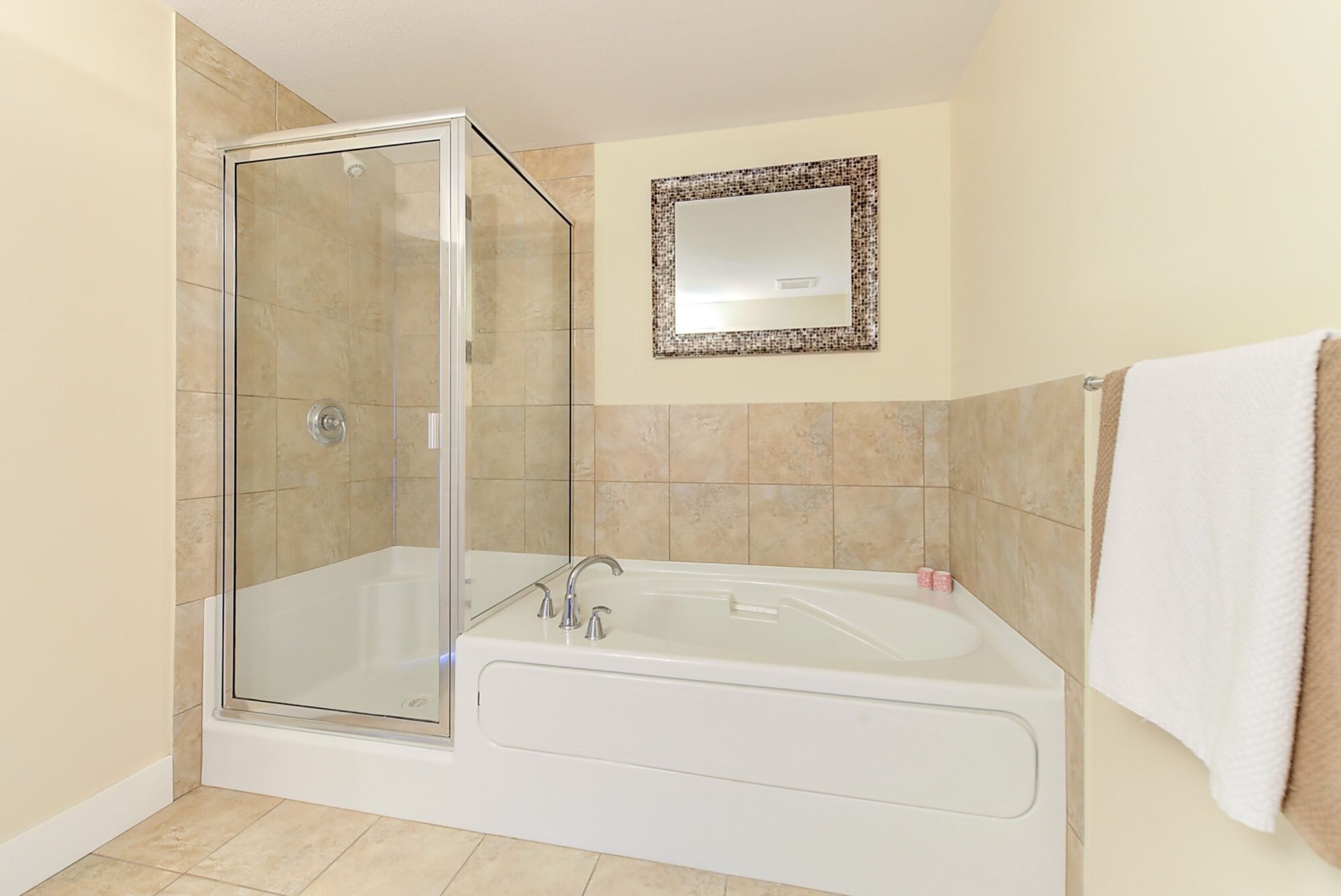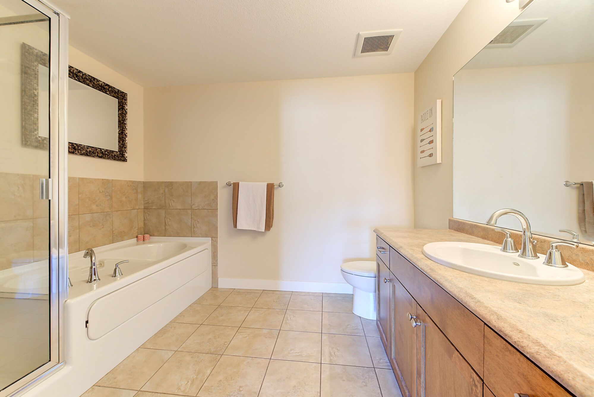 This Lake Country condo has the most desirable layout with 2 oversized bedrooms on either side of the living space.  The primary bedroom is off to the right and has 2 walk-in closets (one used as a small home office).  The ensuite has a large soaker tub and a separate shower. The second bedroom is on the left side of the unit and can fit 2 queen size beds comfortably.  There is a second bathroom just off the bedroom and a large laundry room with storage.