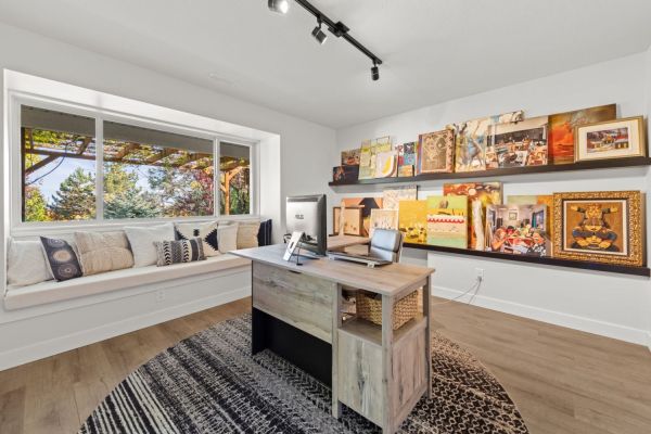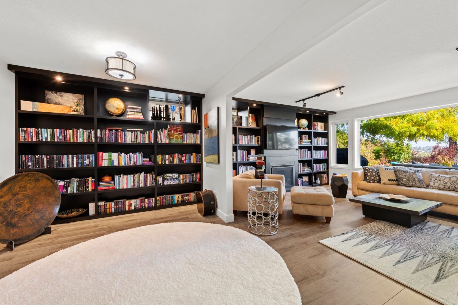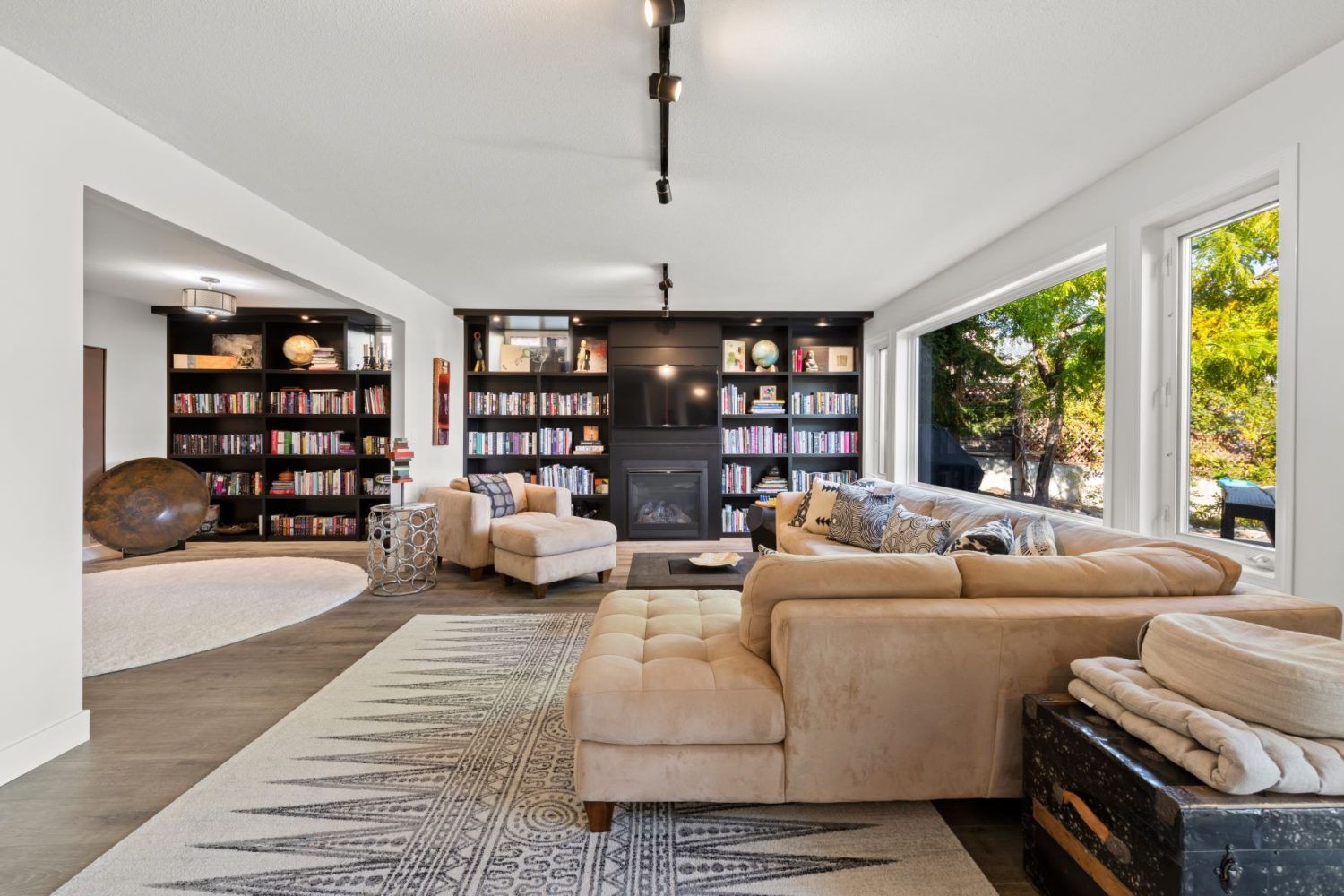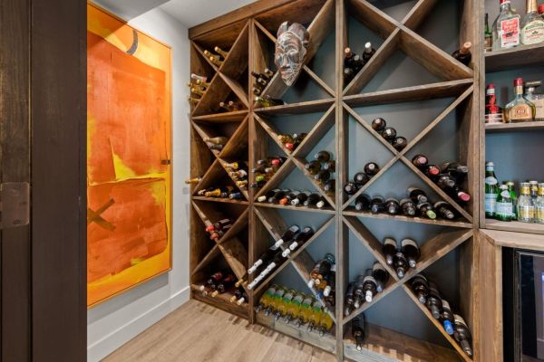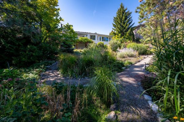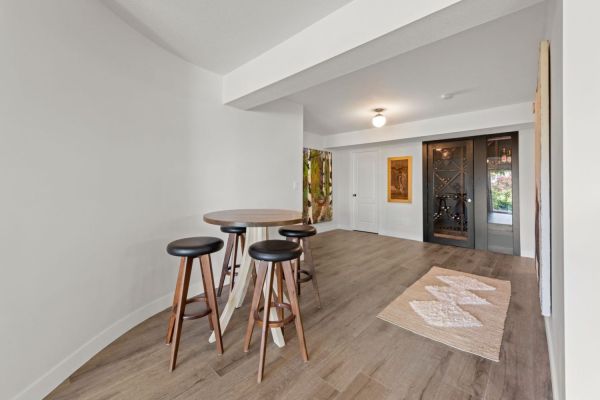 The spiral staircase leads you to the lower level which is equally impressive and bright. The 600-bottle capacity wine room gives a mix of traditional and contemporary looks to this level. The hallway leads to two spacious bedrooms, a full bathroom, and a bright family room with custom wood built-in shelving. This level is complete with a spacious den; a perfect choice for a home office overlooking lush year-round greenery through the large windows. Walk out to the patio to enjoy a glass of wine in the cozy seating area amidst the stunning landscaping that celebrates the Okanagan charm all year round!