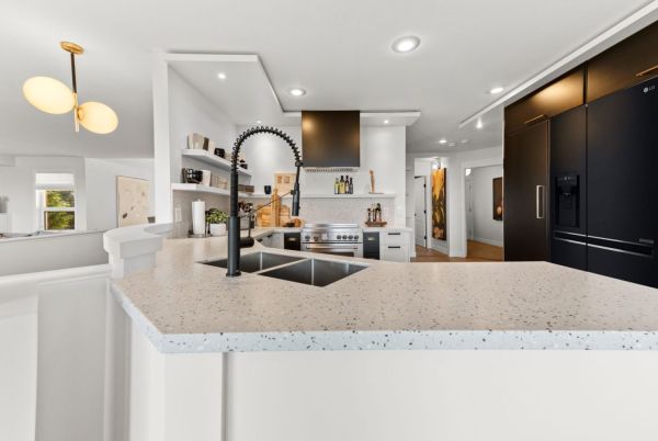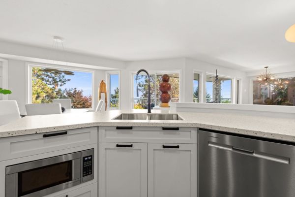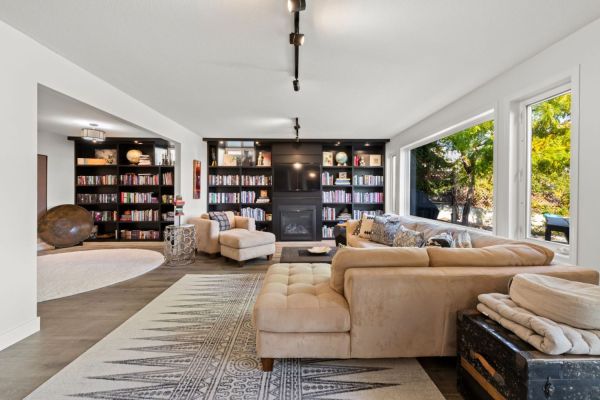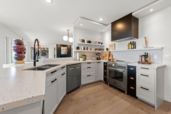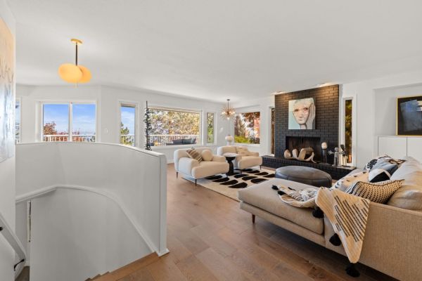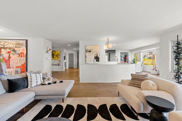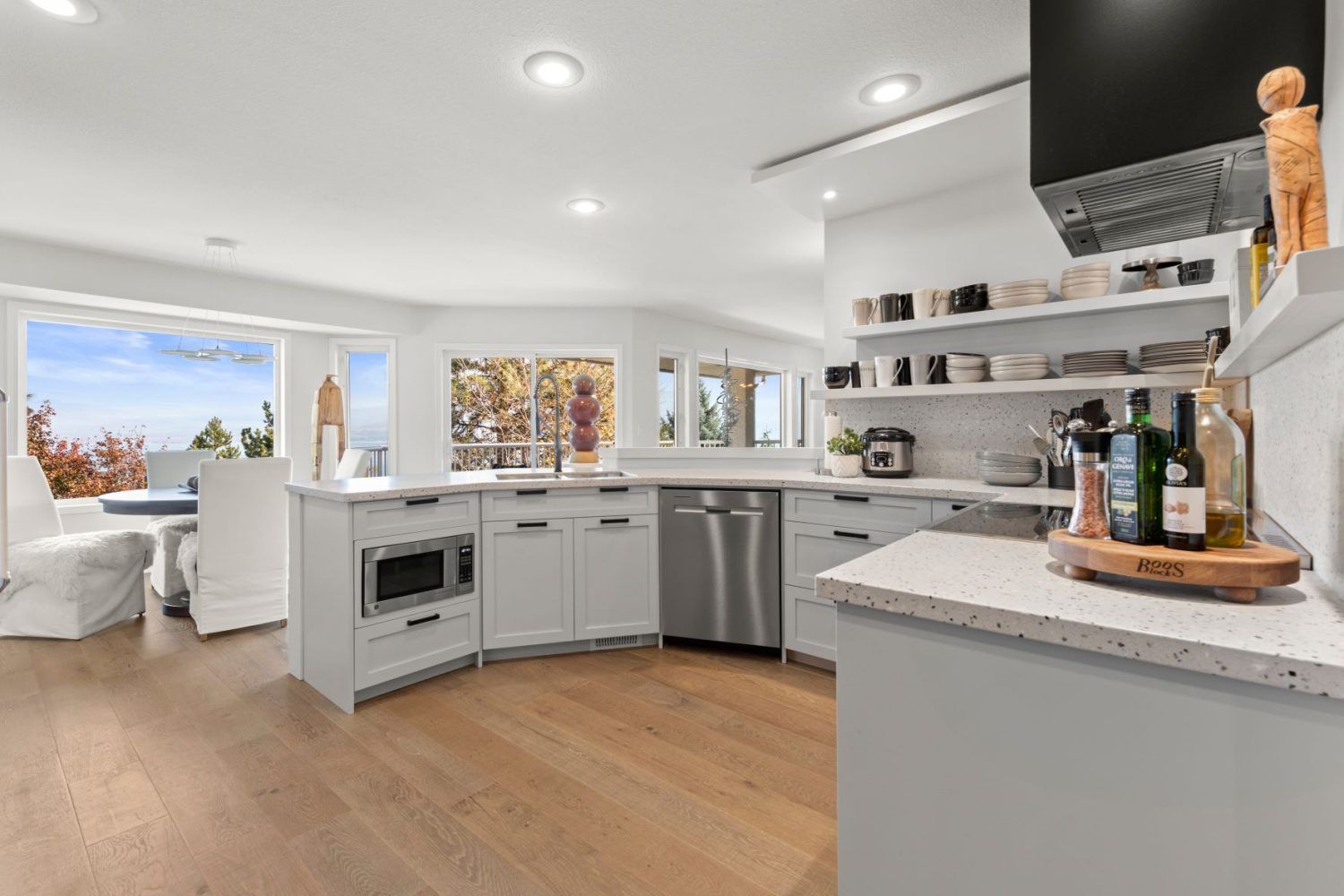 Completely updated 3100 sq ft rancher with walkout basement, boasts 3 bedrooms and den, 2.5 bathrooms, and has abundant space for gatherings and many areas to relax and entertain guests. The large living area has plenty of natural light and features a contemporary wood-burning fireplace that’s a real showstopper. This area opens to the dining room, complimented by a designer chandelier and large bay windows. The kitchen features open floating shelves and terrazzo countertops that seamlessly blend with the stainless steel appliances including a Bertazzoni induction stove top for an additional elevated culinary experience. Overlooking a bright breakfast nook that leads to a beautiful balcony with views of rolling vineyards and the Okanagan Lake.