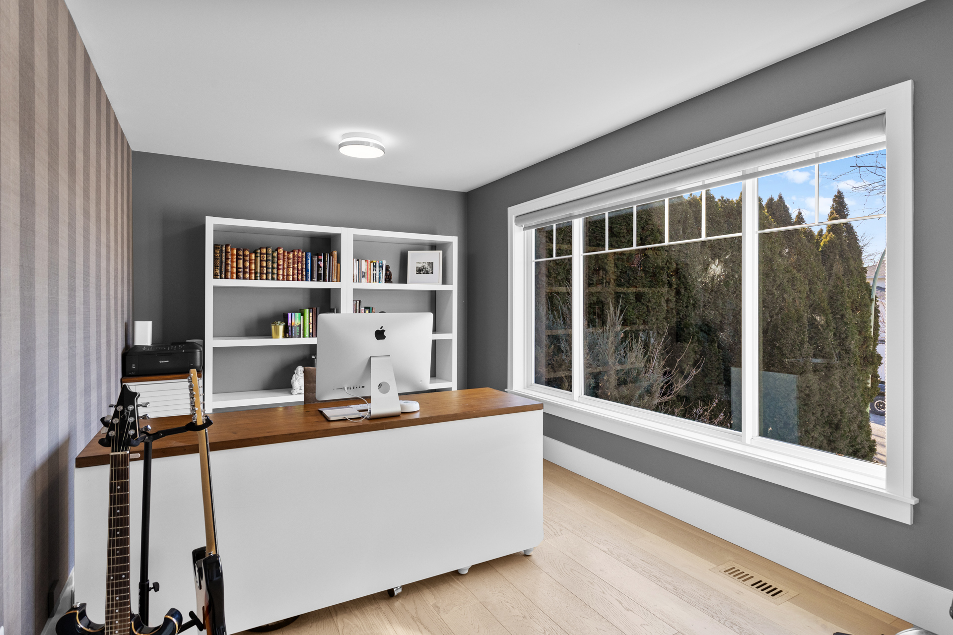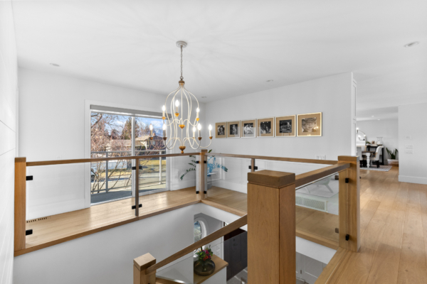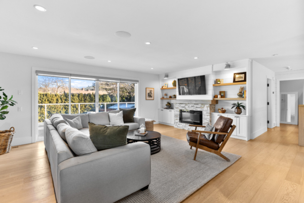 The living area is warm and inviting, featuring hardwood flooring, a gas fireplace, and large windows that flood the space with natural light. Patio doors lead to an expansive upper deck, overlooking a completely private backyard surrounded by mature 20ft cedars.