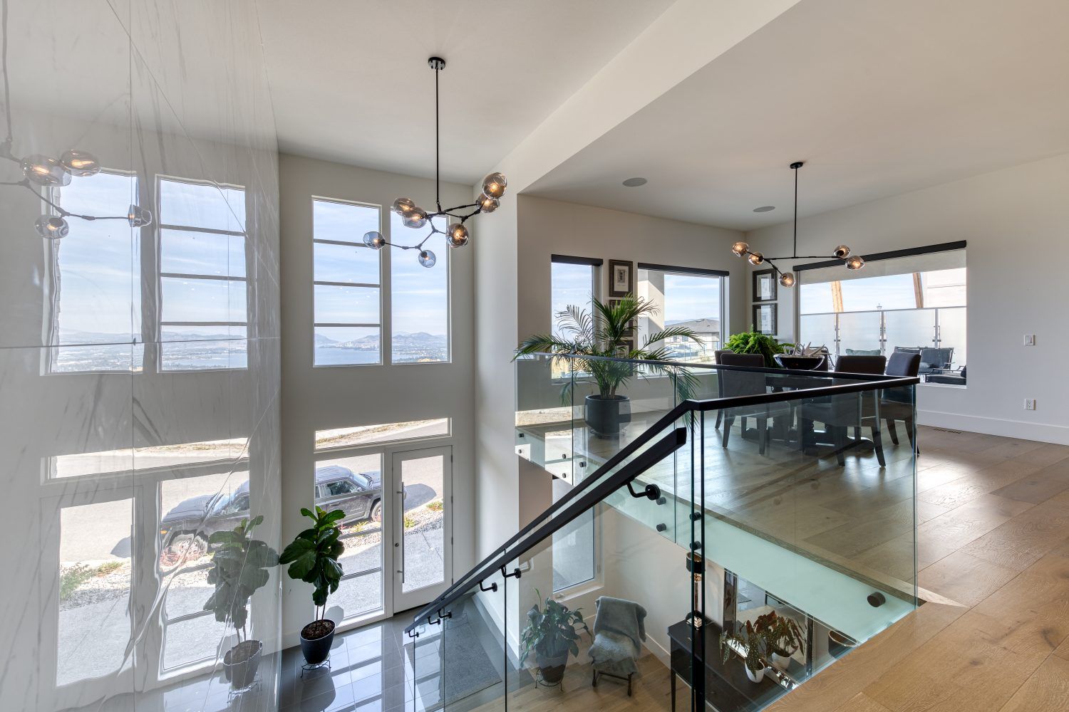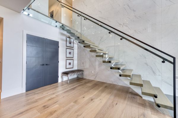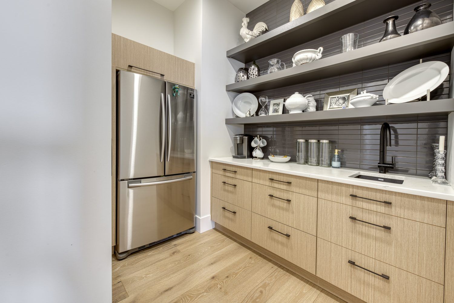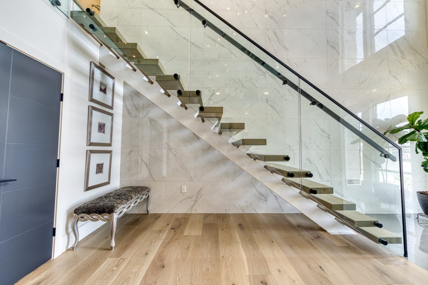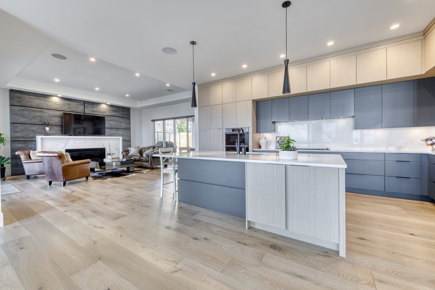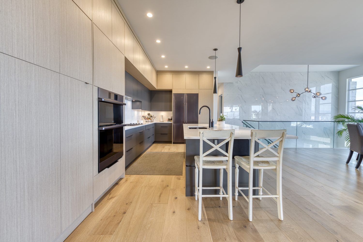 Enter into the stunning 2 story foyer featuring a breathtaking suspended stair system and marble tile feature wall. Continue up to the main upper level with 10ft ceilings throughout and into the luxury kitchen. This kitchen does not disappoint, bringing together modern features and convenience, with a 10ft Silestone island, and all Dacor appliances including the double door fridge, built-in microwave, and wall oven. A hidden panel wall gives access to the walk-in butler’s pantry with an additional full-size fridge, sink, and cabinetry. Across from the open-concept kitchen is the dining room. The living room walks out to the spacious covered front deck and walks out to the covered back patio. The gorgeous feature wall includes a beautiful linear fireplace.
