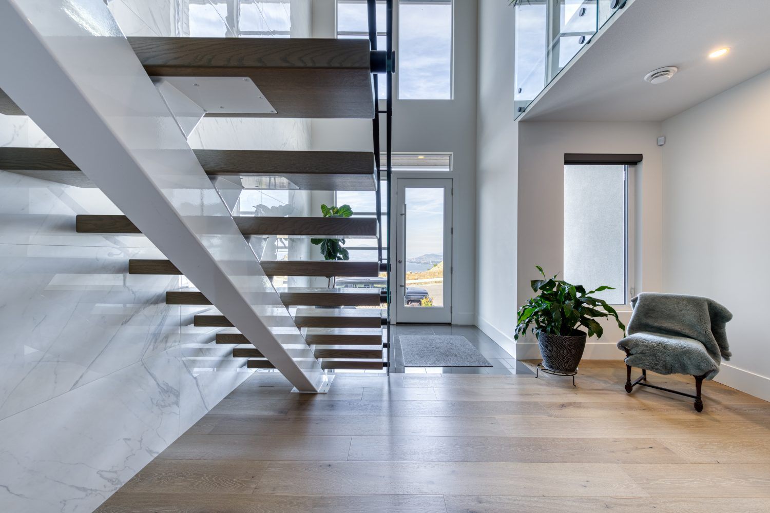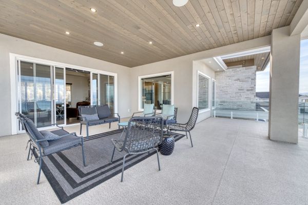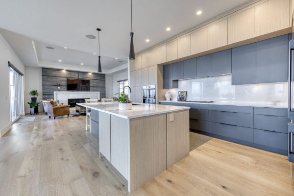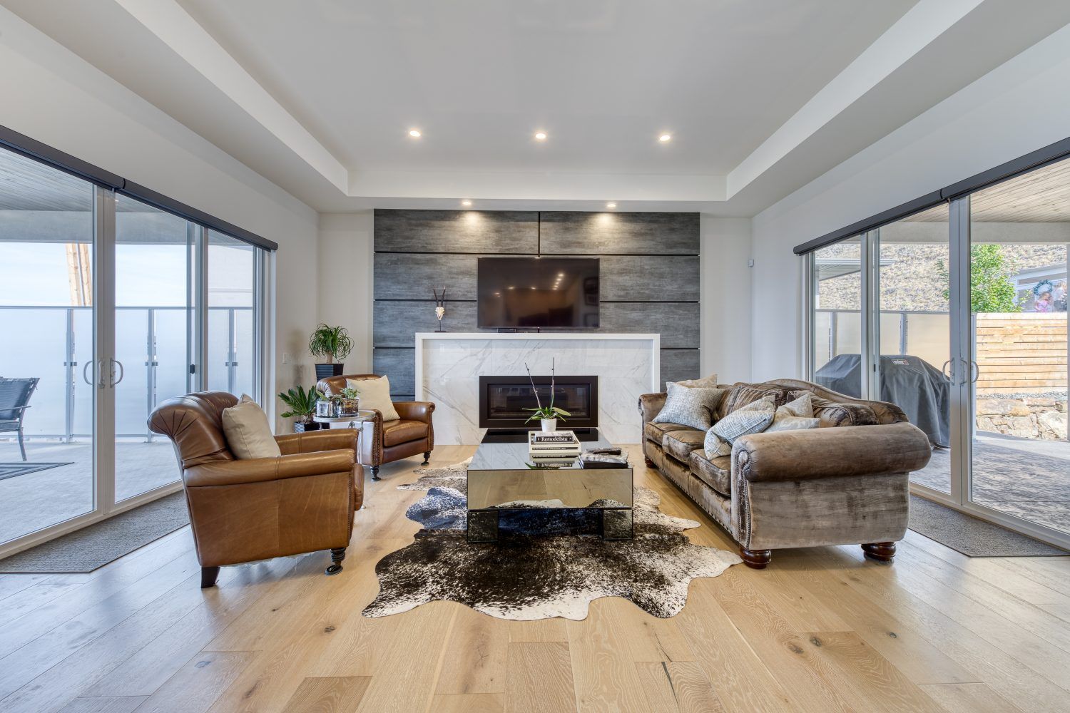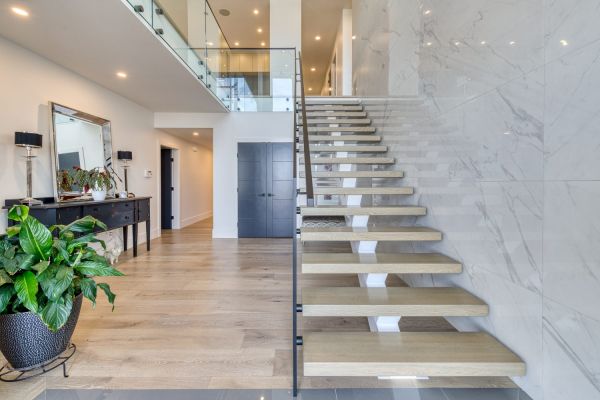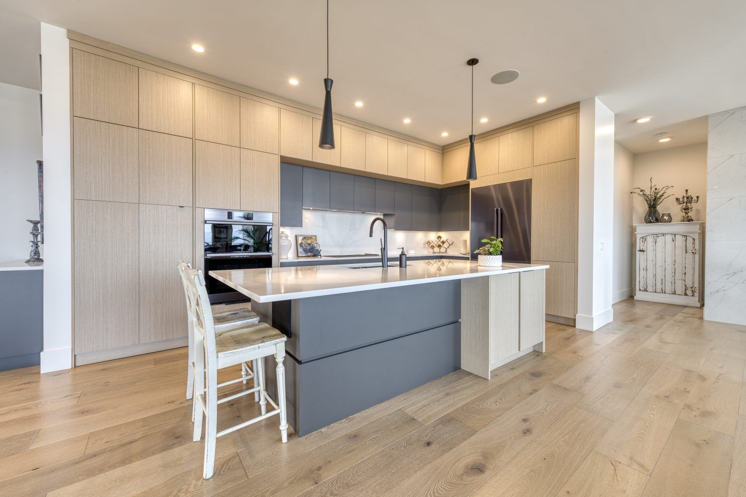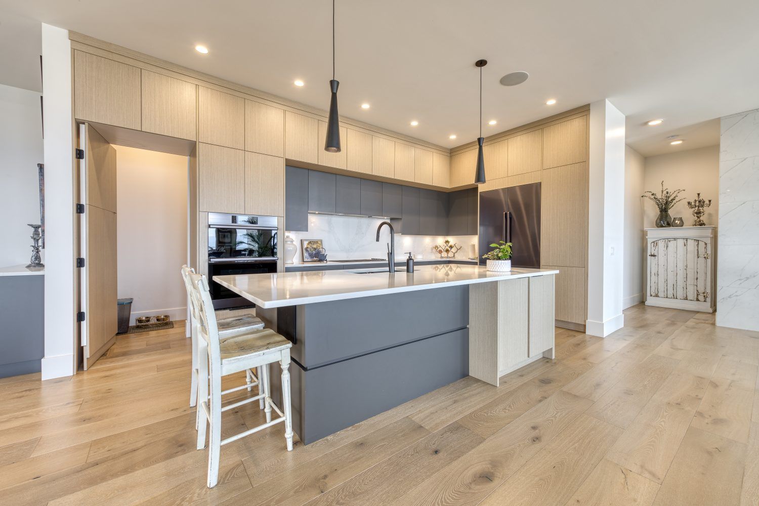 Enter into the stunning 2 story foyer featuring a breathtaking suspended stair system and marble tile feature wall. Continue up to the main upper level with 10ft ceilings throughout and into the luxury kitchen. This kitchen does not disappoint, bringing together modern features and convenience, with a 10ft Silestone island, and all Dacor appliances including the double door fridge, built-in microwave, and wall oven. A hidden panel wall gives access to the walk-in butler’s pantry with an additional full-size fridge, sink, and cabinetry. Across from the open-concept kitchen is the dining room. The living room walks out to the spacious covered front deck and walks out to the covered back patio. The gorgeous feature wall includes a beautiful linear fireplace.