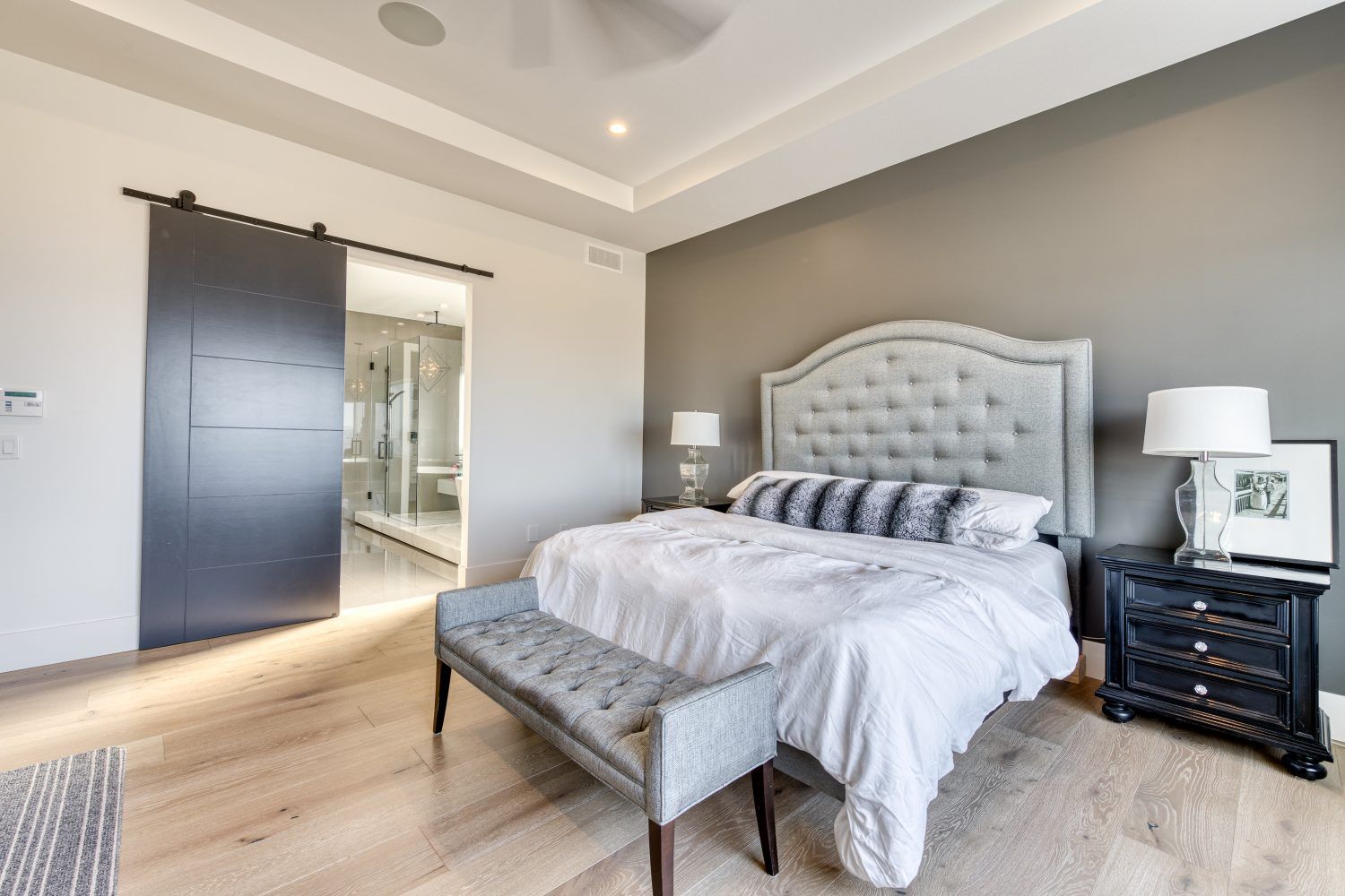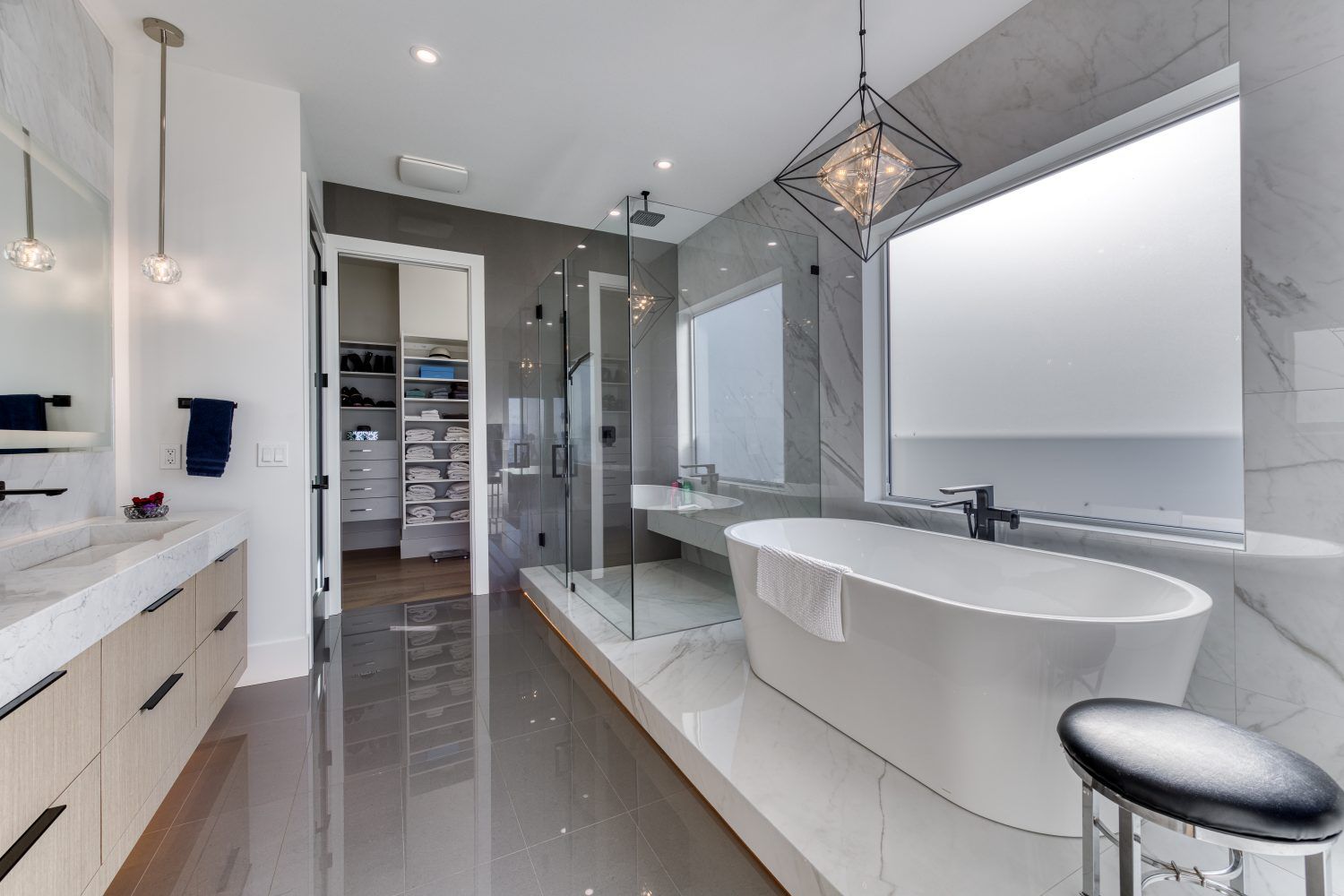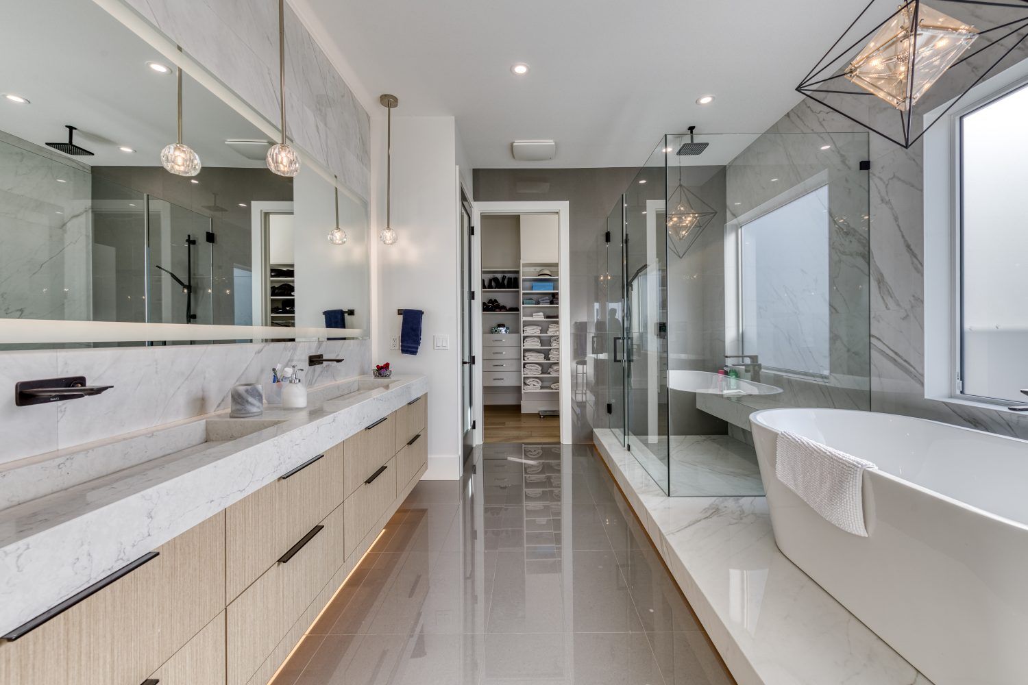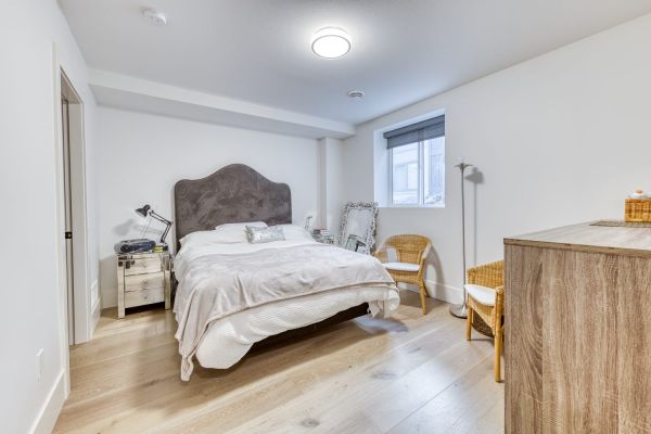 Continue to be wowed by the master bedroom, with oversized windows. The master ensuite bathroom makes “luxurious” an understatement, with linear quartz double sinks, a stand-alone soaker tub, a large glass shower, and access to the huge walk-in closet with extensive built-in storage.