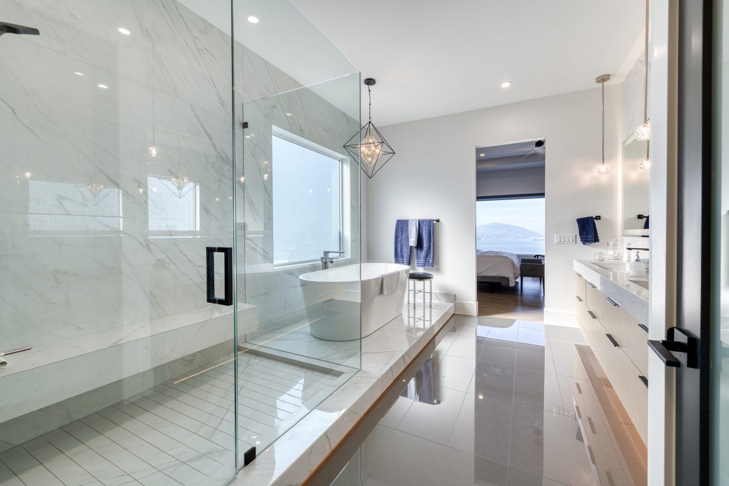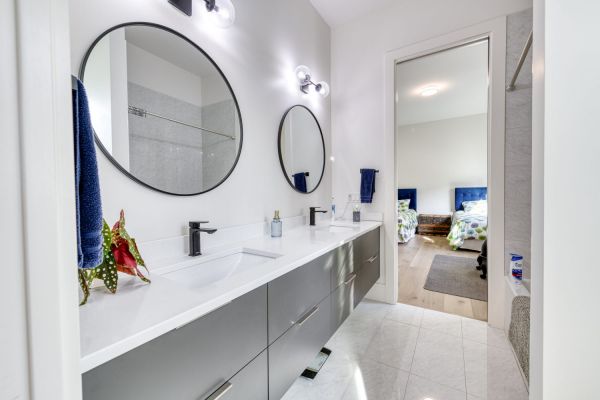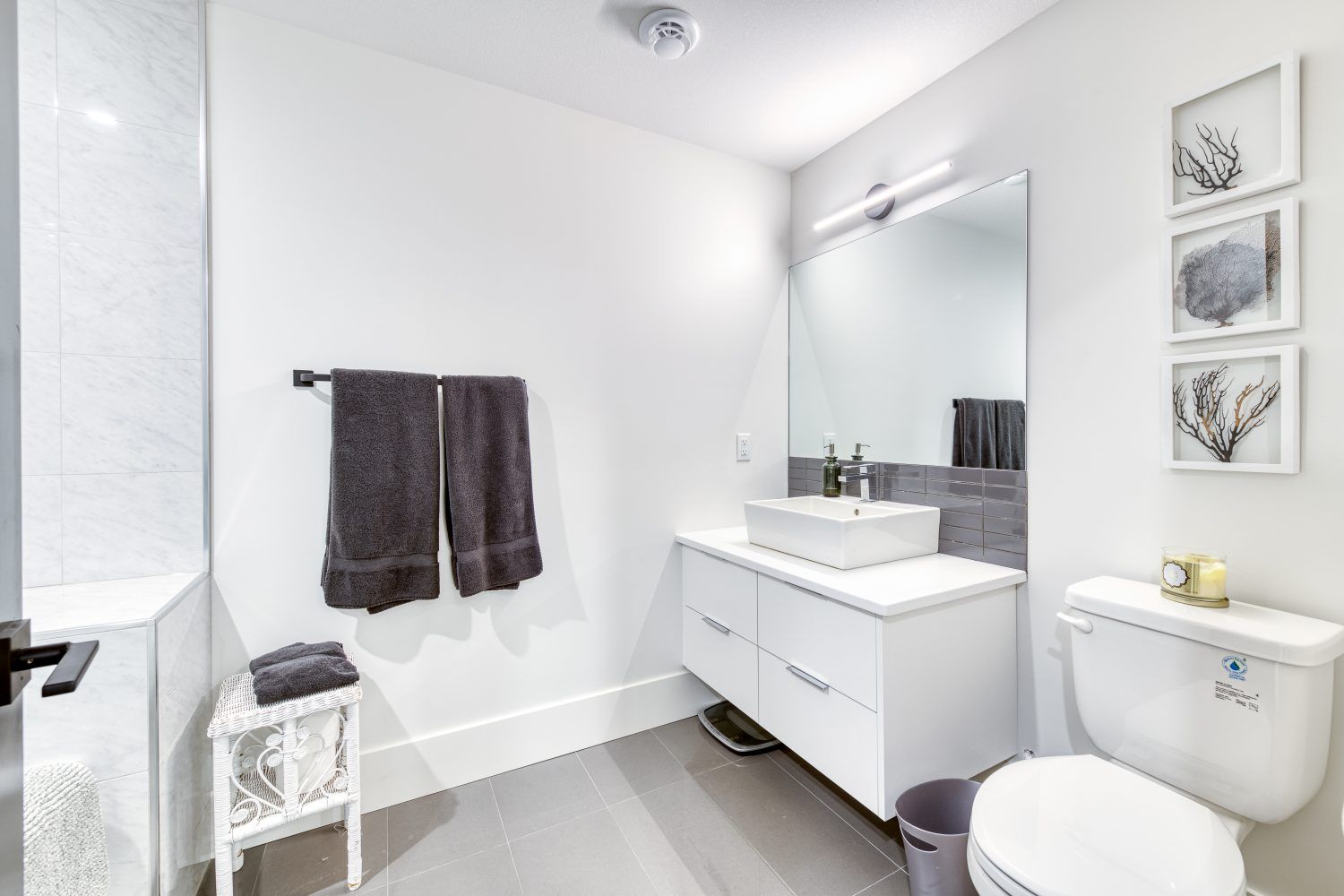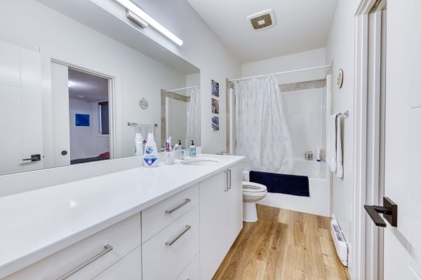 Continue to be wowed by the master bedroom, with oversized windows. The master ensuite bathroom makes “luxurious” an understatement, with linear quartz double sinks, a stand-alone soaker tub, a large glass shower, and access to the huge walk-in closet with extensive built-in storage.