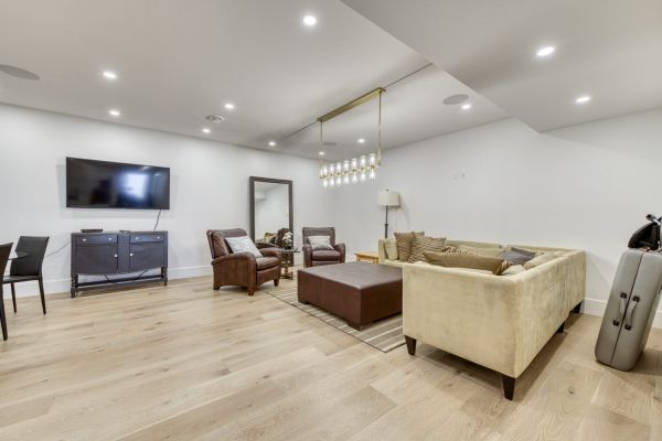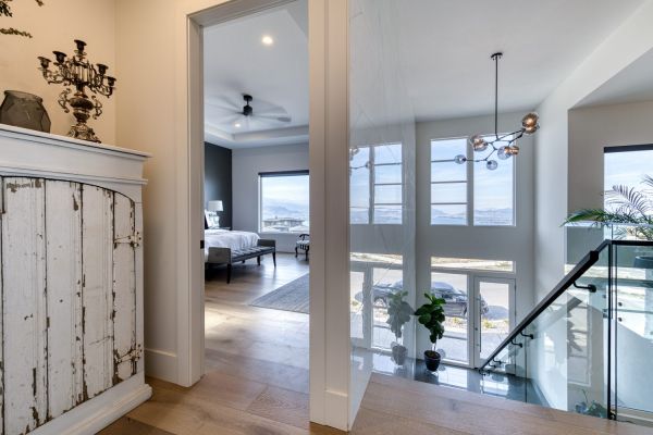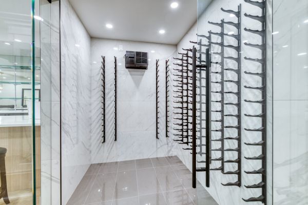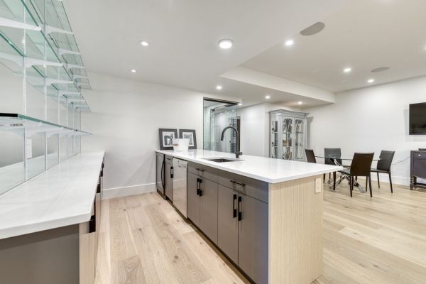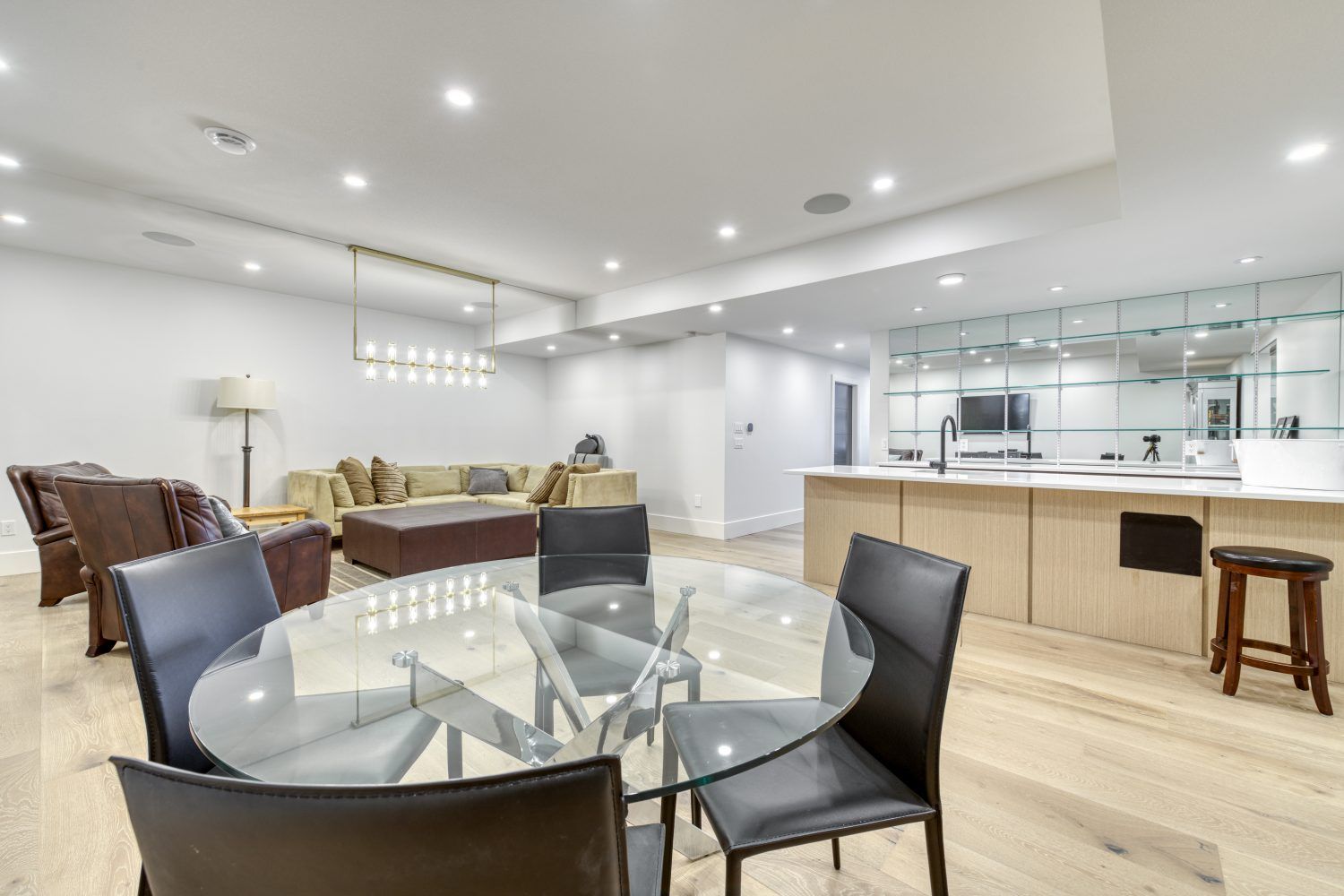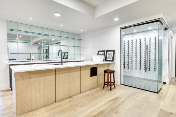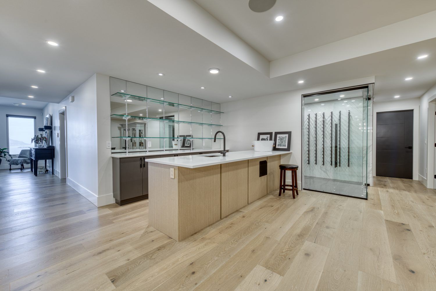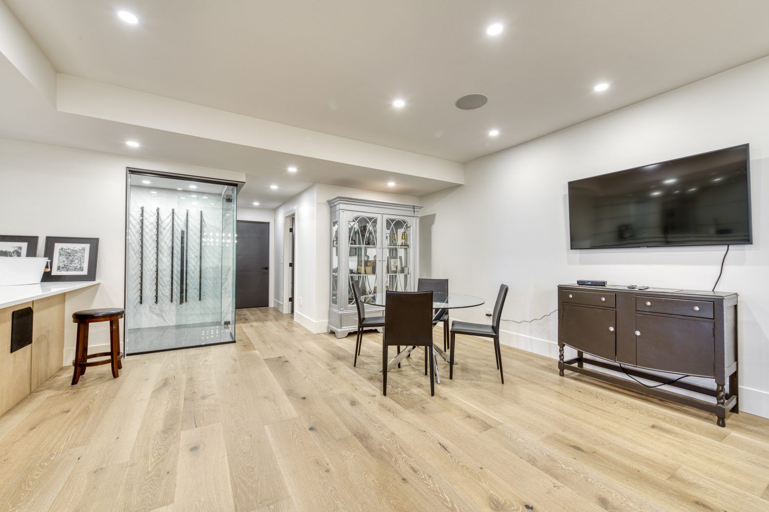 The lower level boasts 9ft ceilings throughout and is an entertainer’s dream with a massive wet bar with quartz countertops and a glass wine room. The spacious rec room offers endless potential for entertainment, games, or a TV room. The main area of this floor also features a den, a bedroom with a walk-in closet, and a full bathroom. Access the oversized double garage through the spacious modern mudroom with tons of built-in cabinetry and storage.