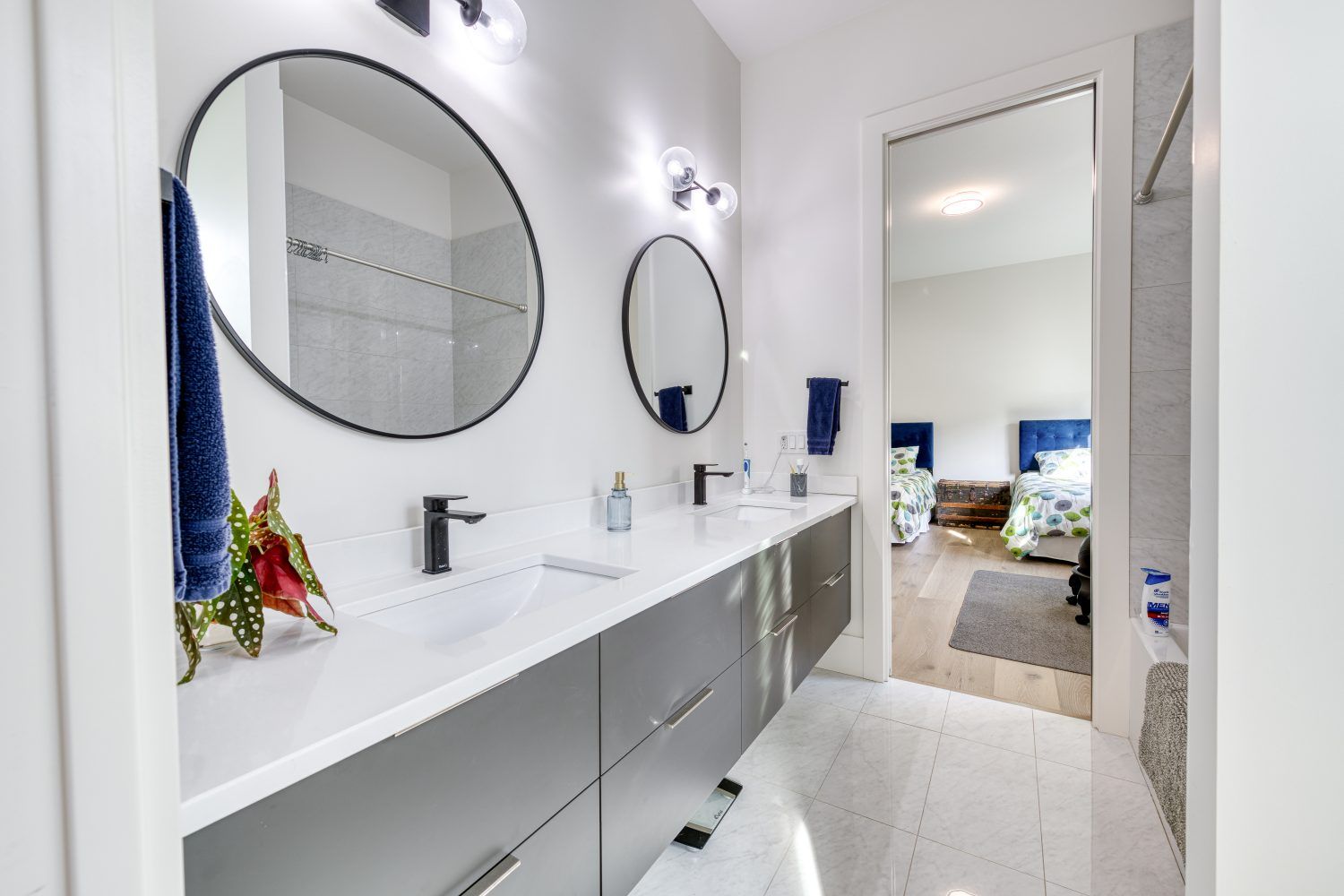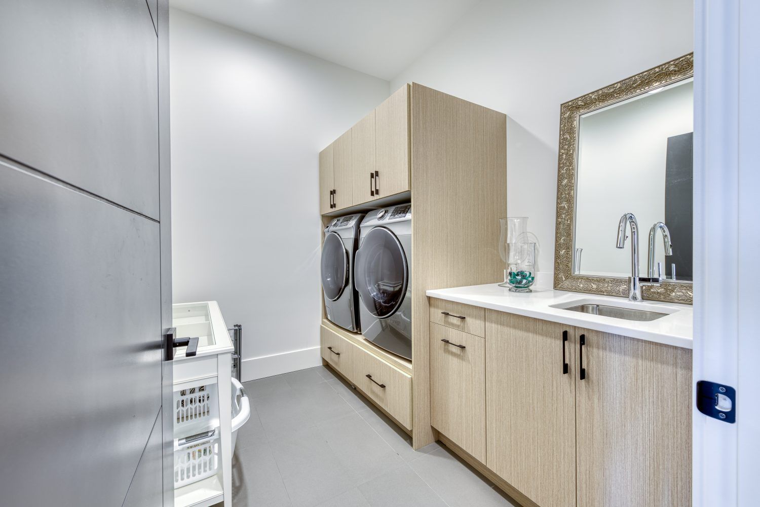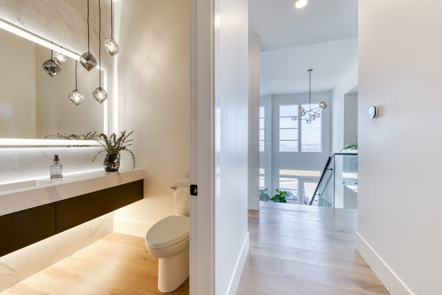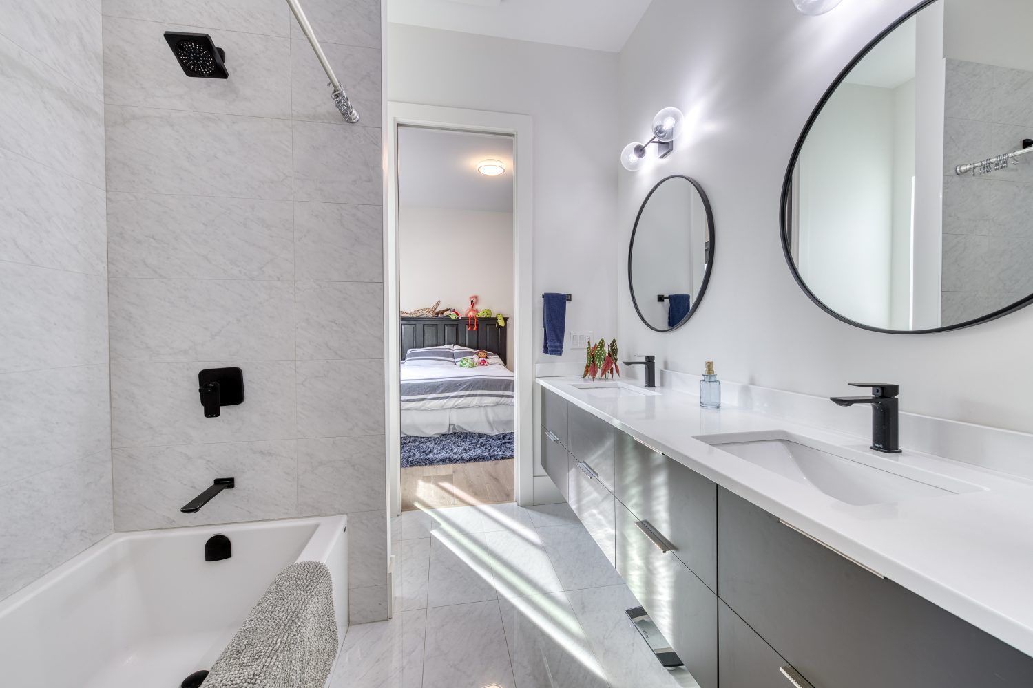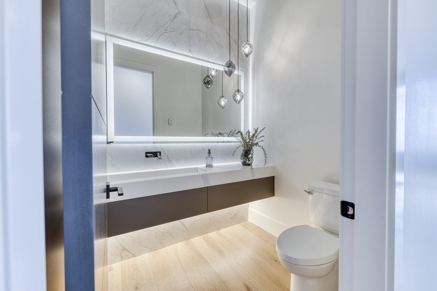 The upper floor offers a large laundry room, a 2-piece luxurious powder room with linear sink and suspended vanity, and two additional bedrooms which both have access to a full 5-piece shared ensuite bathroom.