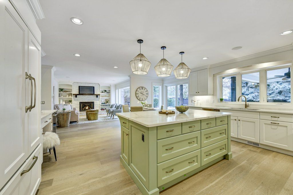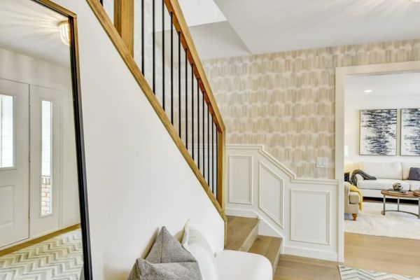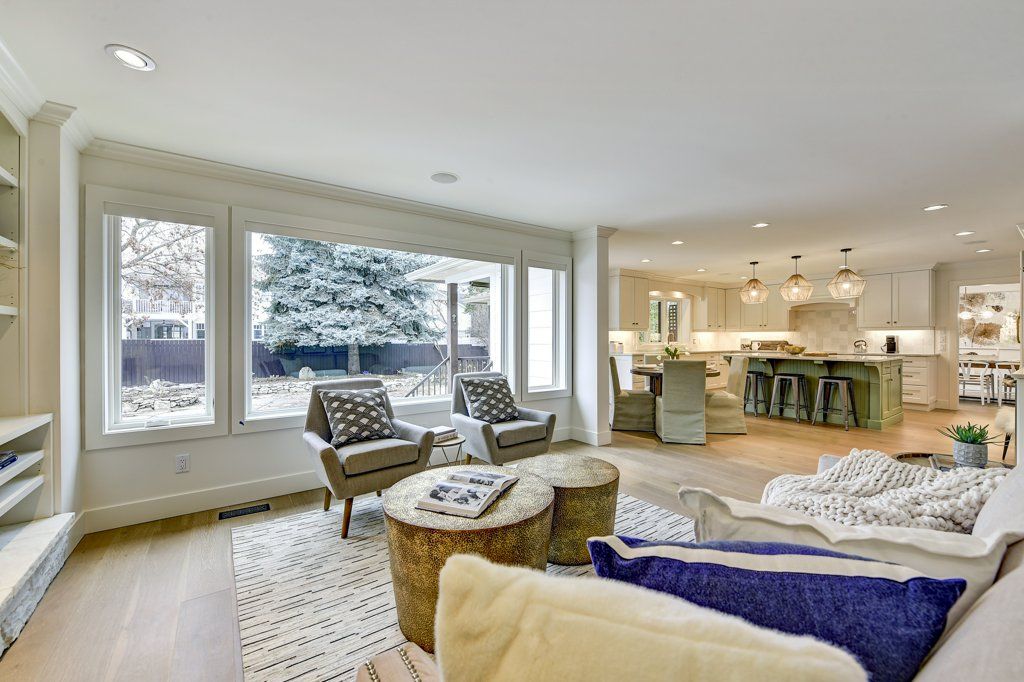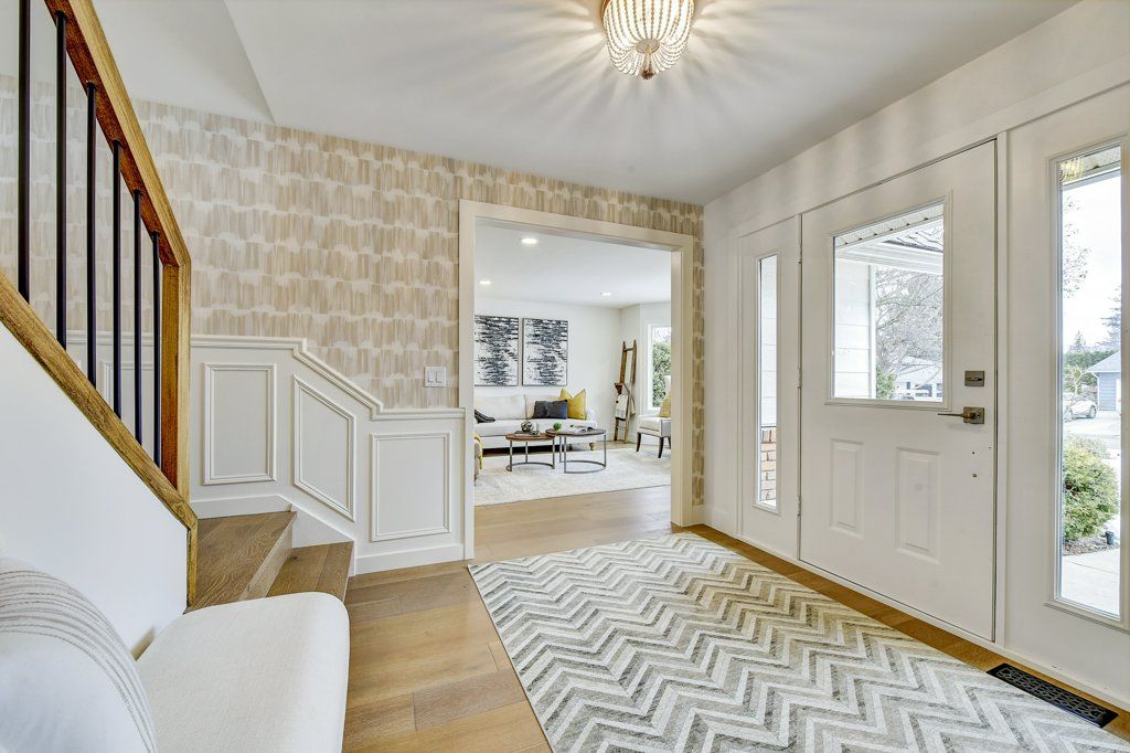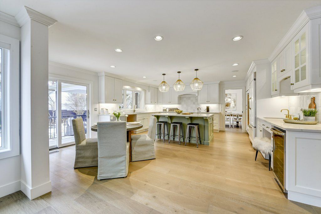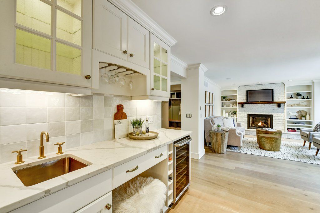 As you enter you are greeted with a beautiful foyer and a wooden staircase to the upper level. To the right, there is a beautiful formal family room and dining area with large bay windows, a perfect space to entertain guests. The spacious open-concept kitchen has new appliances and custom white cabinetry with champagne-colored hardware and fixtures. Off the kitchen is the bright breakfast nook followed by a large family room with a cozy stone fireplace all overlooking the beautiful backyard and patio. The main level is complete with a large mudroom/laundry area with herringbone flooring that gives a timeless look to this modern home. There is access to the pool deck and a full bathroom which leads to the double-car garage.