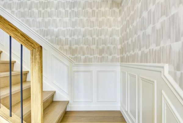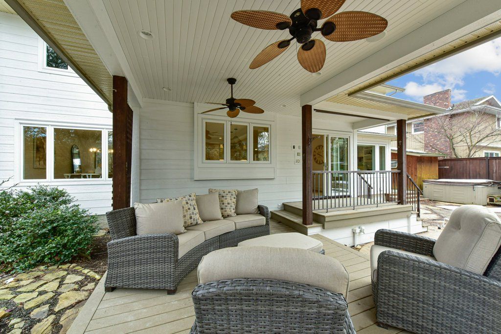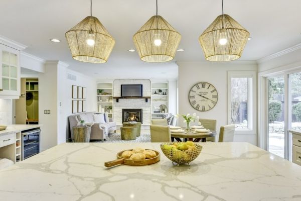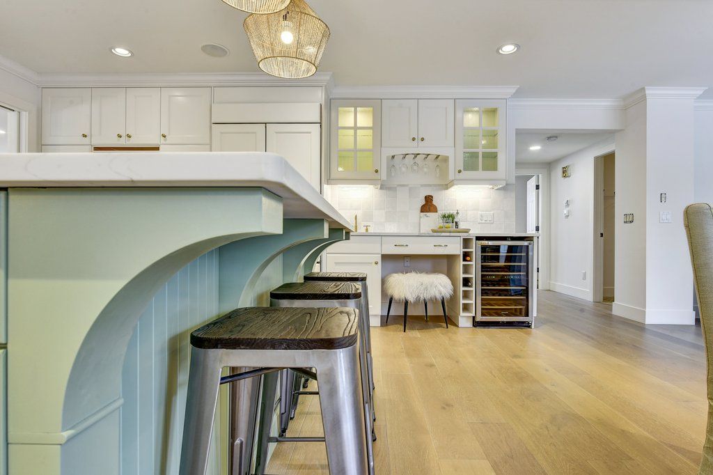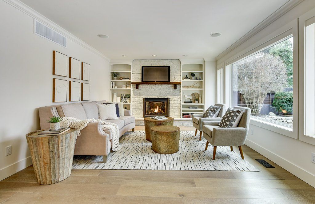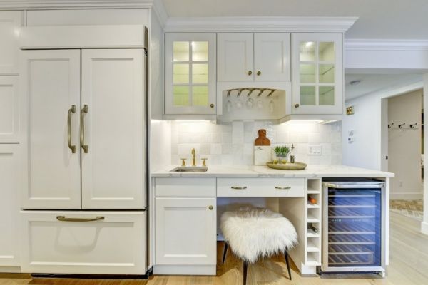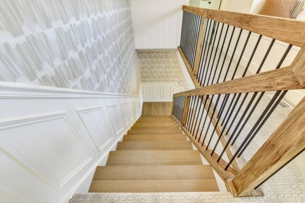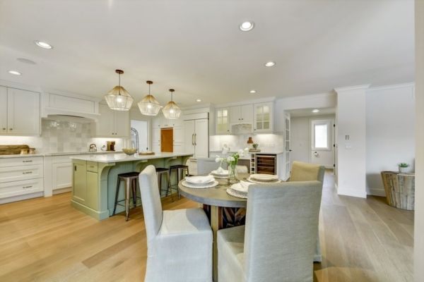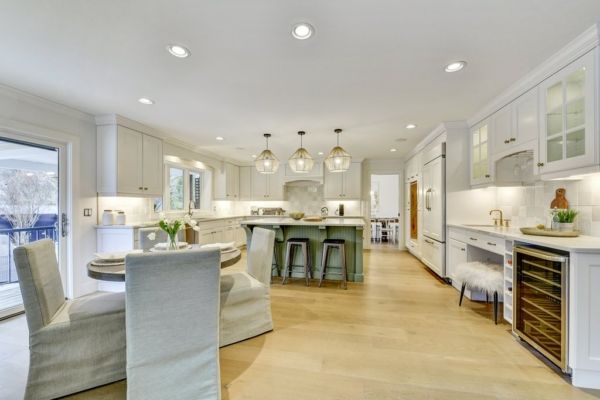 As you enter you are greeted with a beautiful foyer and a wooden staircase to the upper level. To the right, there is a beautiful formal family room and dining area with large bay windows, a perfect space to entertain guests. The spacious open-concept kitchen has new appliances and custom white cabinetry with champagne-colored hardware and fixtures. Off the kitchen is the bright breakfast nook followed by a large family room with a cozy stone fireplace all overlooking the beautiful backyard and patio. The main level is complete with a large mudroom/laundry area with herringbone flooring that gives a timeless look to this modern home. There is access to the pool deck and a full bathroom which leads to the double-car garage.