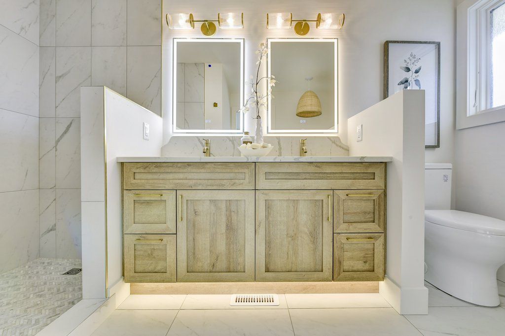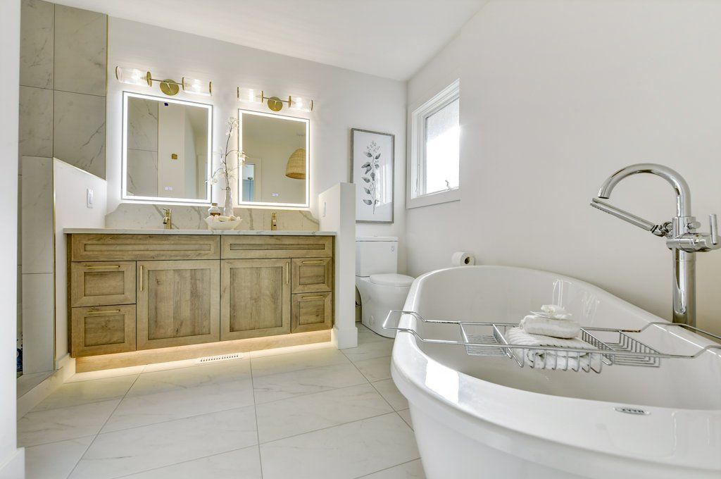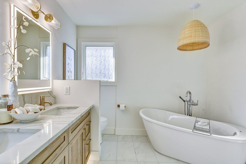 With a fresh contemporary flair, you’ll be wowed the minute you reach the upper level. All 3 bedrooms and bathrooms are completely renovated and provide plenty of natural light. The large master suite comes with his and her closets and a spacious storage area. The ensuite bath is complete with heated floors, beautiful floating dual sinks with back-lit anti-fog mirrors, and a free-standing soaker tub.