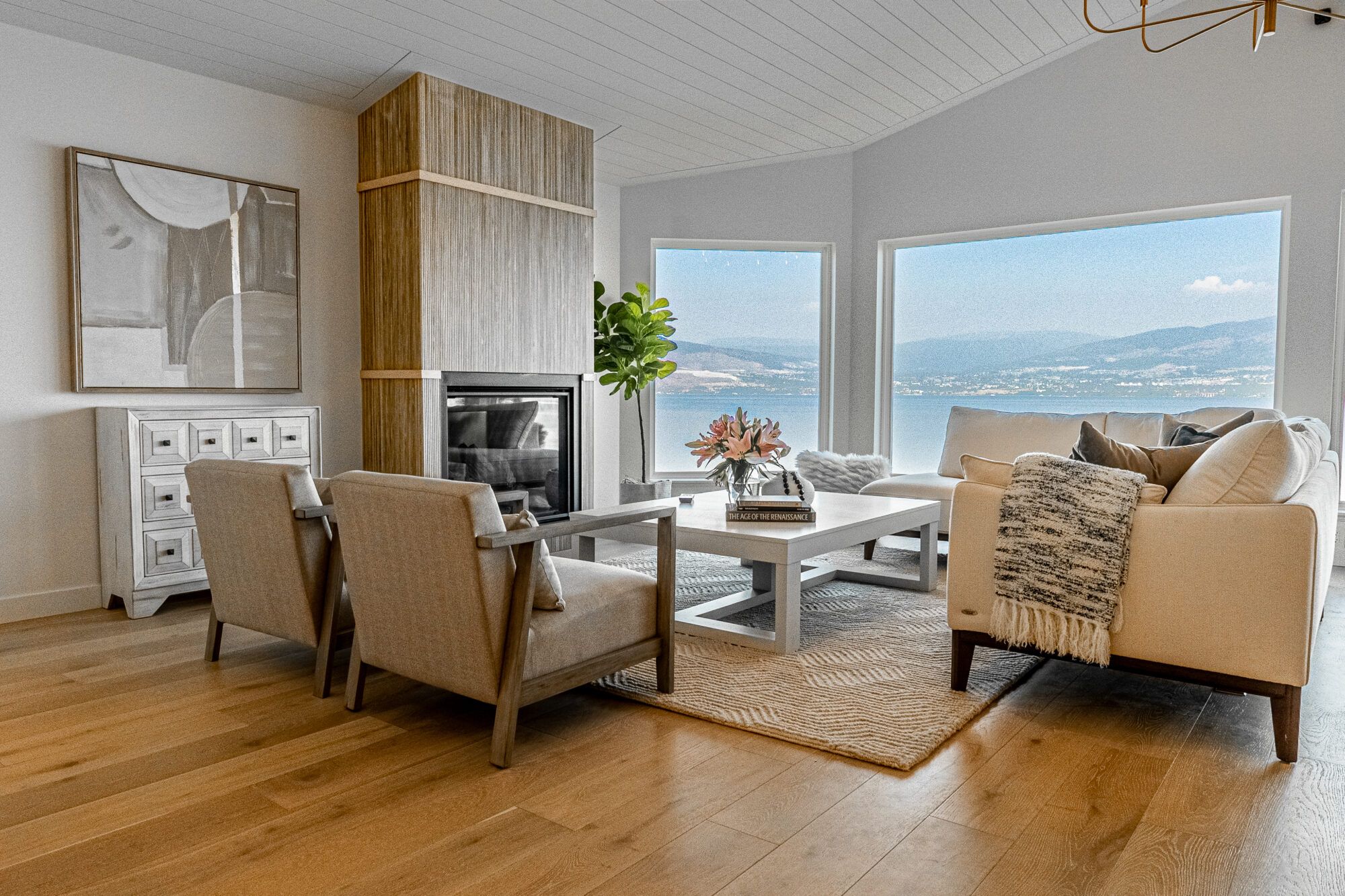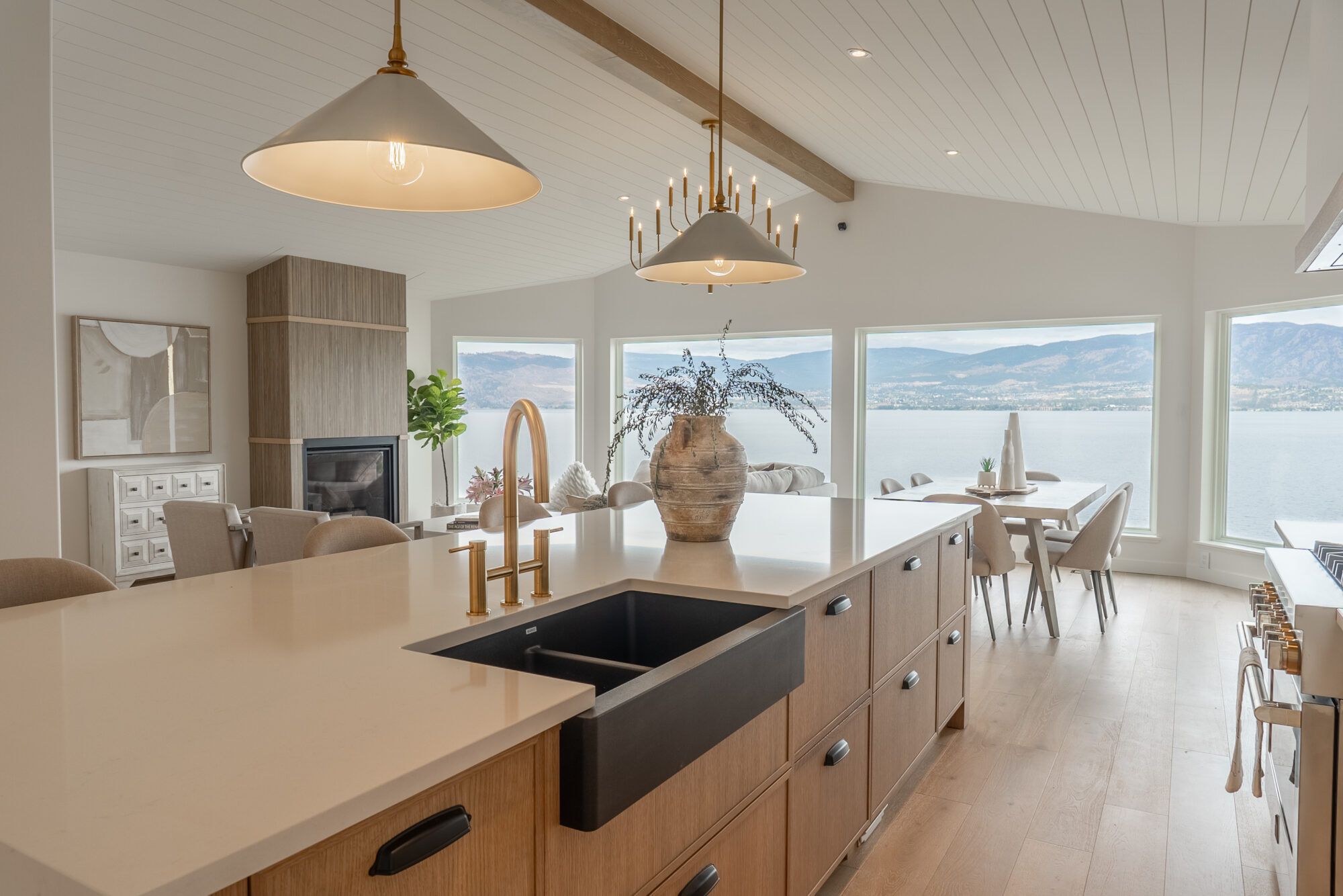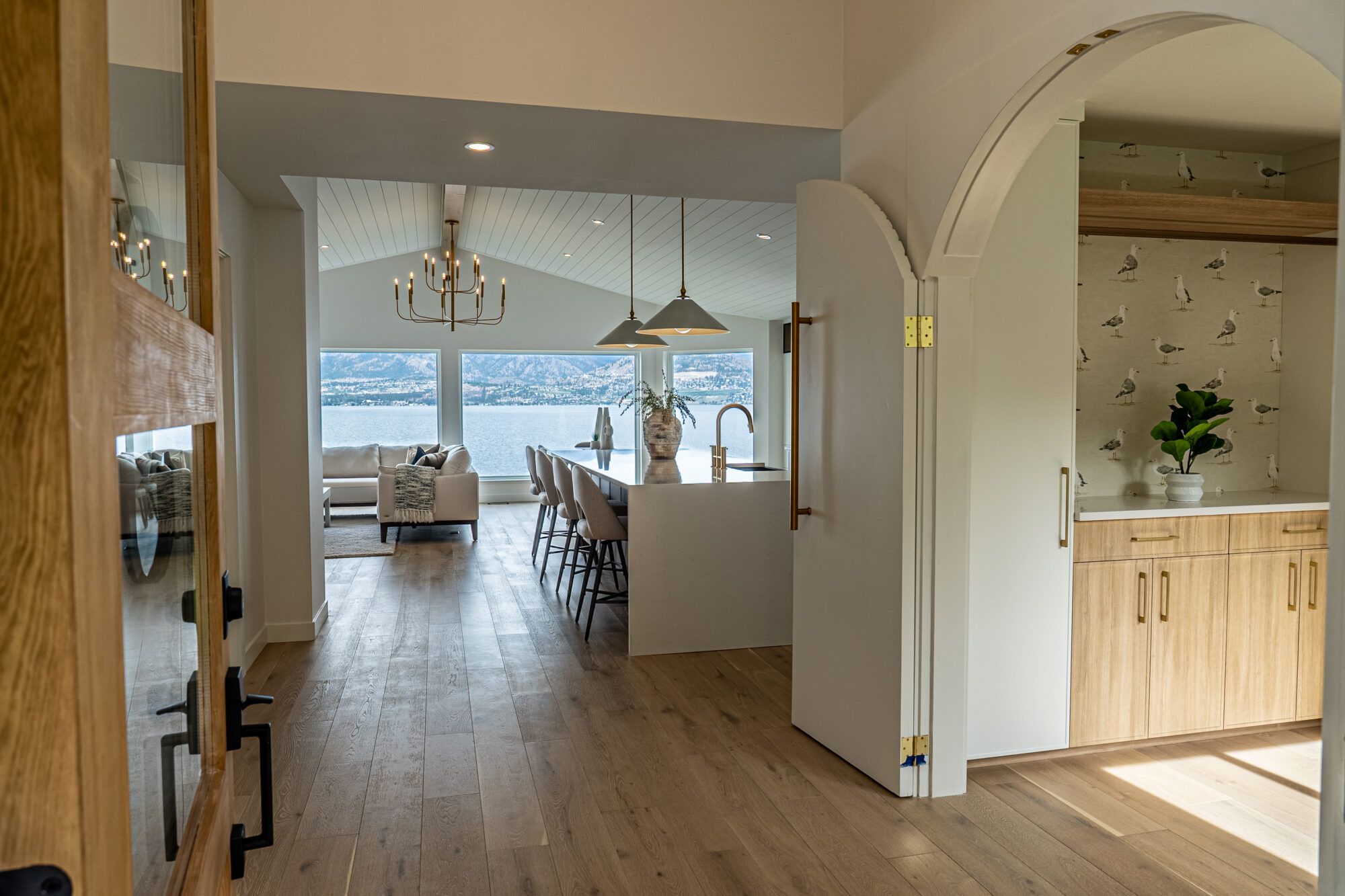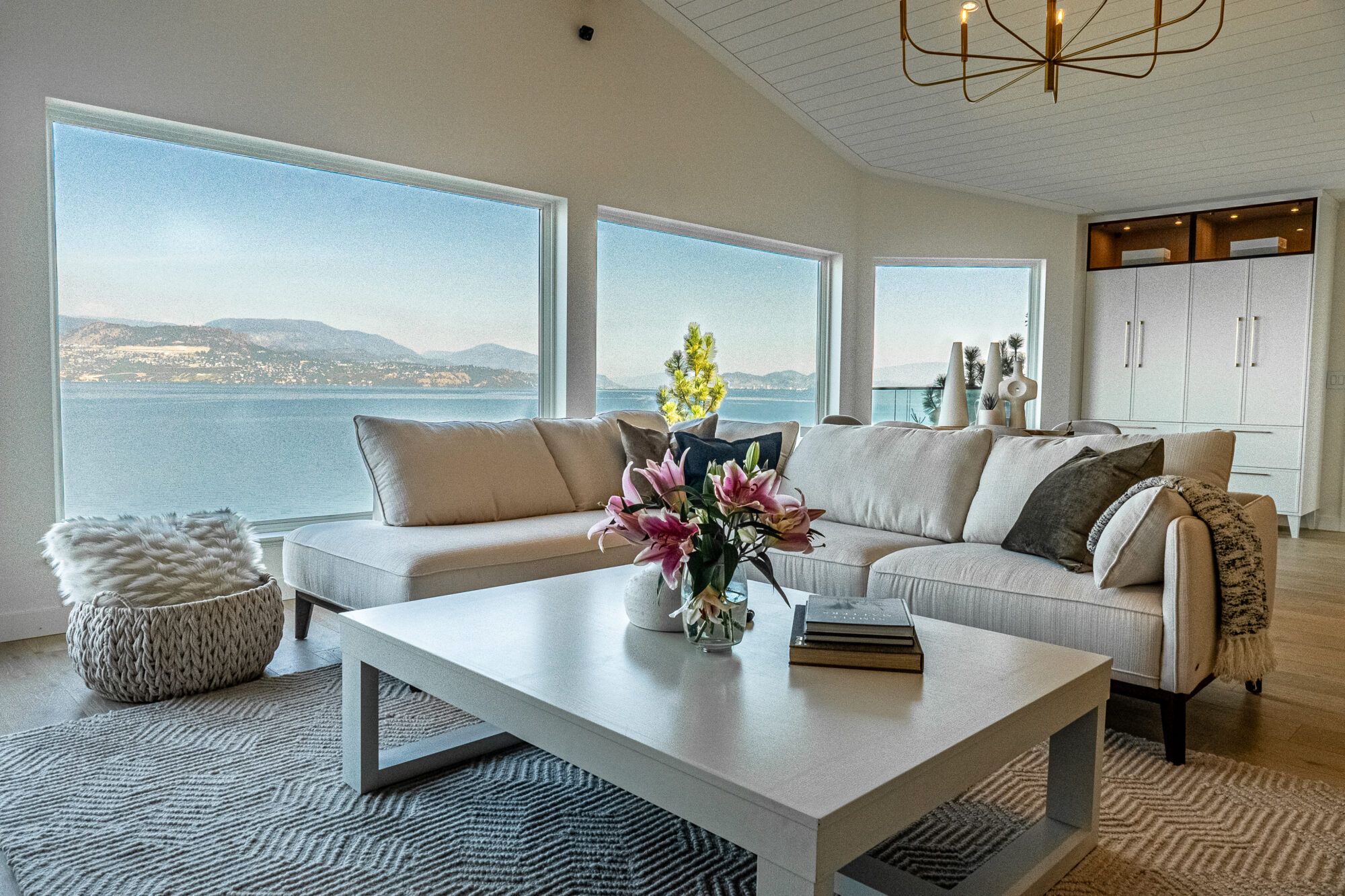 The main living area features picture windows to take in the spectacular views of the lake and valley. The open plan has vaulted ceilings with white