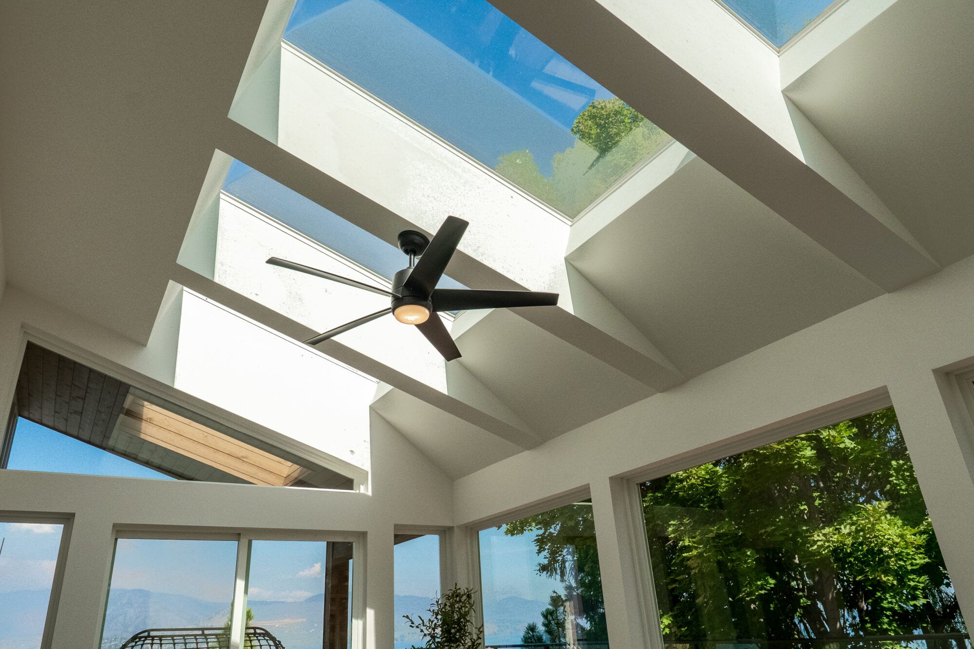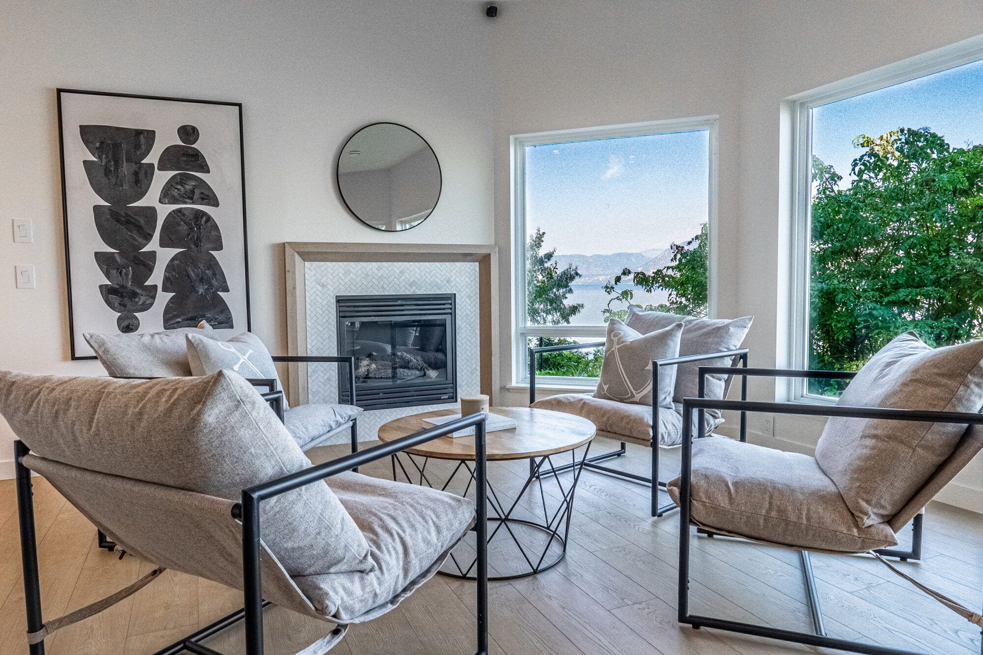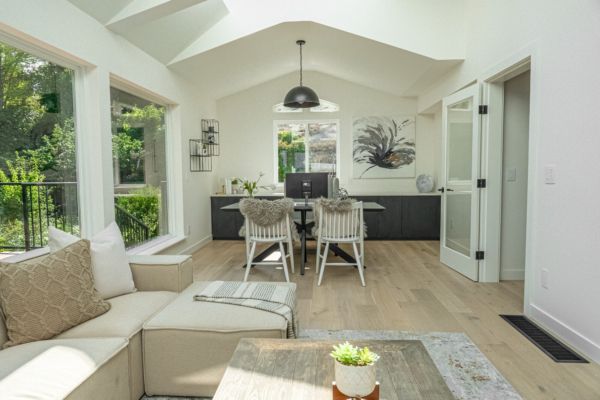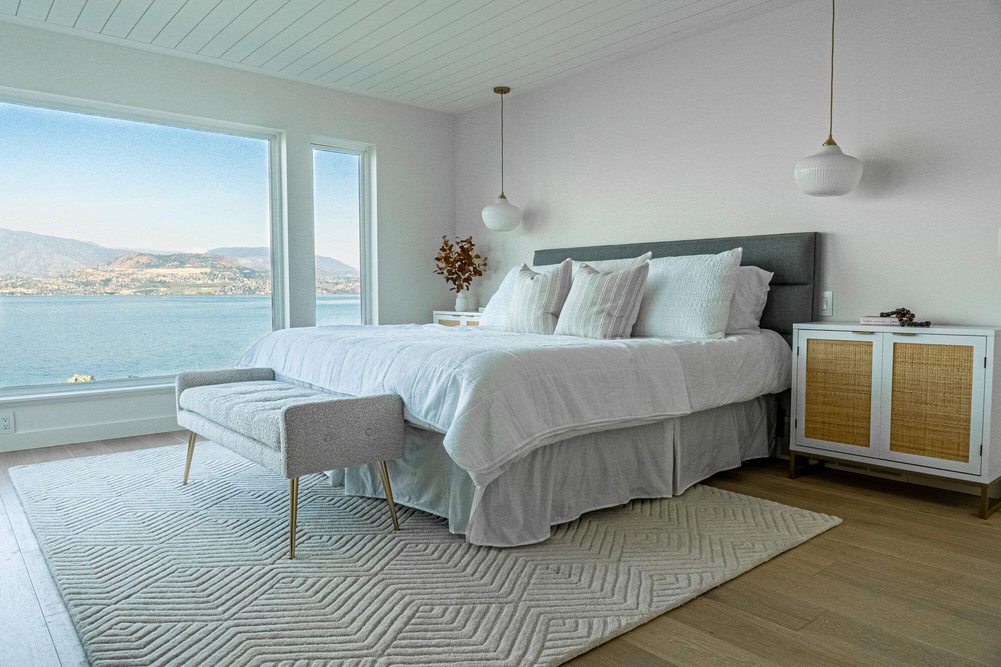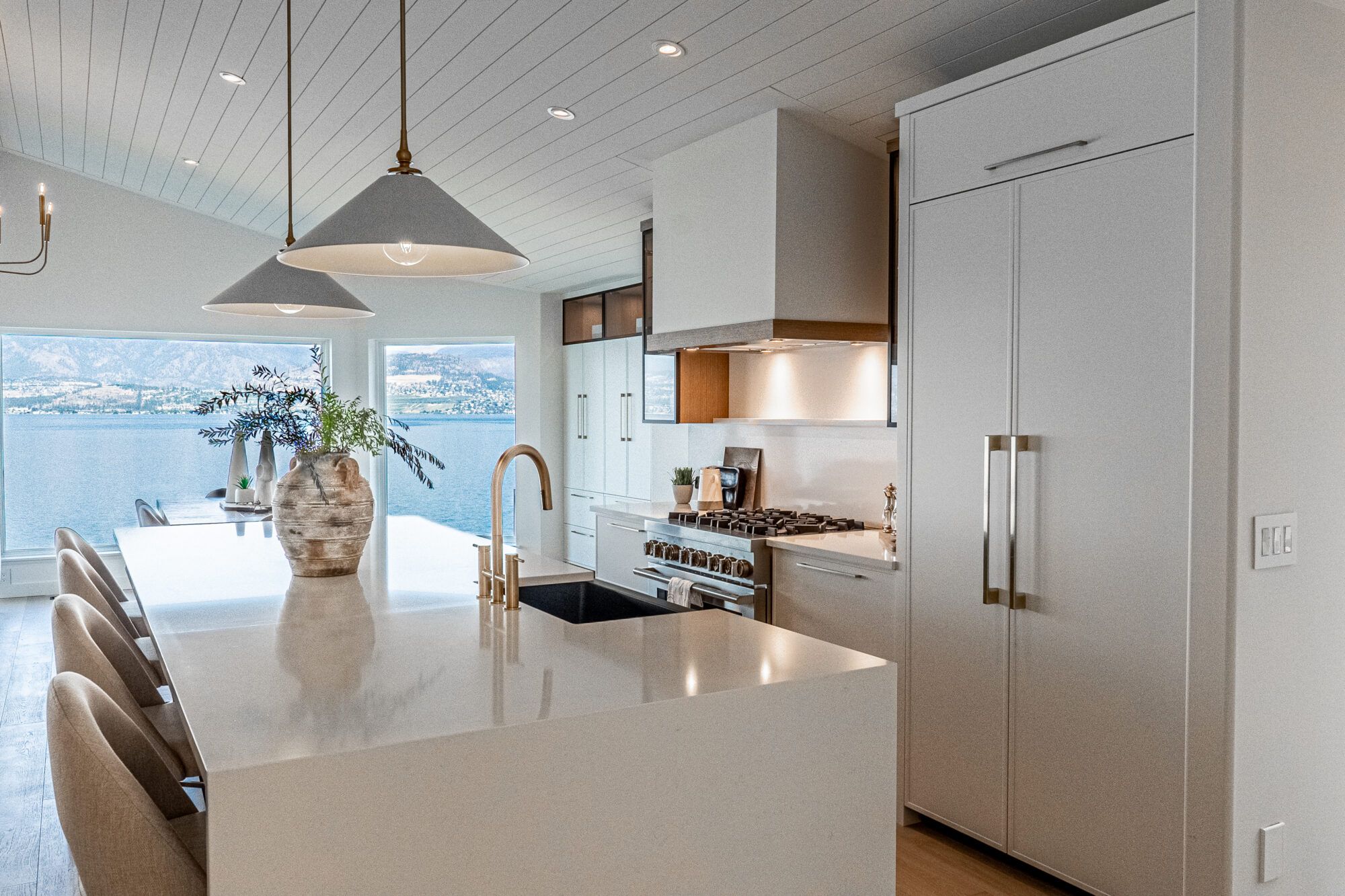 The main living area features picture windows to take in the spectacular views of the lake and valley. The open plan has vaulted ceilings with white