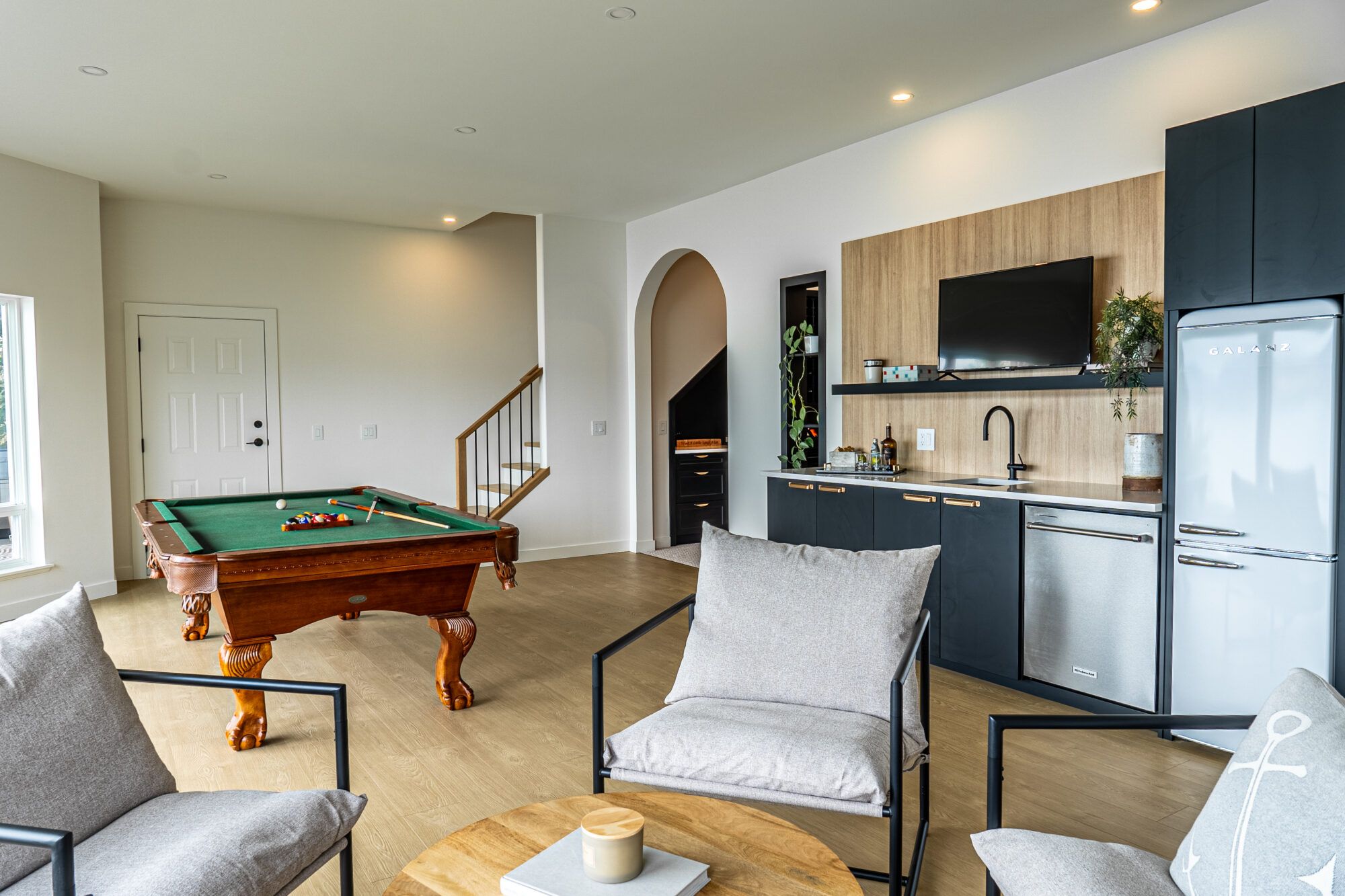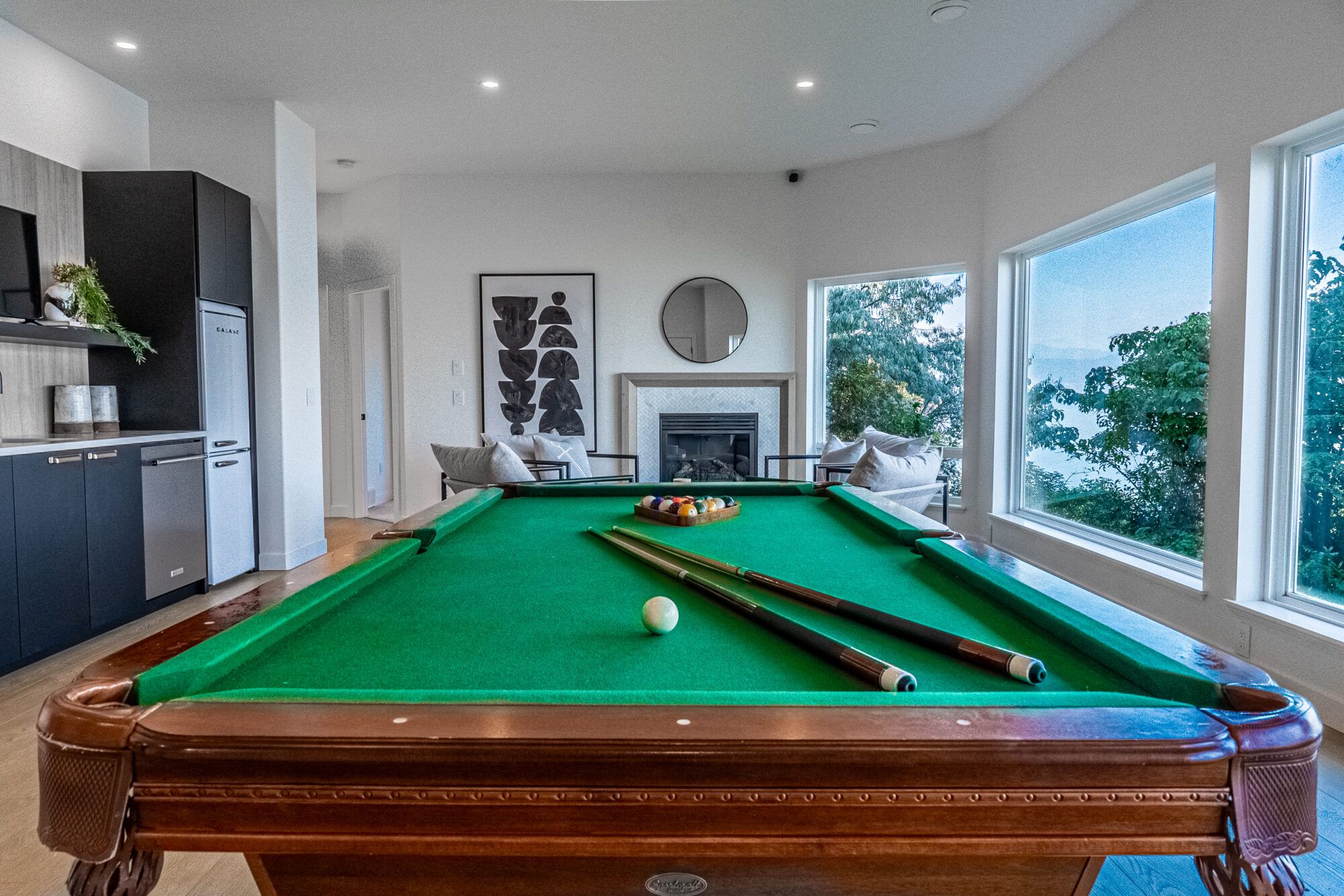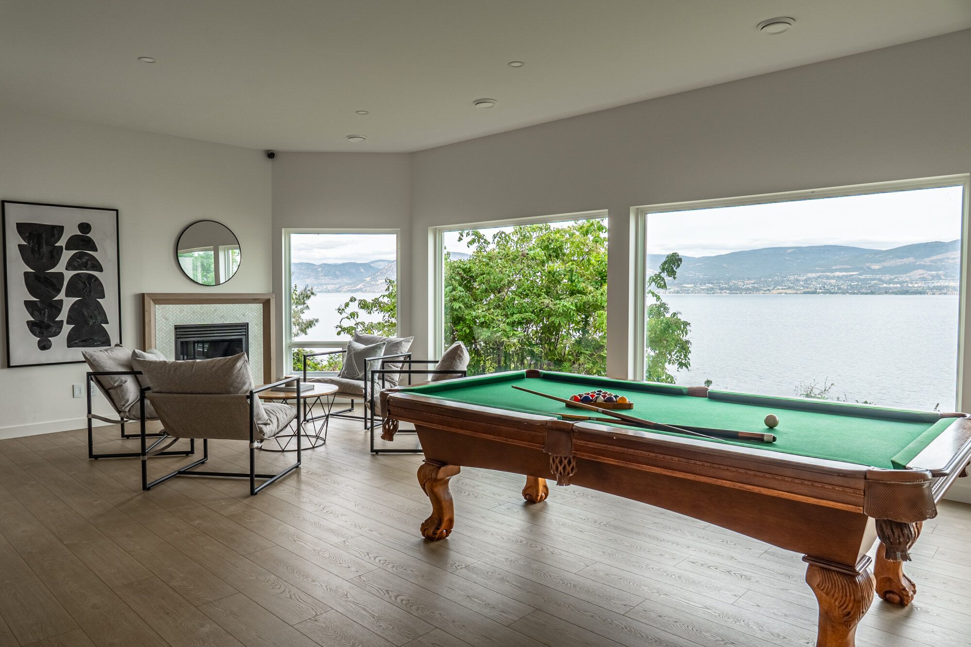 The lower level of the home extends your living space with an open games room, wet bar, and a seating area with a gas fireplace. This functional space has floor-to-ceiling windows to capture the lakeviews while enjoying a game of pool or entertaining family and friends. There are also 2 large bedrooms and a full bathroom great for guests. The space continues through an archway to a unique wine display with built-in storage and a media room tucked away for cozy movie nights.
