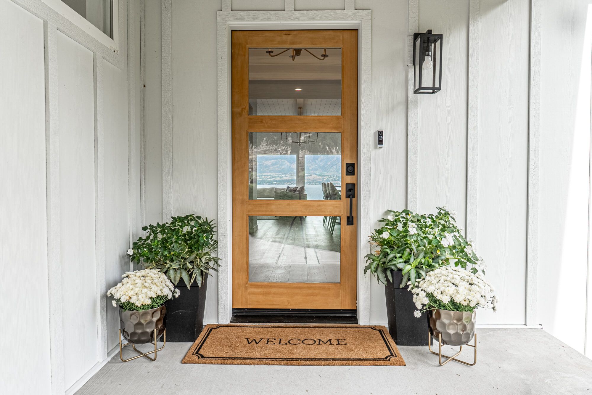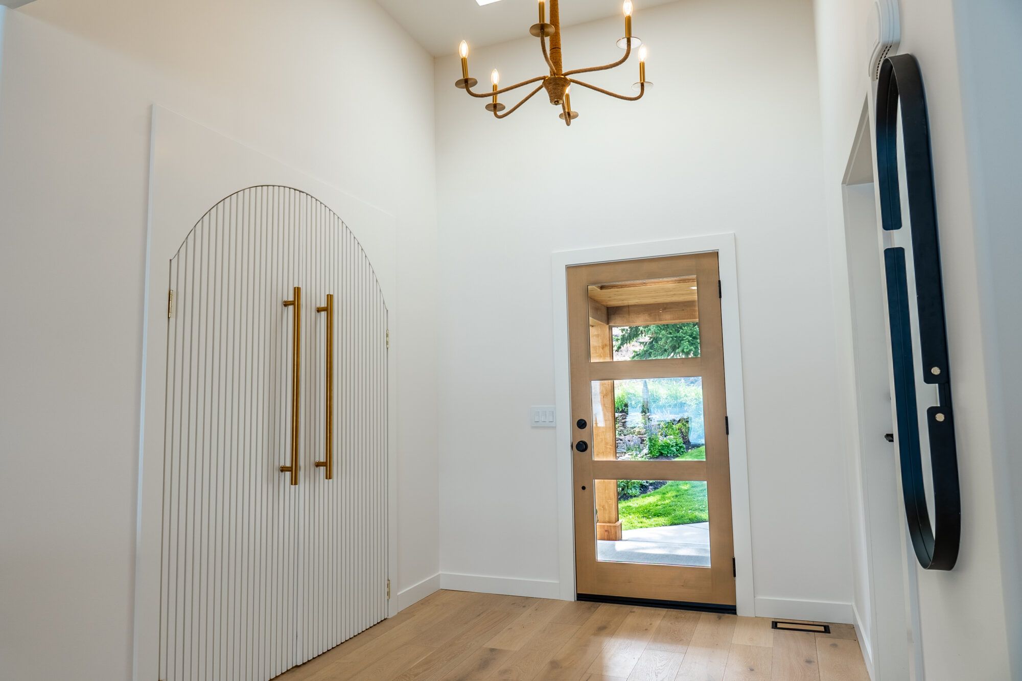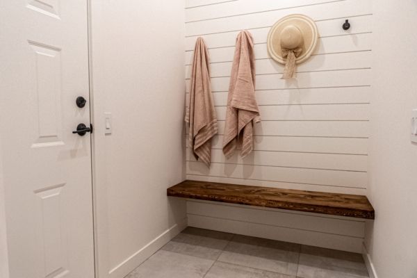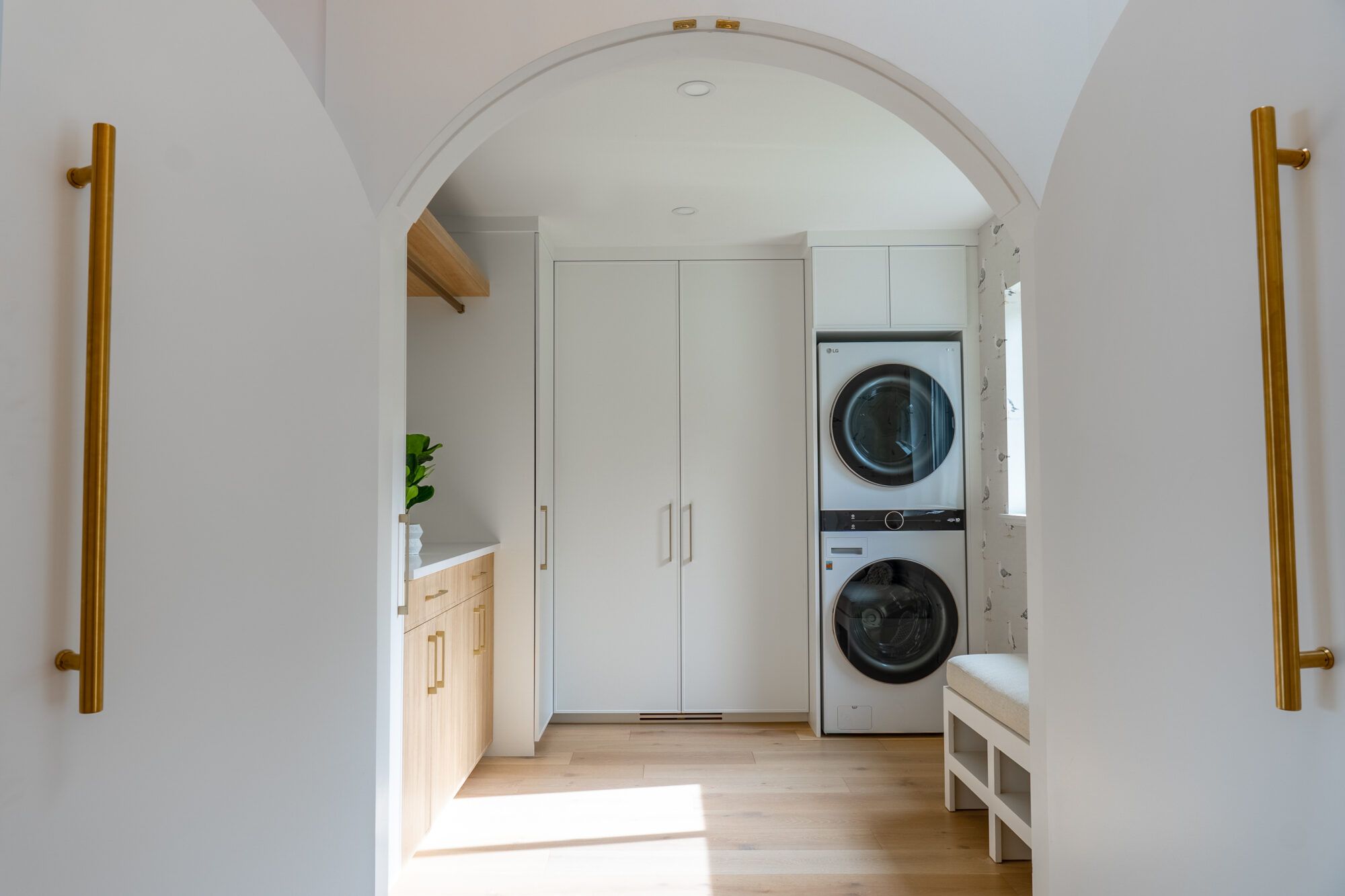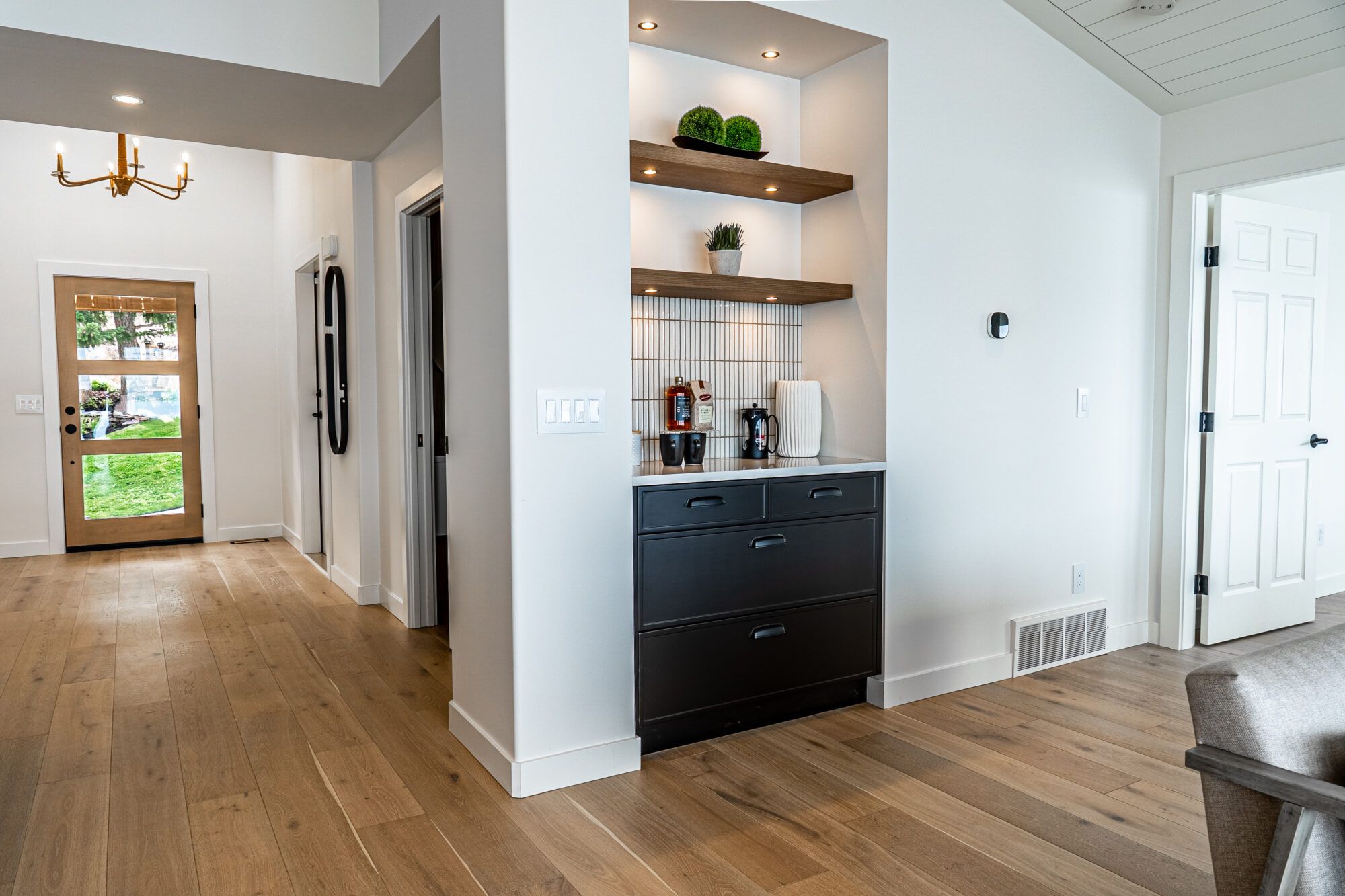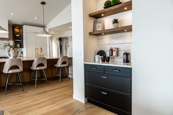 Designed for one-level lakeshore living, the carefully thought-out floor plan captures the sweeping views from every room. The home’s foyer welcomes you with grand detailed arched doors opening to a large mud room complete with built-in cabinetry throughout, a shelf for all your electronics, and one of 2 laundry machines.