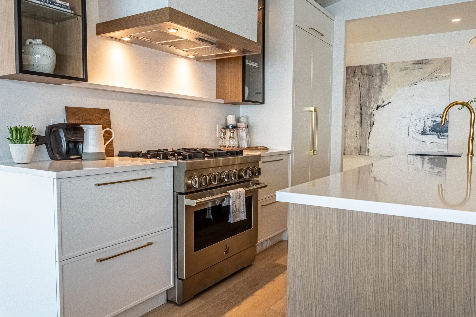 The kitchen is equipped with top-of-the-line JennAir appliances including a panned fridge freezer with a lighted onyx interior, a paneled dishwasher, and 6 burner gas stove. The sprawling center island has waterfall quartz countertops, a granite sink with a champagne-finished faucet, and hidden storage.
