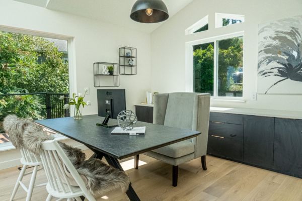 Off the kitchen leads to a beautiful great room, great for a home office with built-in cabinetry and a sitting room all with direct access to the upper deck. This area is a therapeutic space for morning coffee or unwinding from the day as it’s drenched with sun shining through the skylights and walls of windows. All just steps from the lakeshore.
