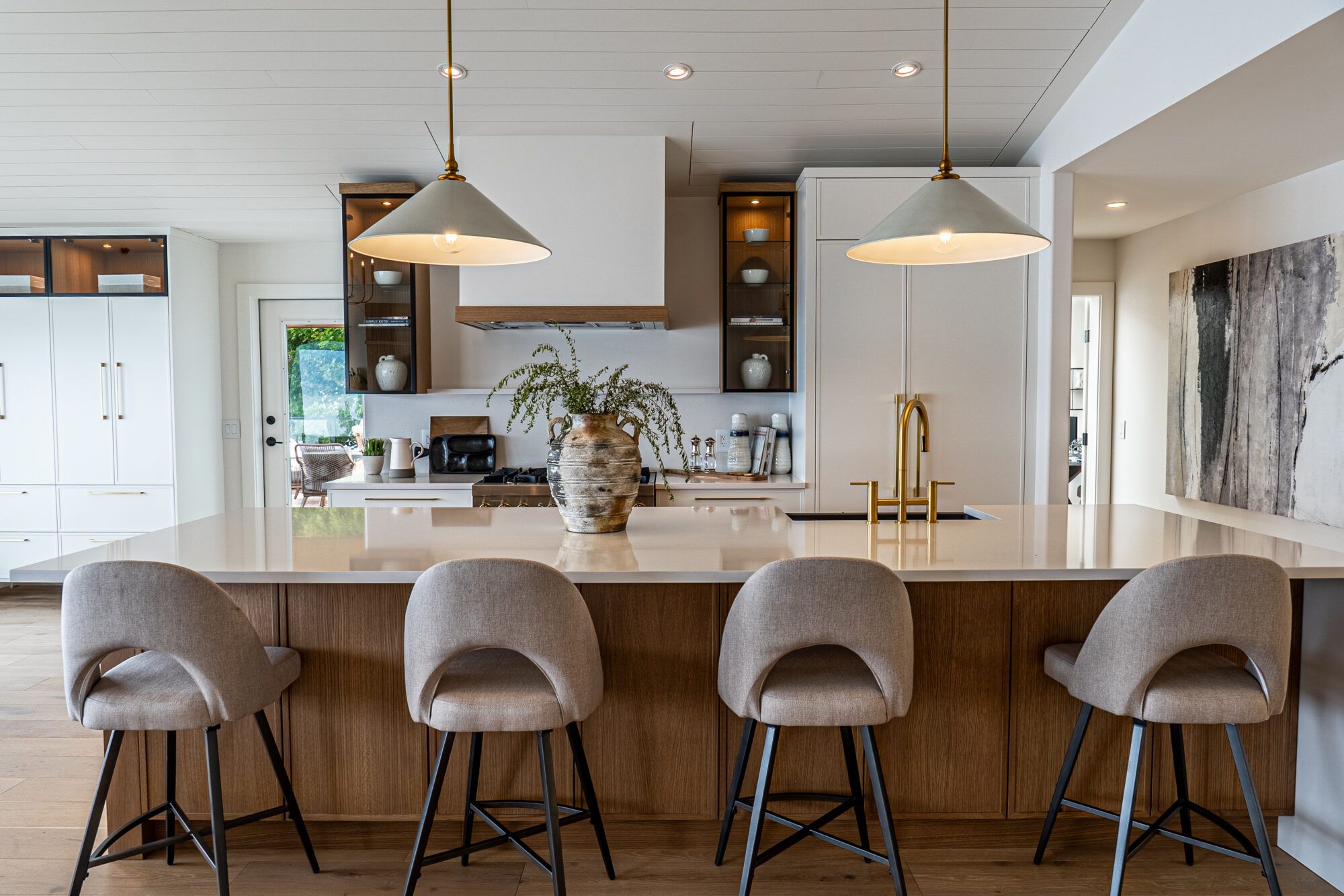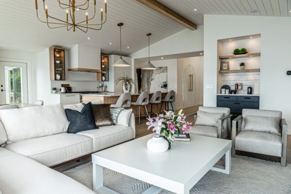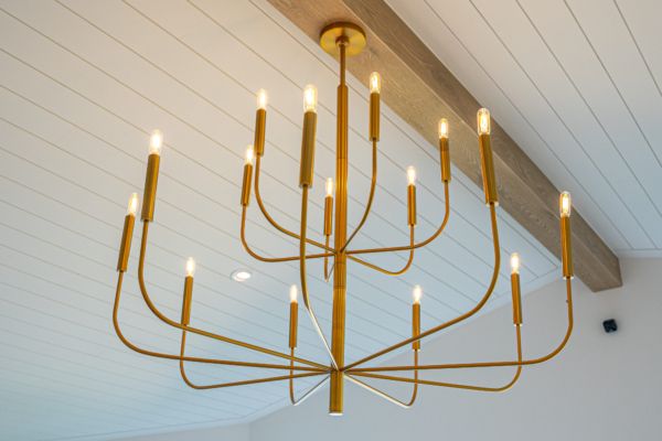 shiplap and wood beam accent highlighting the custom brushed bronze chandelier, a perfect complement for lakeshore living.