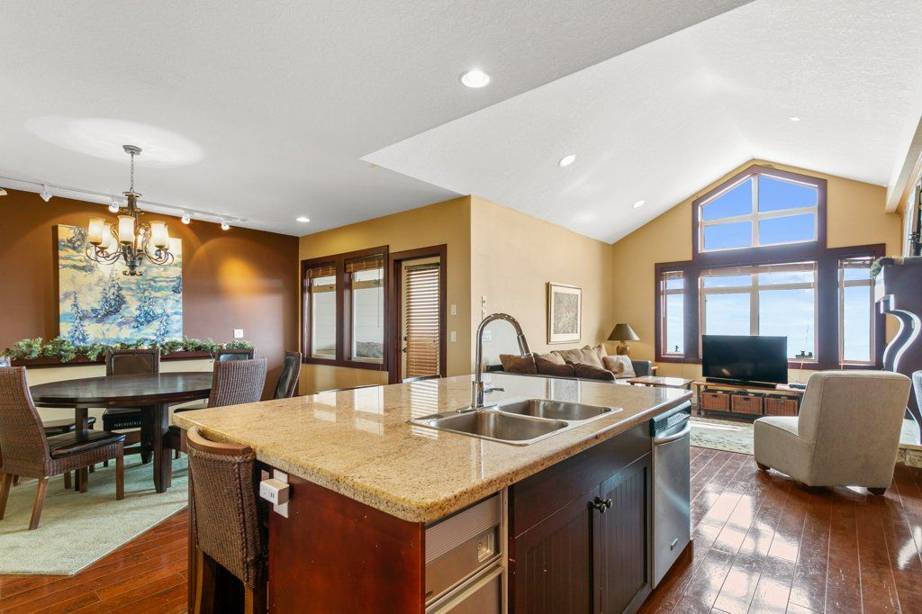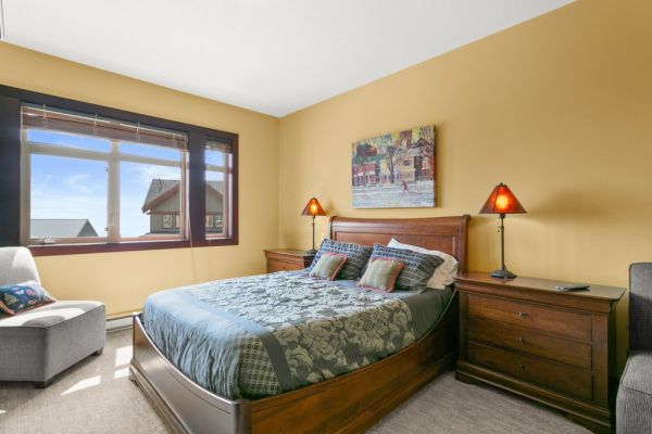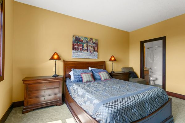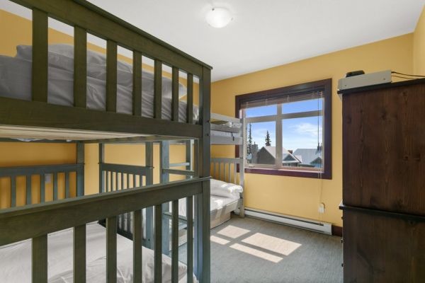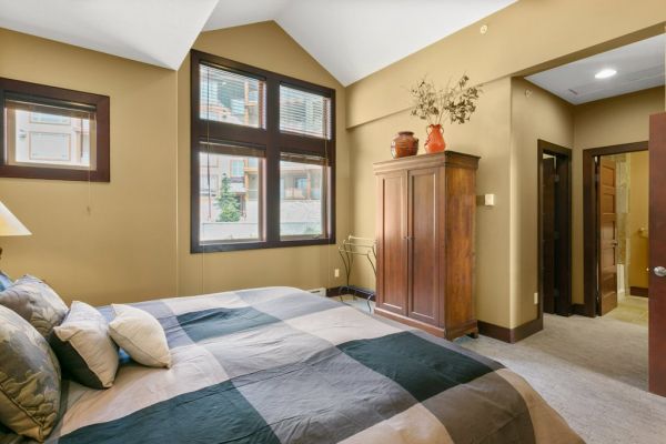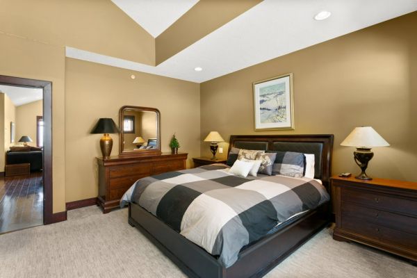 Off the main living area is a full bathroom and a large master bedroom. The master suite features vaulted ceilings, a walk-in closet, and an ensuite with a steam shower. The first level of this beautiful Big white chalet is complete with a second master bedroom with a full ensuite bathroom, a 3rd bedroom with 2 sets of bunk beds, a laundry room, and a 4th full bathroom.